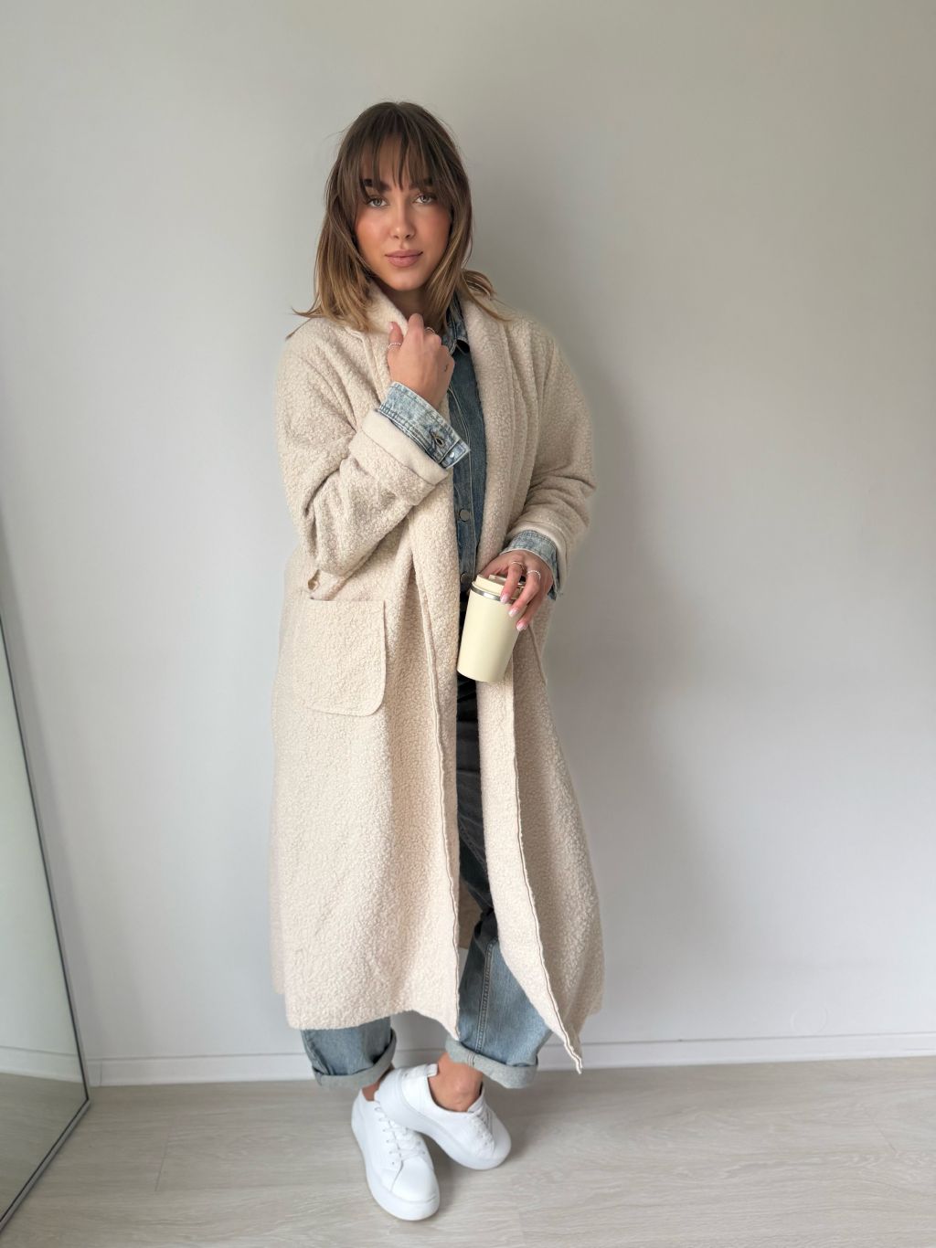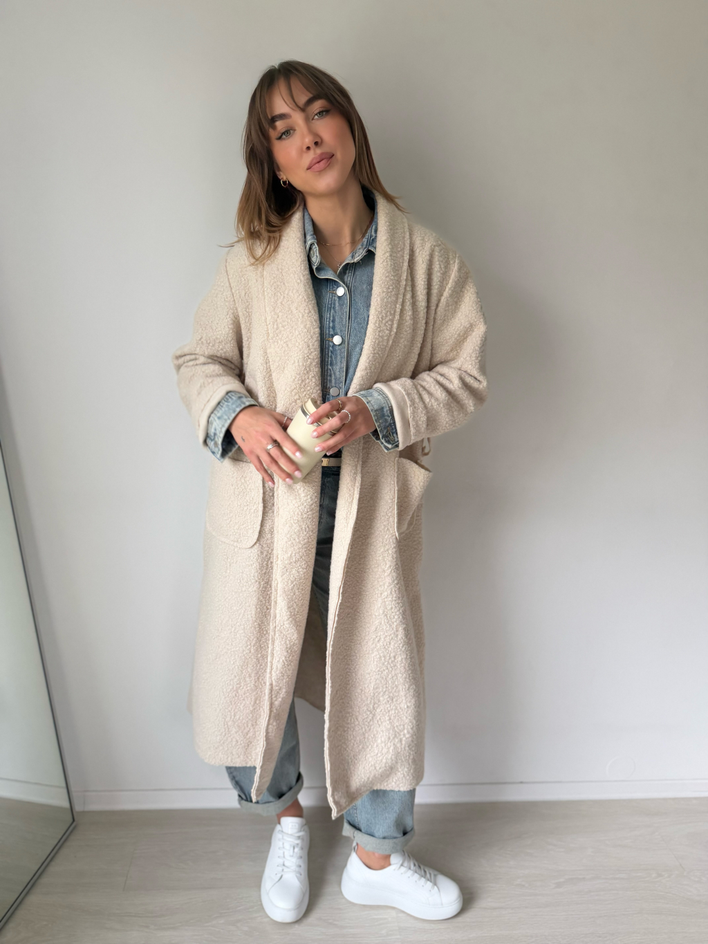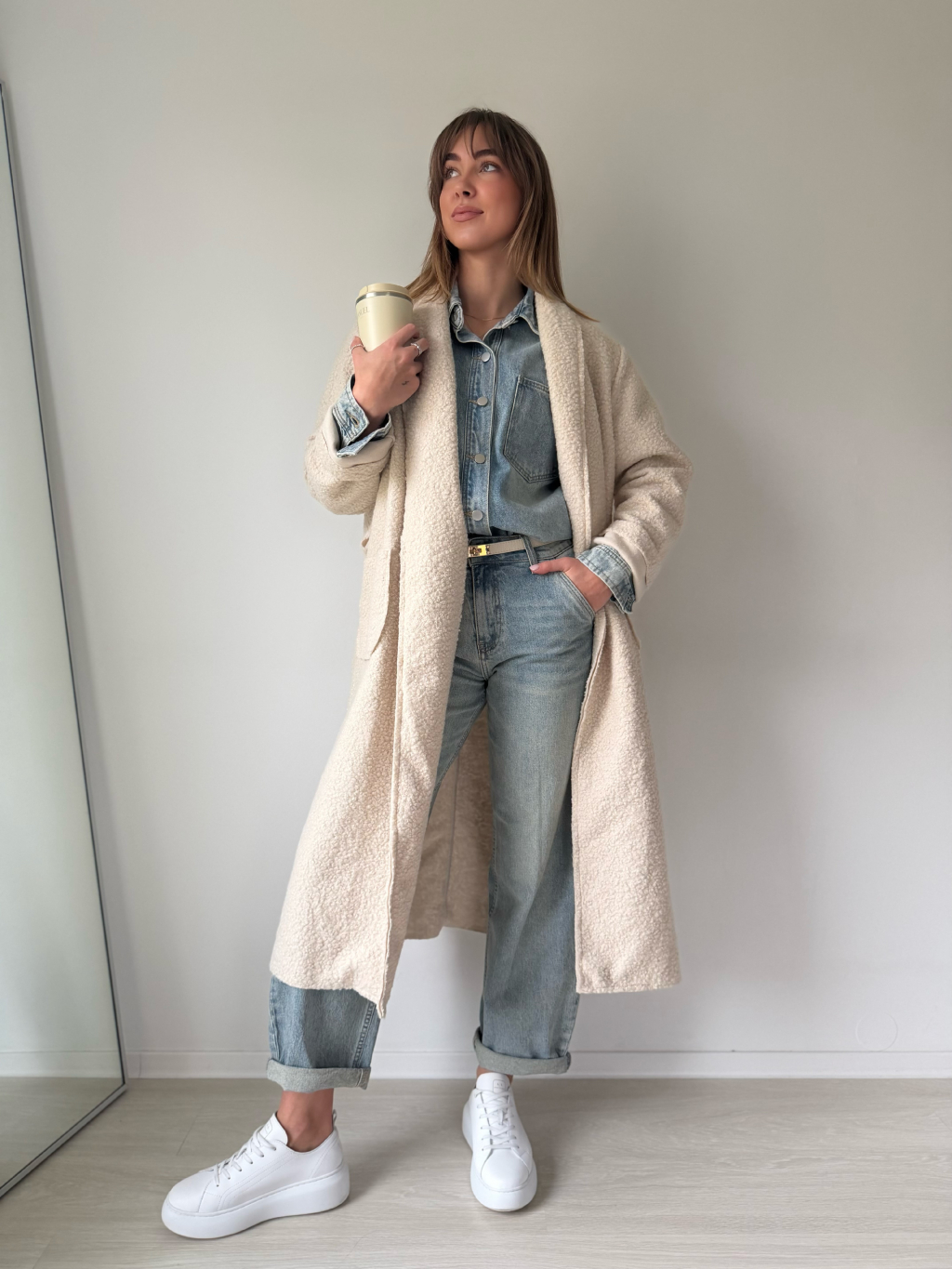 Kabát se zavazováním v pase. Kabát se nezapíná - jednoduše se překříží přes sebe a stáhne páskem v pase. Volnější střih. Dvě kapsy po stranách.