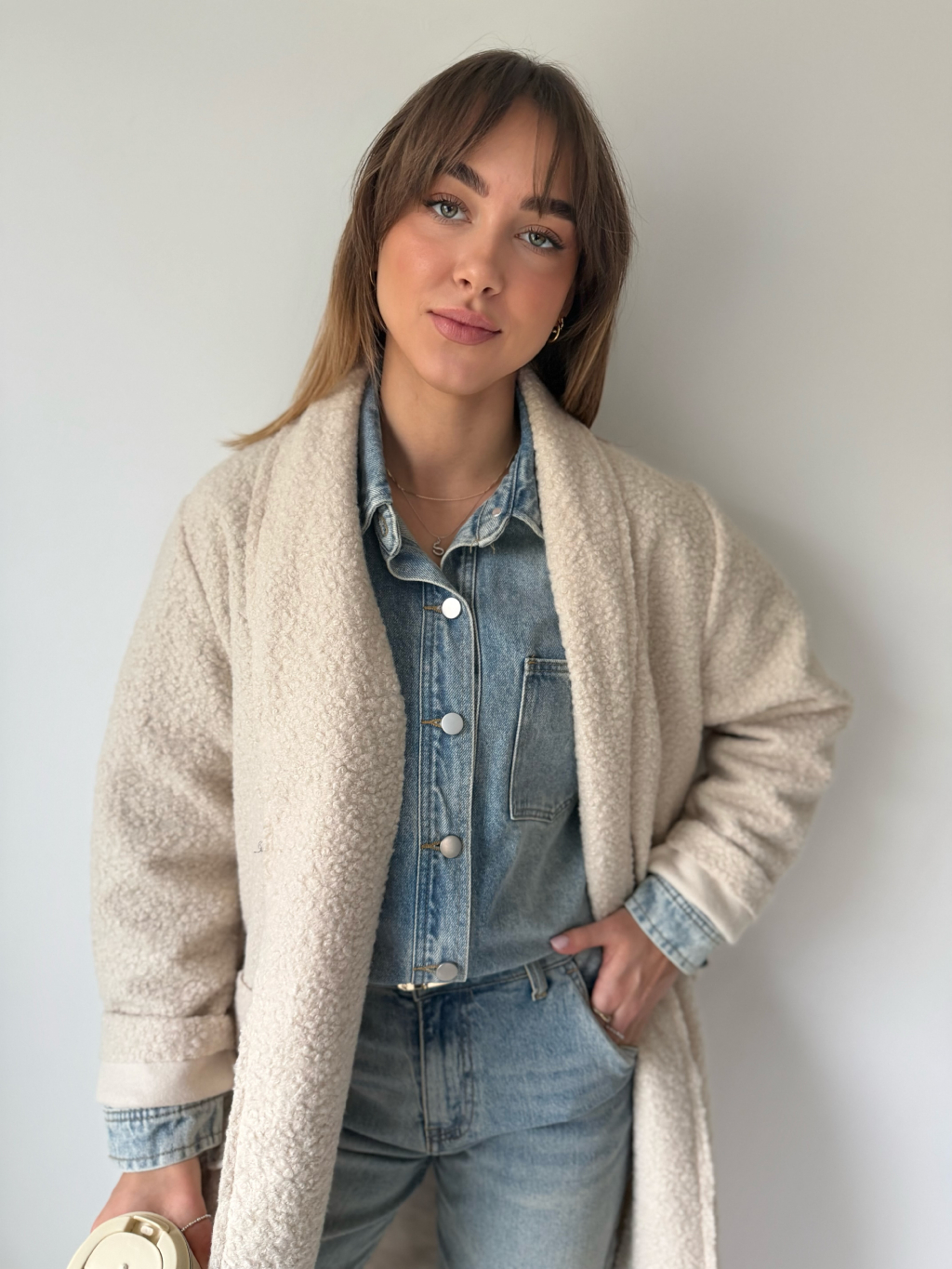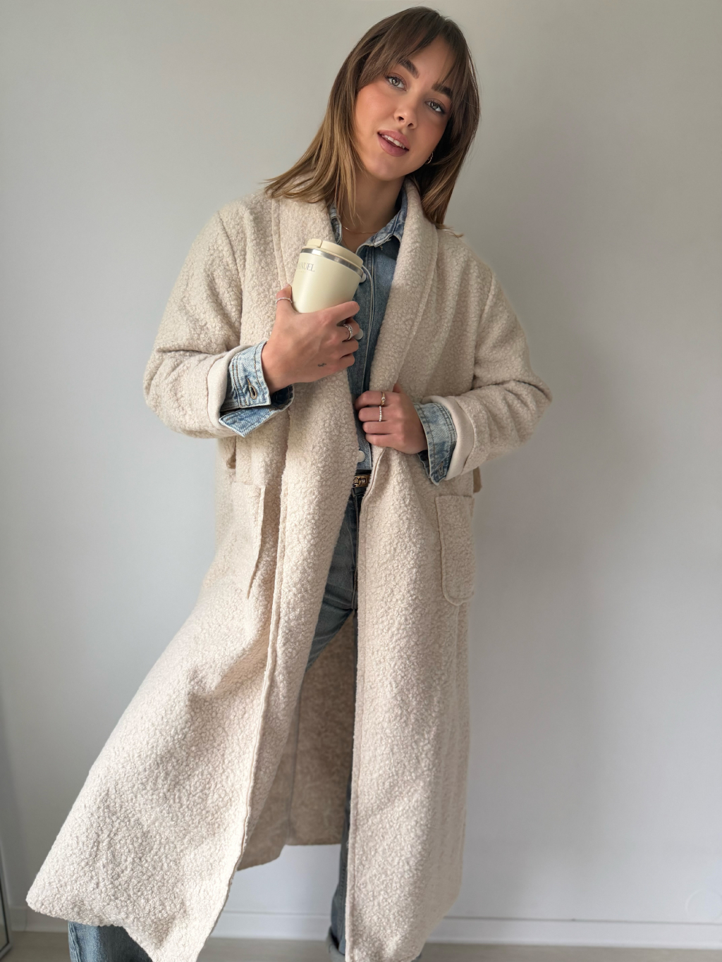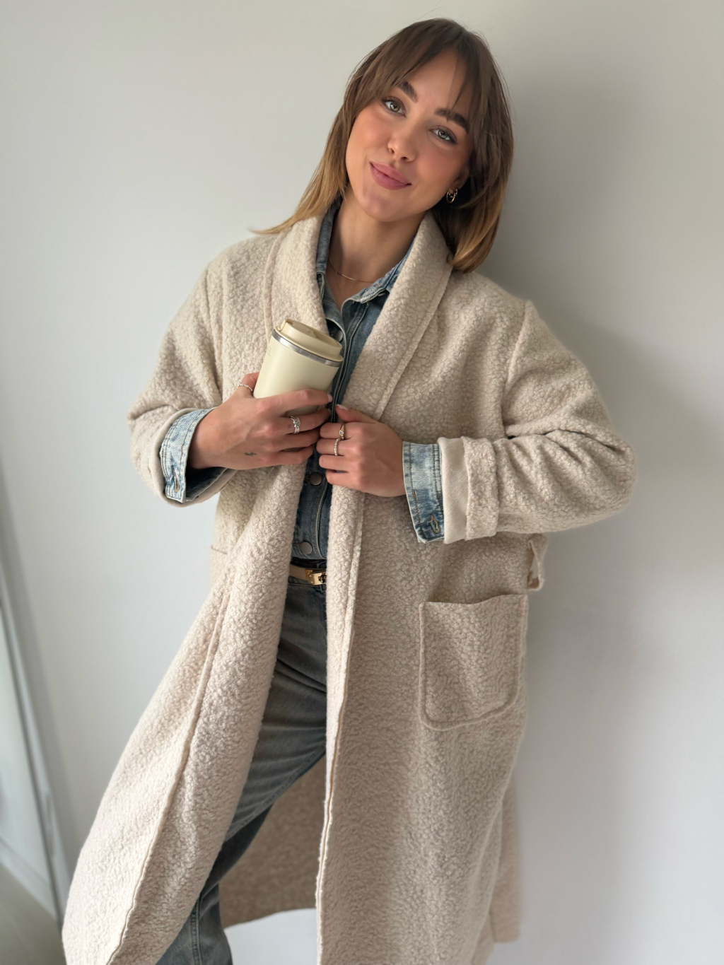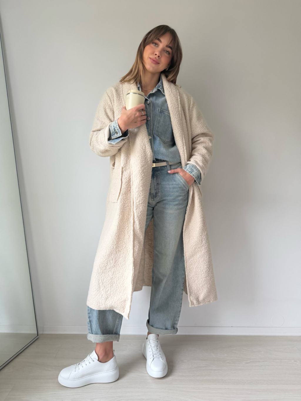 Kabát se zavazováním v pase. Kabát se nezapíná - jednoduše se překříží přes sebe a stáhne páskem v pase. Volnější střih. Dvě kapsy po stranách.
