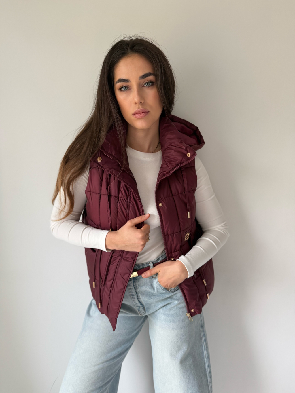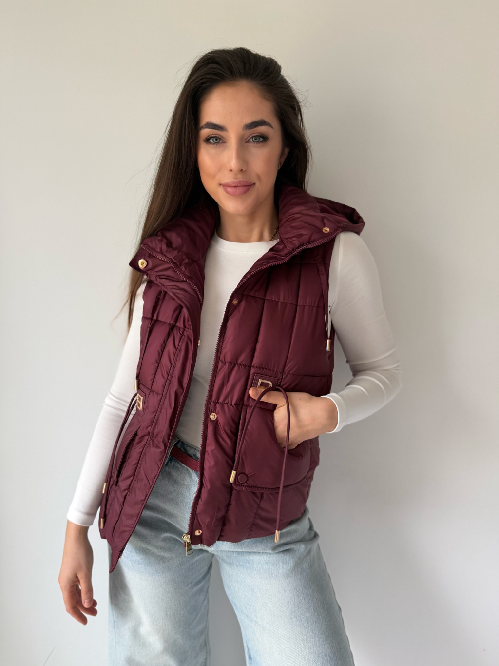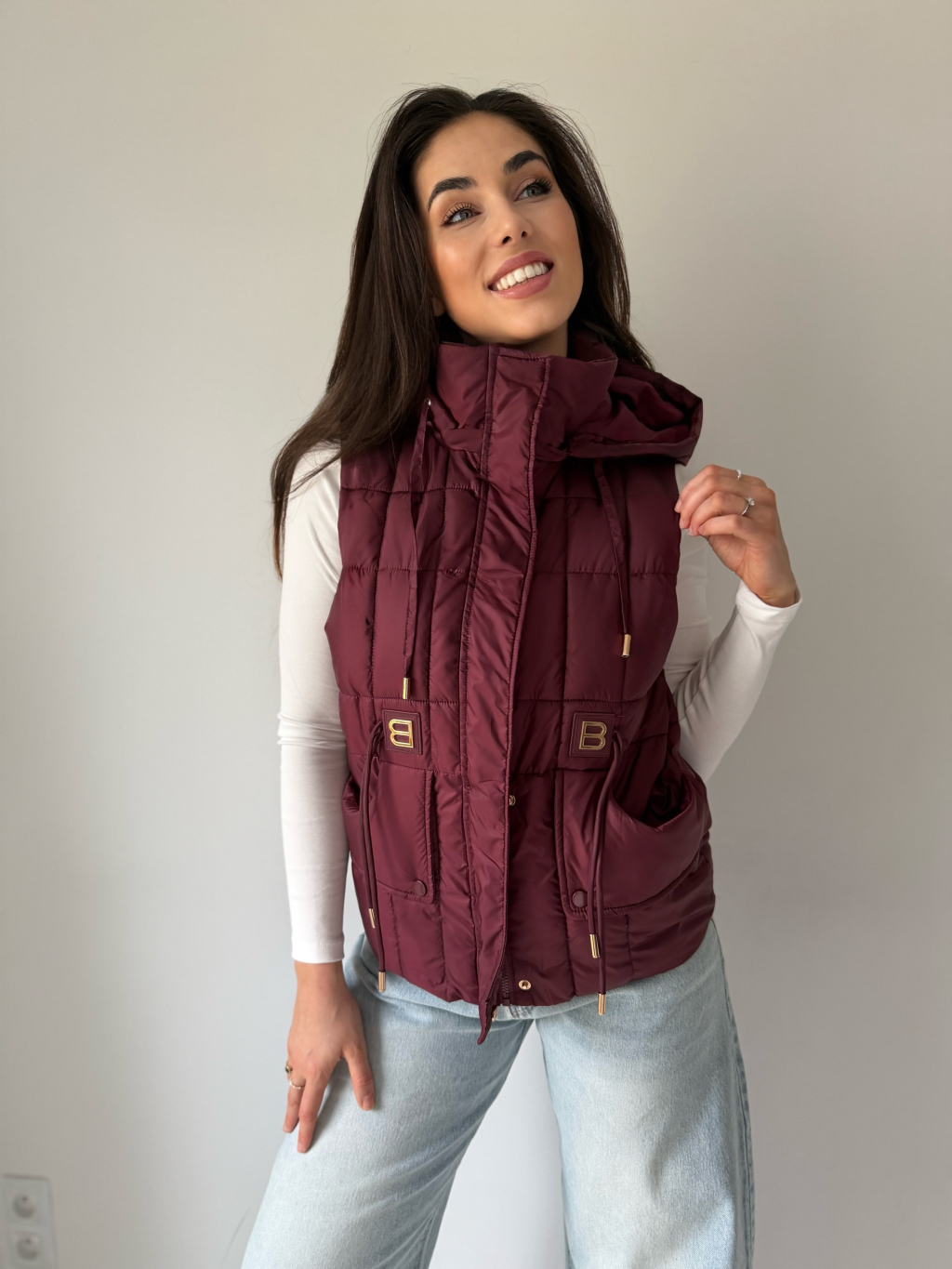 Prošívaná vesta s odepínací kapucí, která se dá stáhnout provázky. Dvě hluboké rovné kapsy. V pase ozdobné provázky. Zapínání na zip.