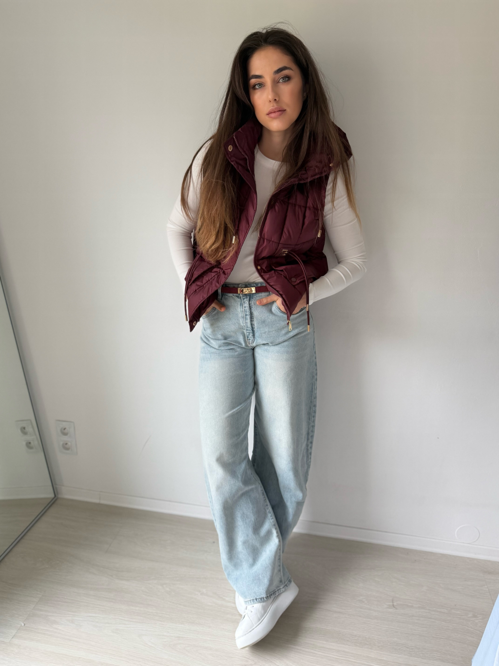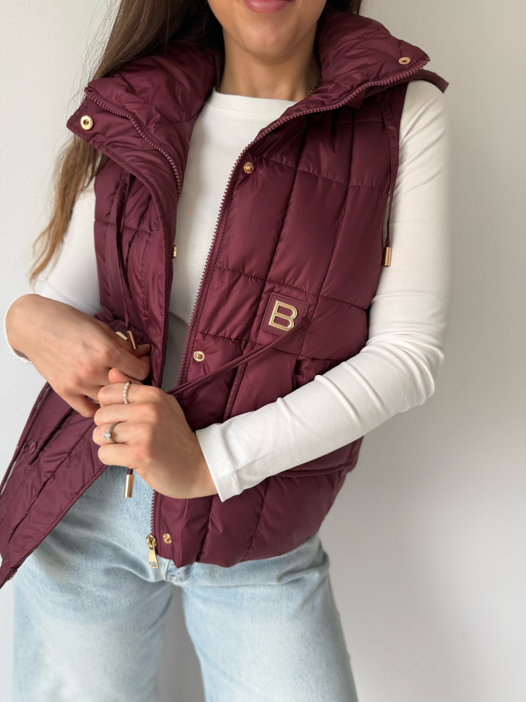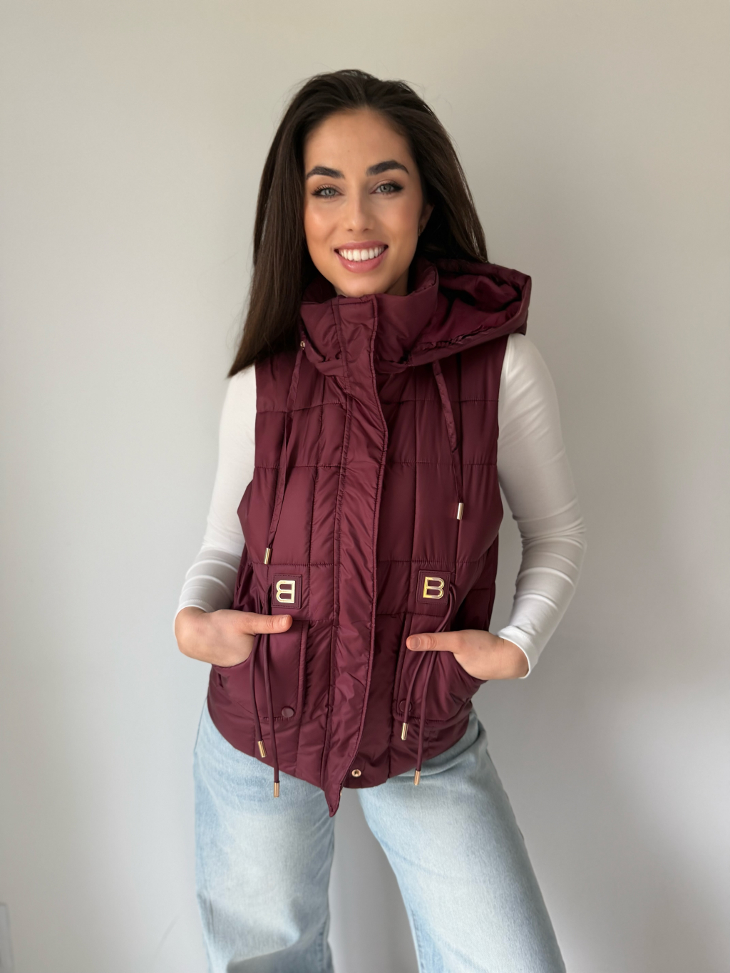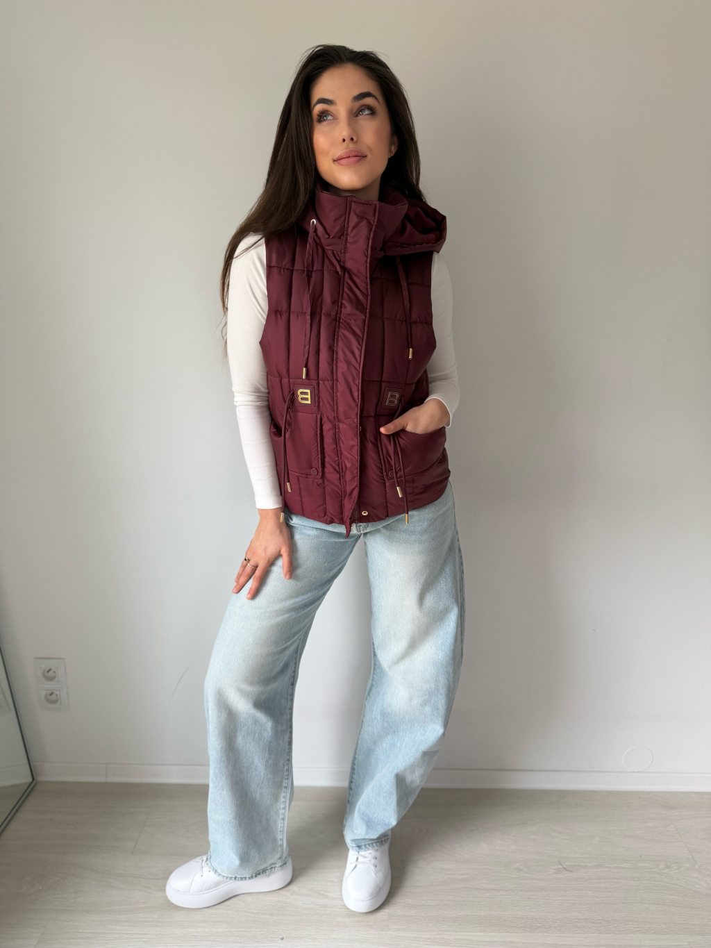 Prošívaná vesta s odepínací kapucí, která se dá stáhnout provázky. Dvě hluboké rovné kapsy. V pase ozdobné provázky. Zapínání na zip.