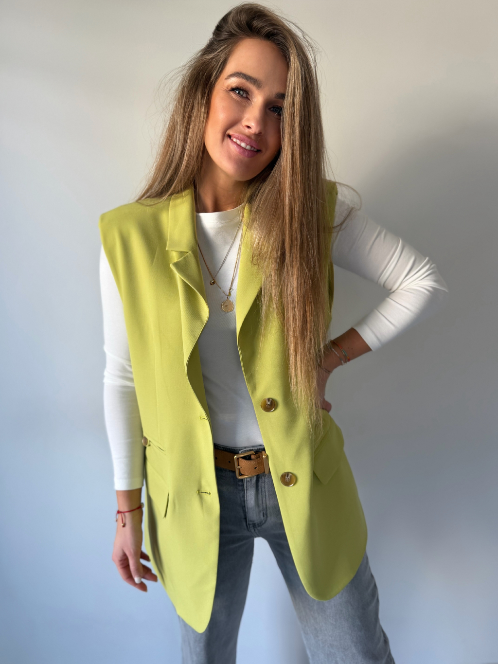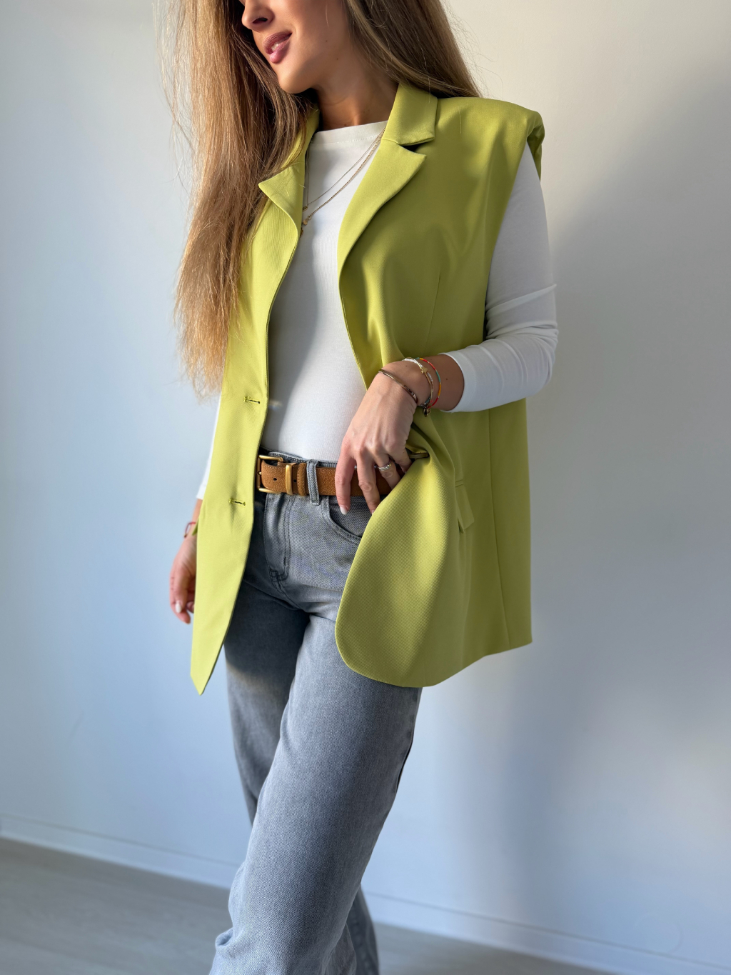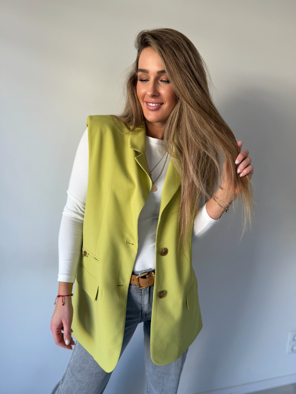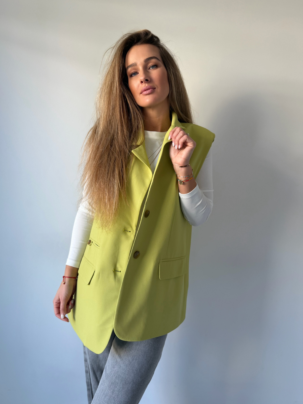 Vesta se zapínáním na knoflíky. Vycpávky na ramenou. Tři falešné kapsy.