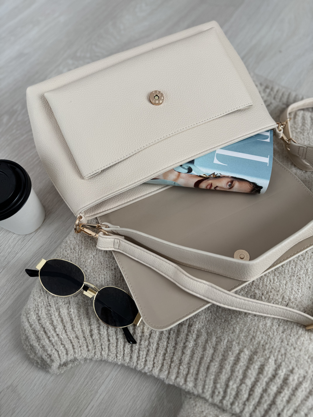 Crossbody kabelka na magnetické zapínání s dvěma vyměnitelnými popruhy - kratším širokým popruhem pro nošení přes rameno a tenkým dlouhým popruhem s možností nastavení délky pro pohodlné crossbody nošení. Vnitřní prostor kabelky tvoří jedna hlavní kapsa, která je rozdělena praktickou kapsou na zip a menší kapsa na drobnosti.