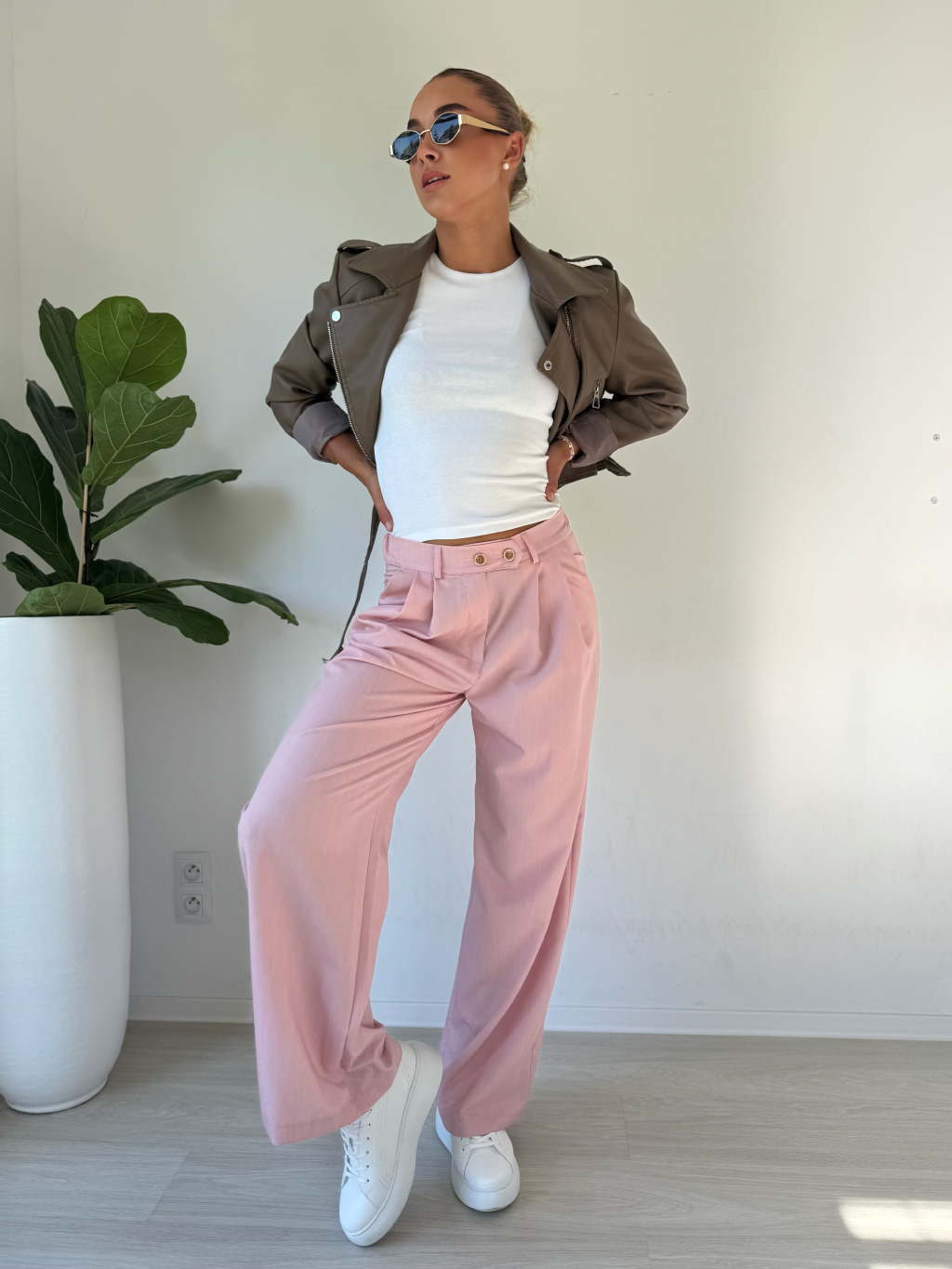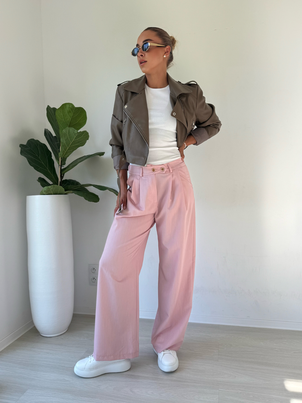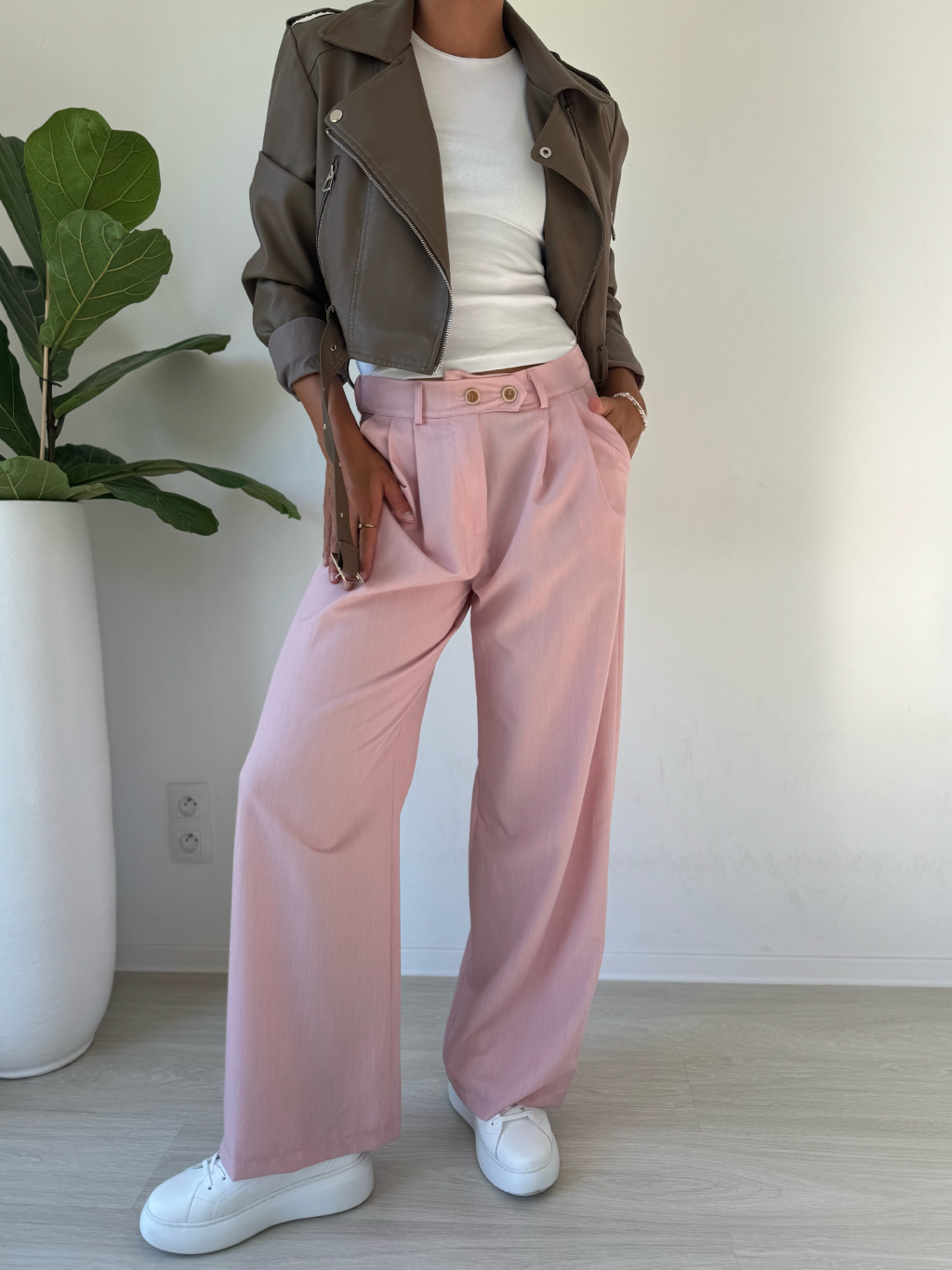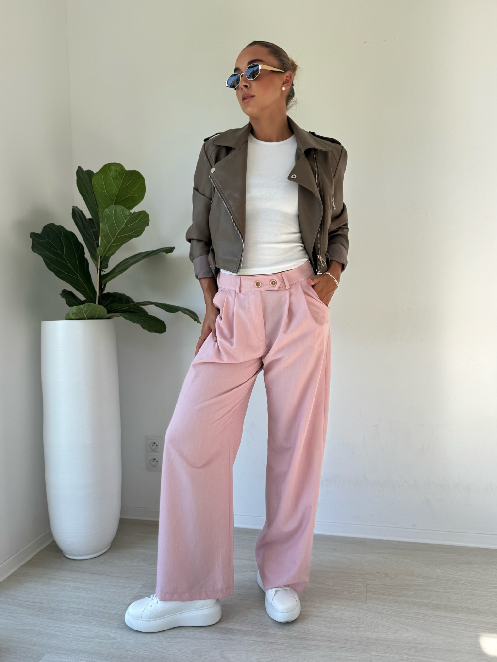 Kalhoty mají trendy, volný střih. Zapínání na knoflíčky a zip, po stranách jsou kapsy.