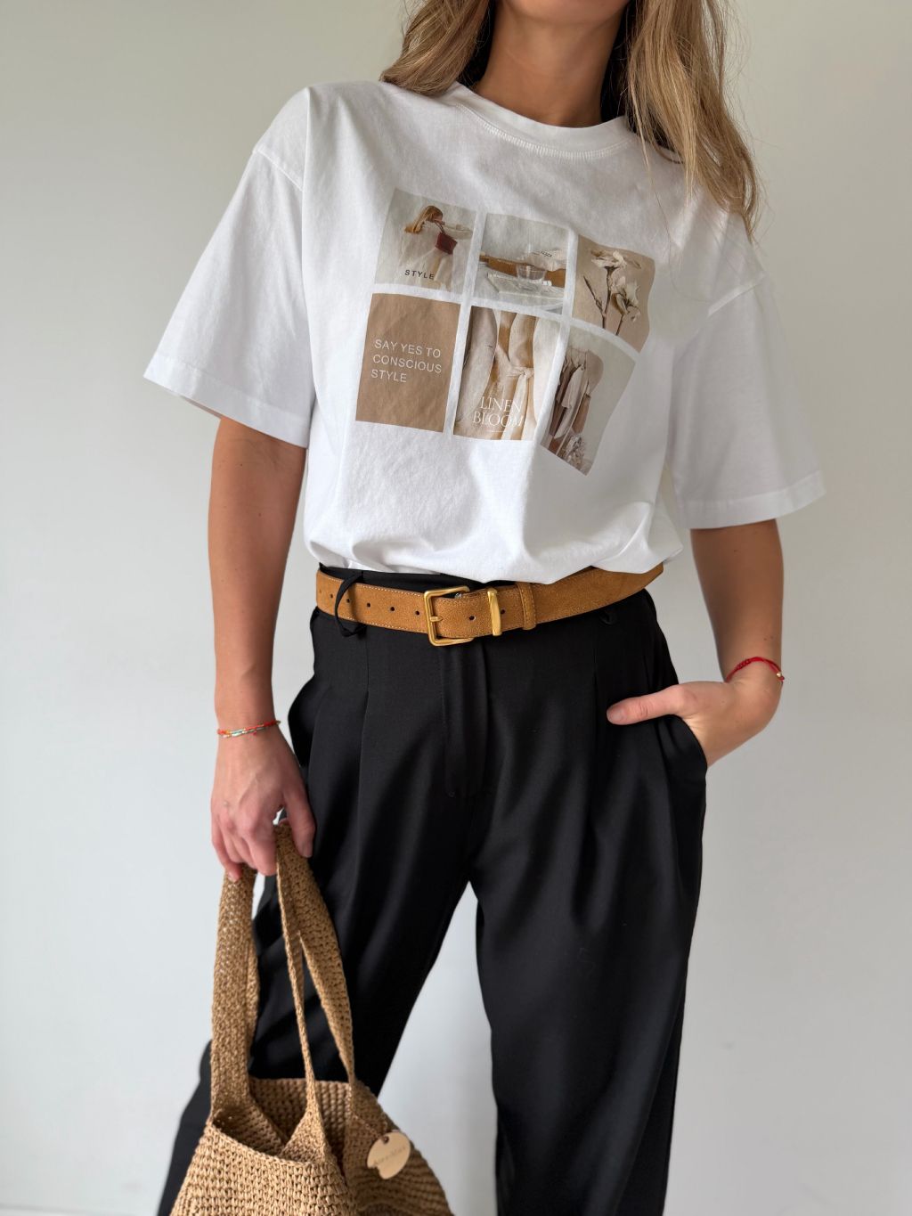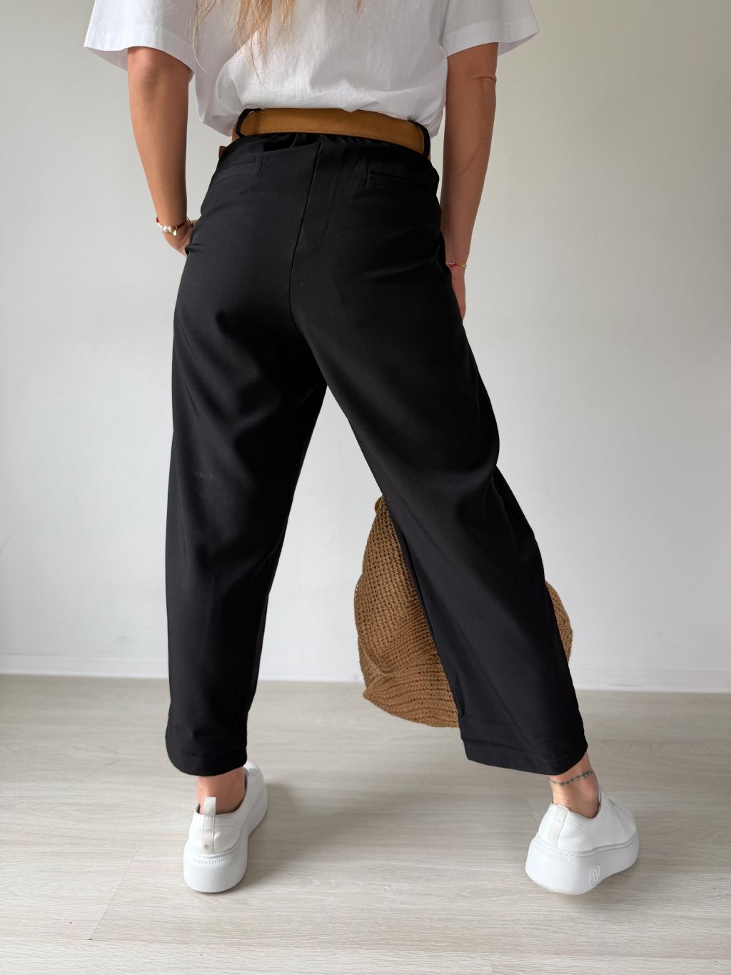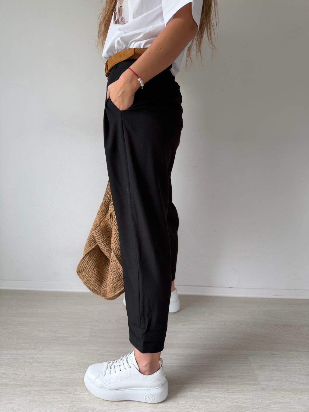 Kalhoty mají trendy, volný střih. Zapínání na knoflíčky a zip, po stranách jsou kapsy, v zadní části na gumu.