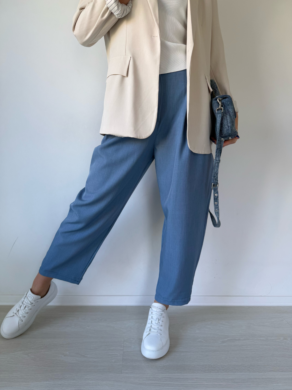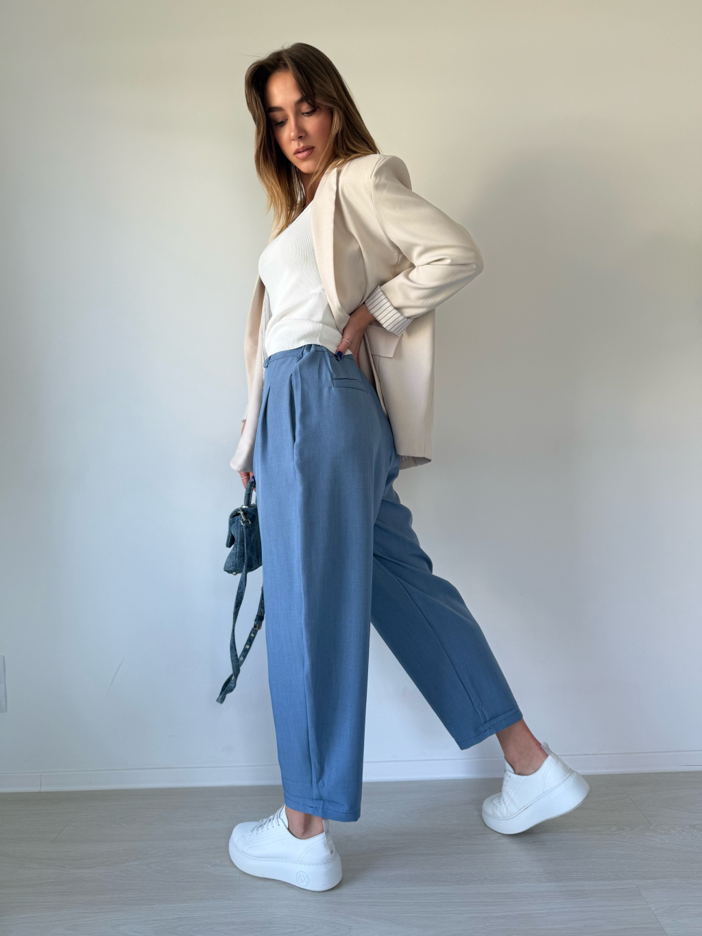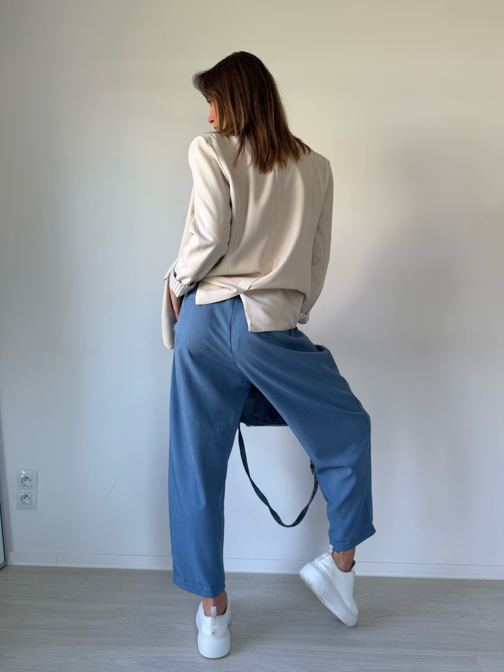 Kalhoty mají trendy, volný střih. Zapínání na knoflíčky a zip, po stranách jsou kapsy, v zadní části na gumu.