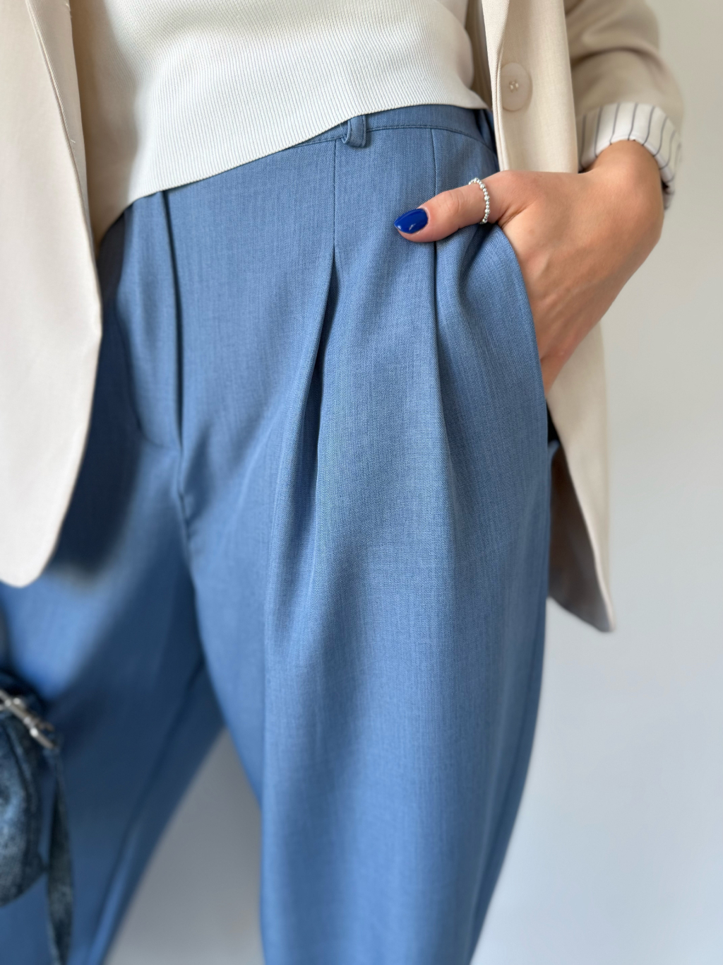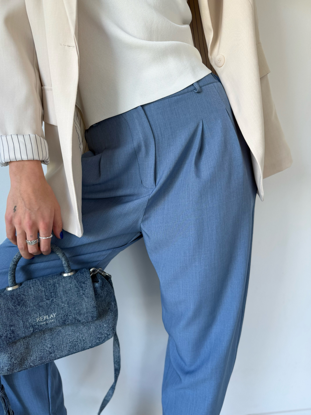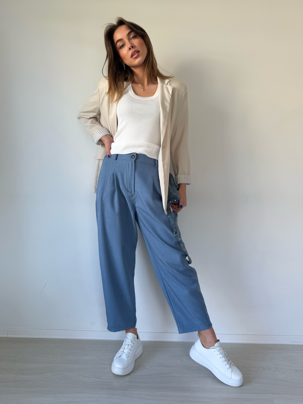 Kalhoty mají trendy, volný střih. Zapínání na knoflíčky a zip, po stranách jsou kapsy, v zadní části na gumu.