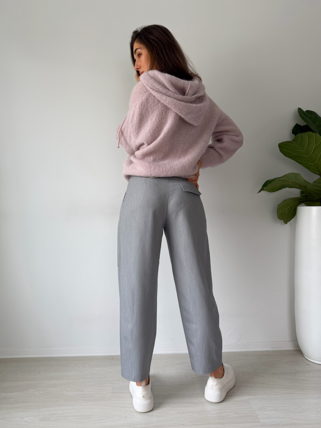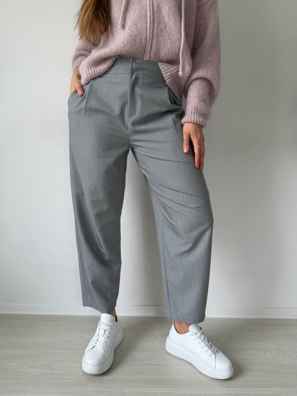 Stylové a pohodlné kalhoty v šedé barvě. Přes stehna mají širší střih a dole jsou úzké. Zapínání na háček a knoflík. V pase mají poutka. Kalhoty nepruží. Dvě praktické kapsy. Vzadu jedna falešná kapsa.