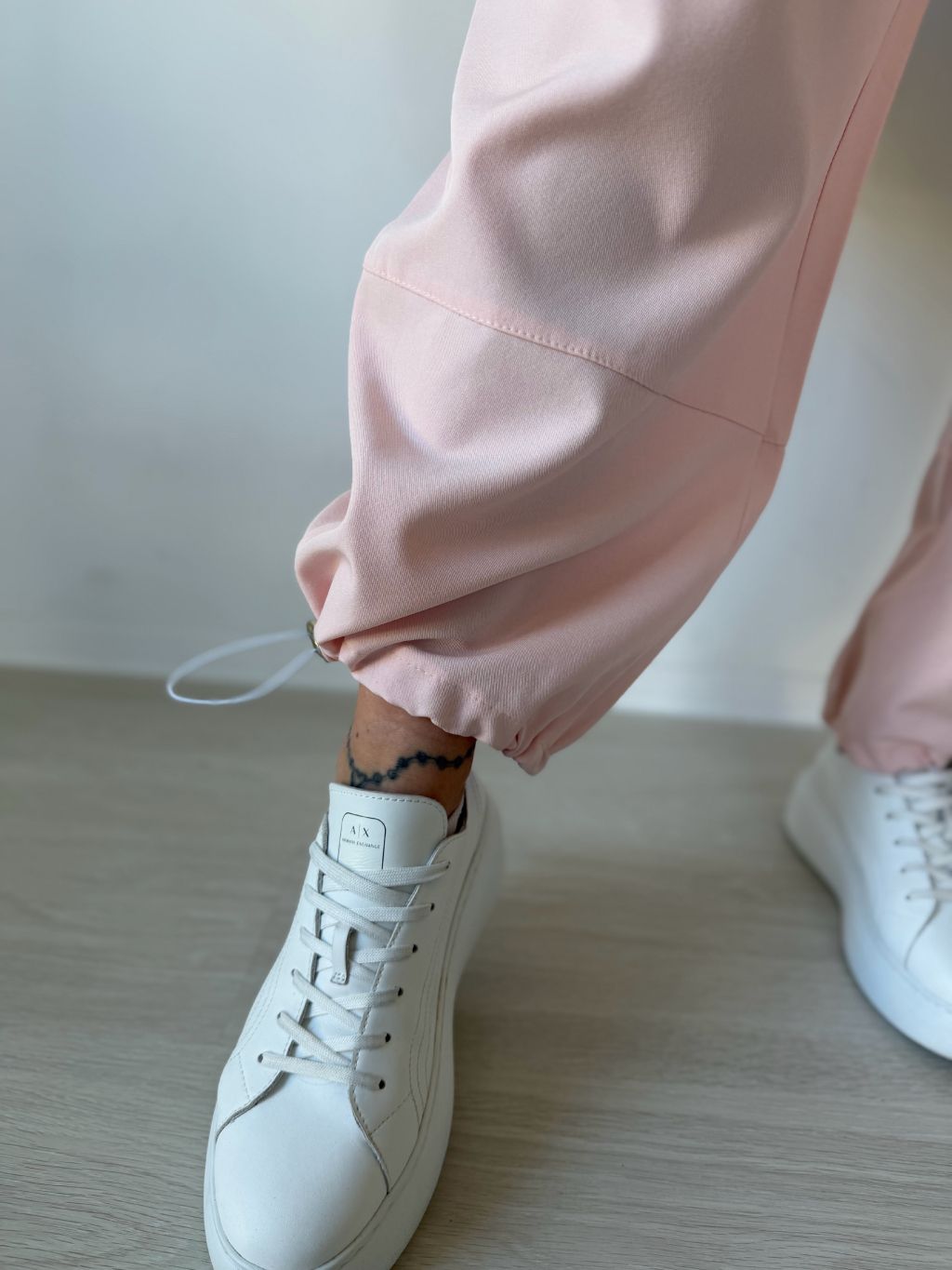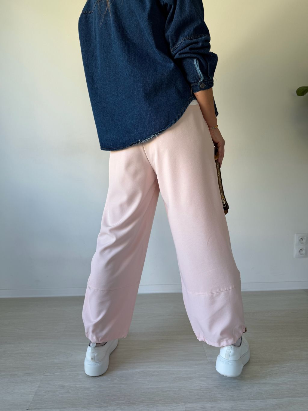 Kalhoty s gumou v pase. Dvě kapsy. U kotníků stahování. Přes lýtka prošití.
