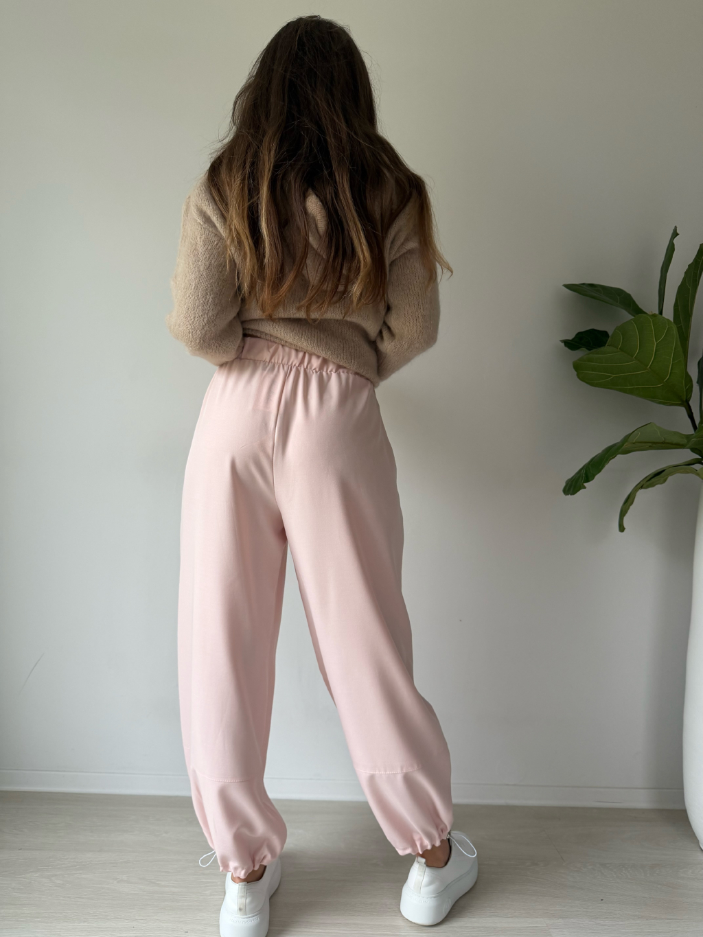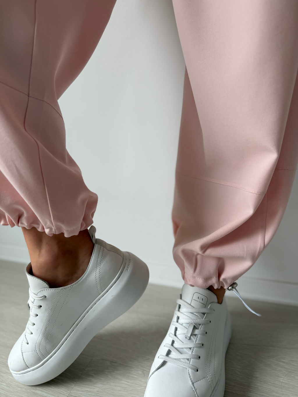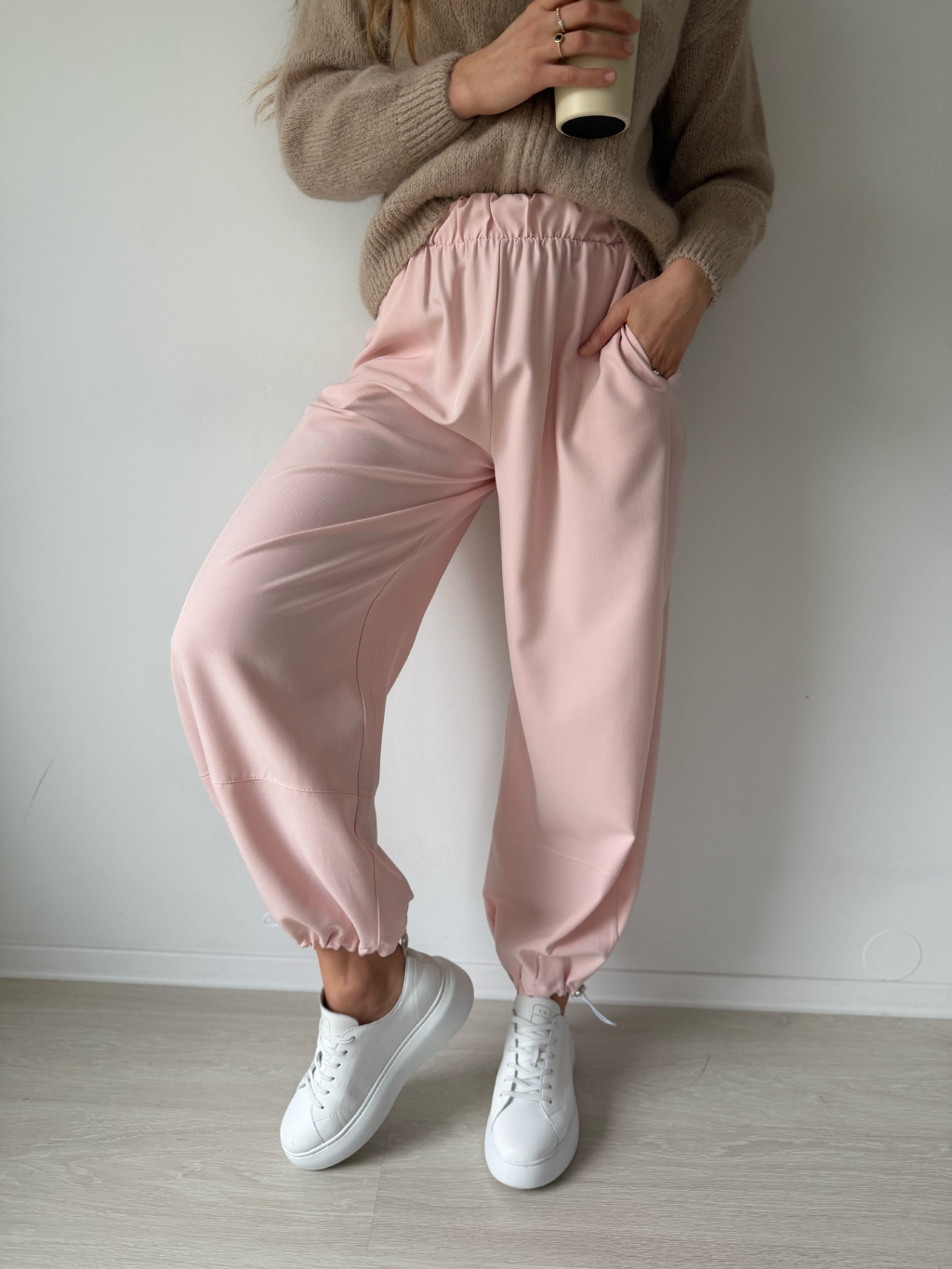 Kalhoty s gumou v pase. Dvě kapsy. U kotníků stahování. Přes lýtka prošití.