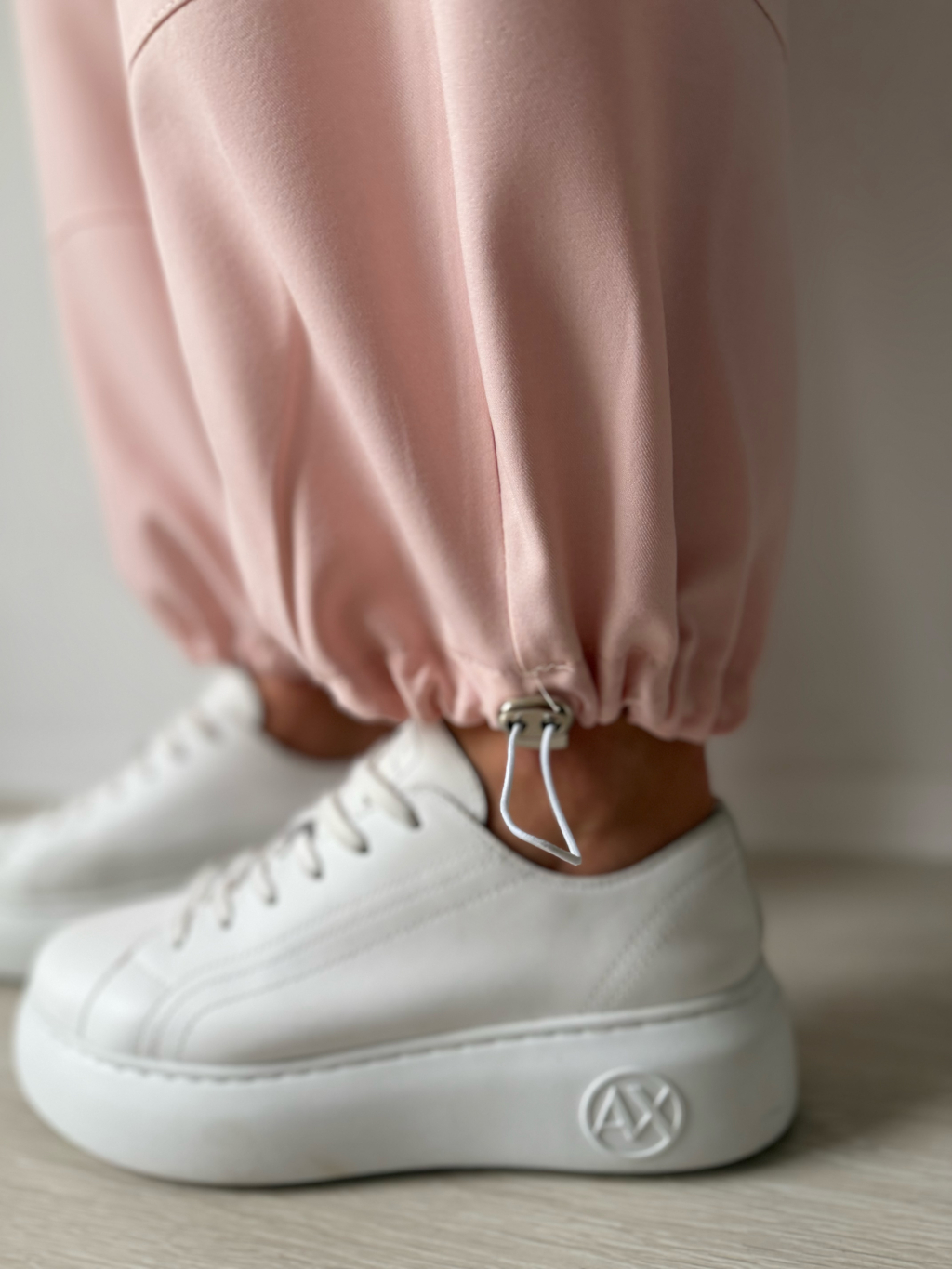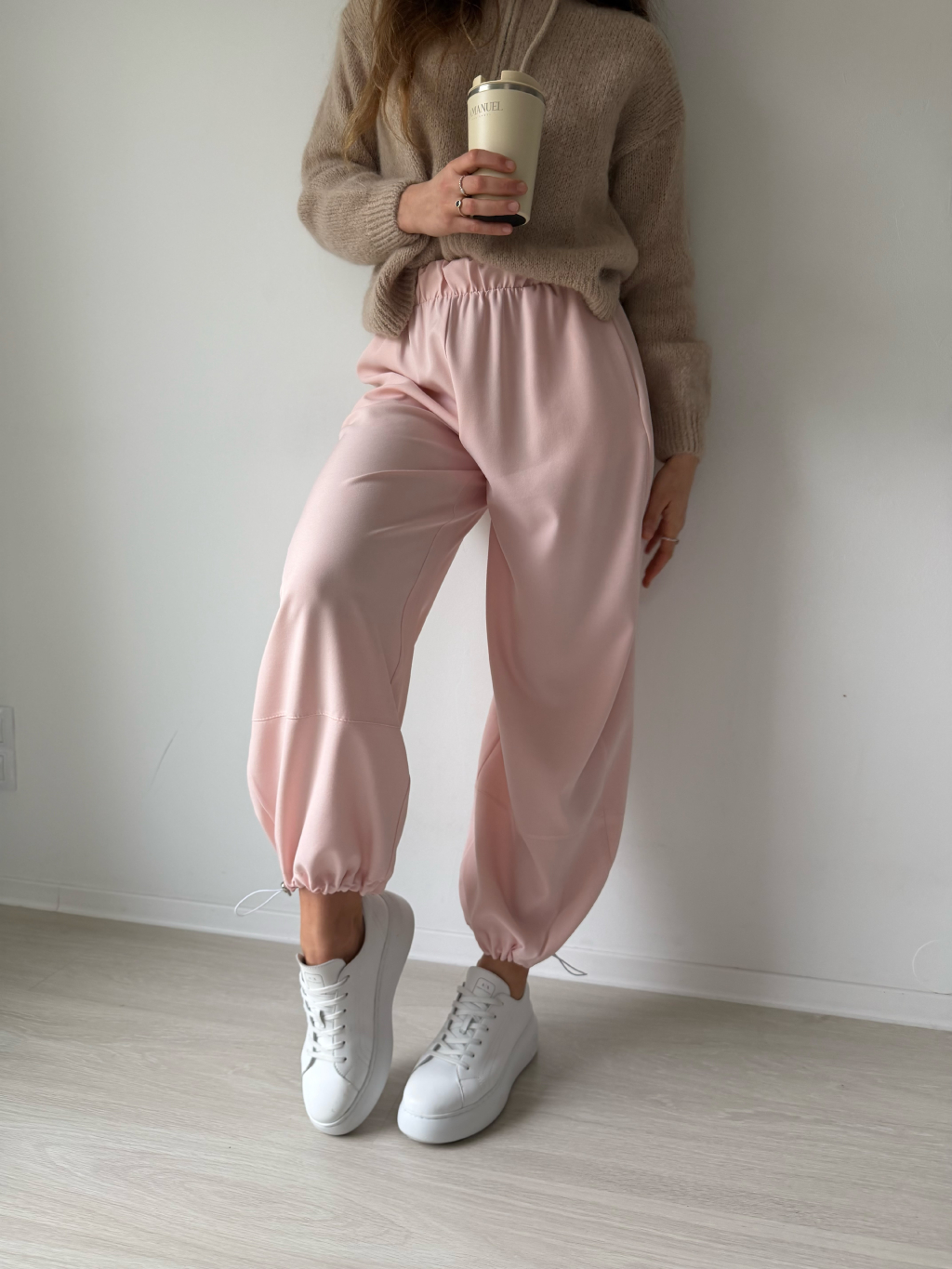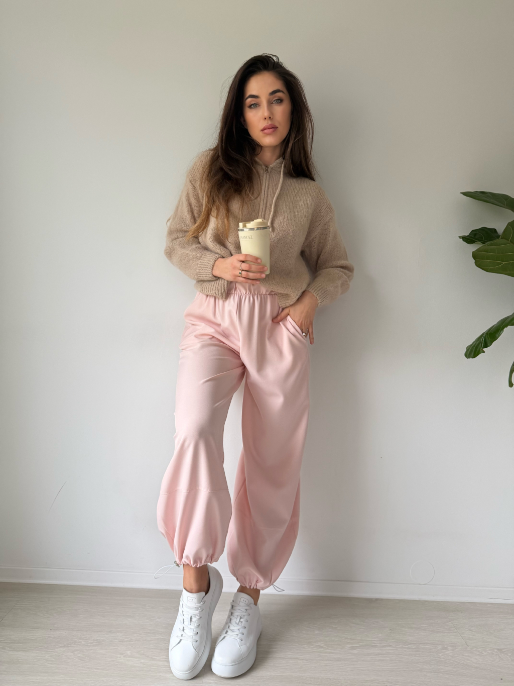 Kalhoty s gumou v pase. Dvě kapsy. U kotníků stahování. Přes lýtka prošití.