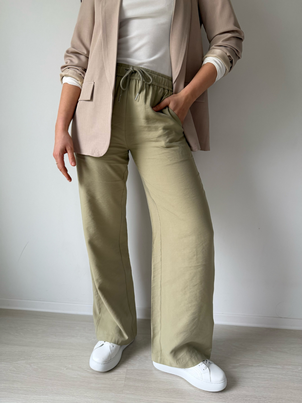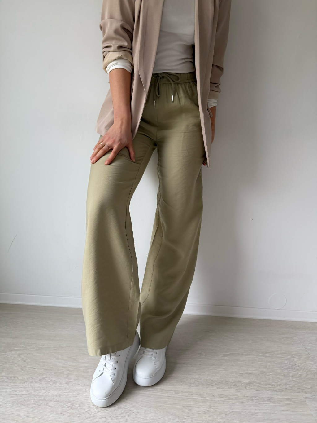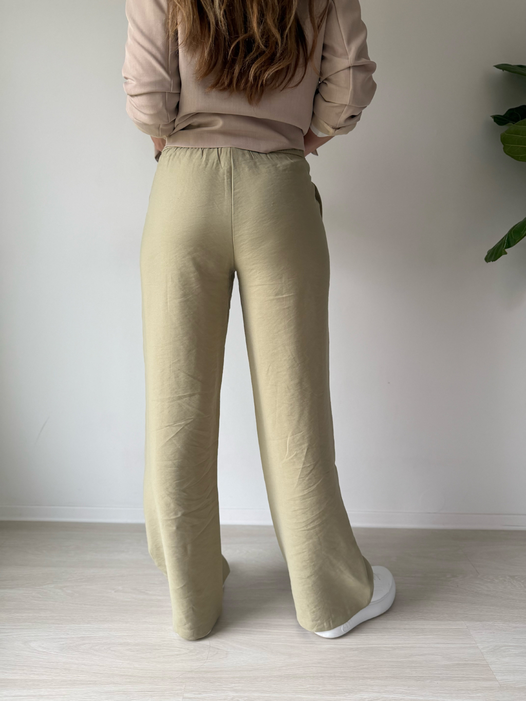 Kalhoty jsou volné rovného střihu. V pase na gumu, která se dá stáhnout šňůrkou. Dvě kapsy.