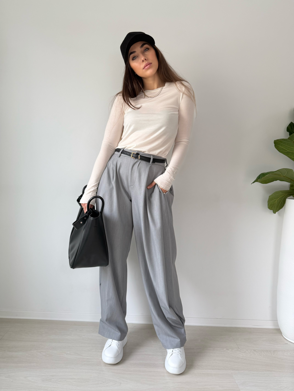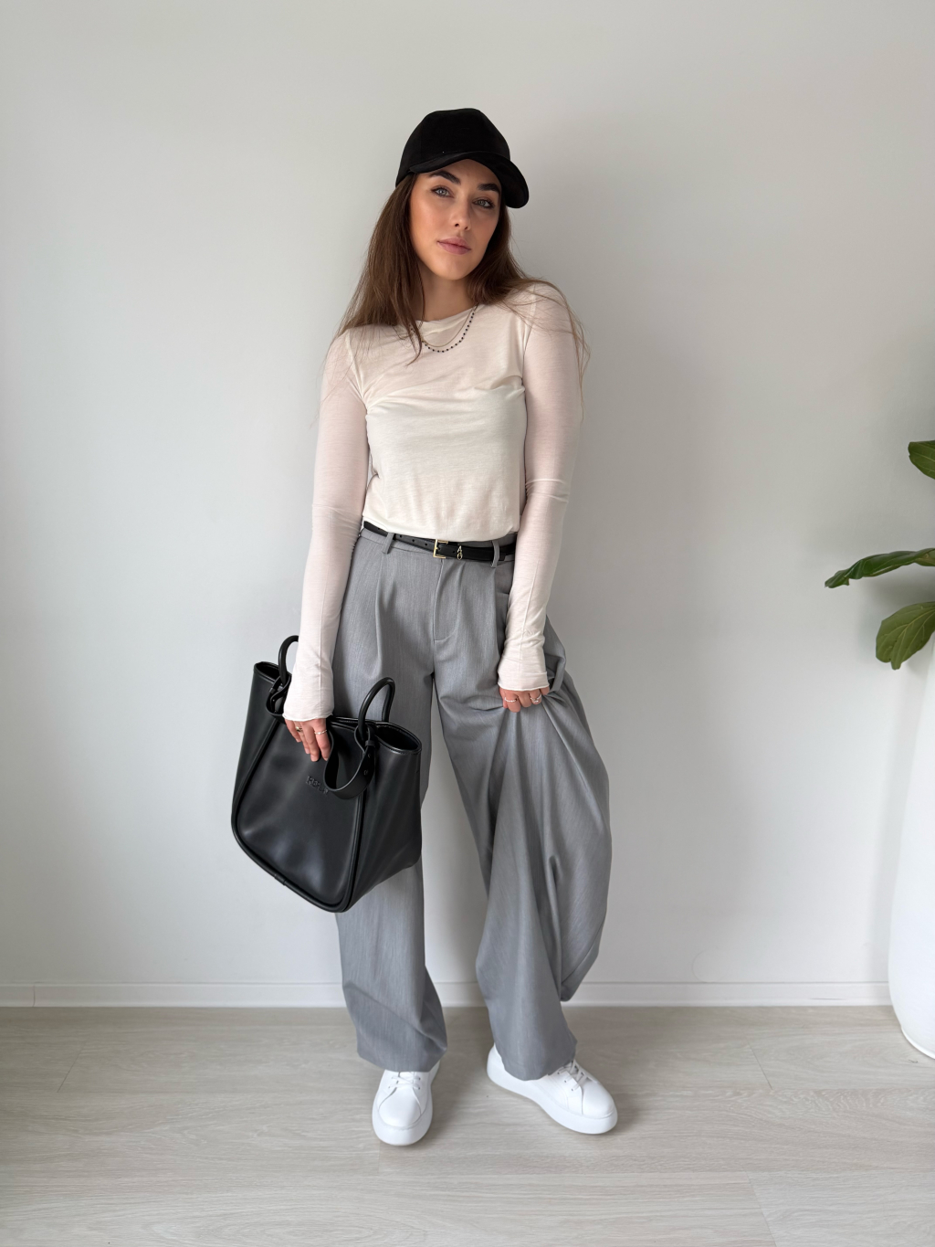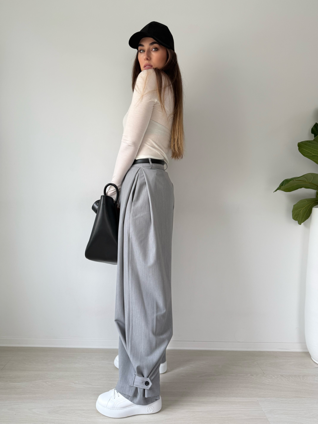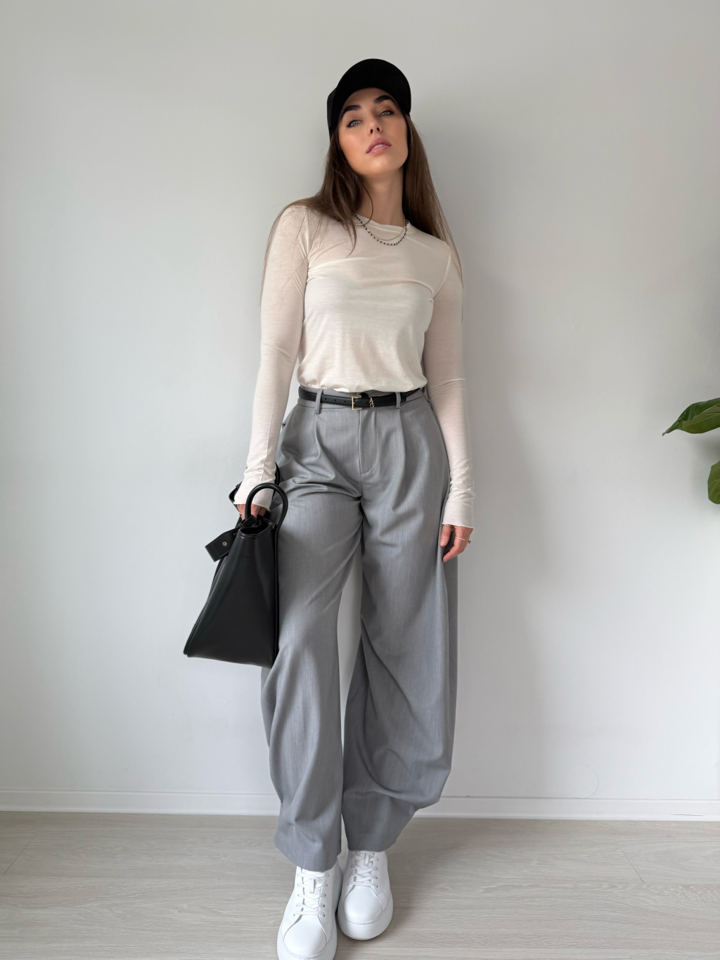 Kalhoty jsou lehké, volné a široké. V pase nepruží. Zapínání na knoflík. Dole lze zapnout na nohavici knoflík a tím změnit styl střihu. Dvě praktické kapsy po stranách a vzadu jedna kapsa falešná.