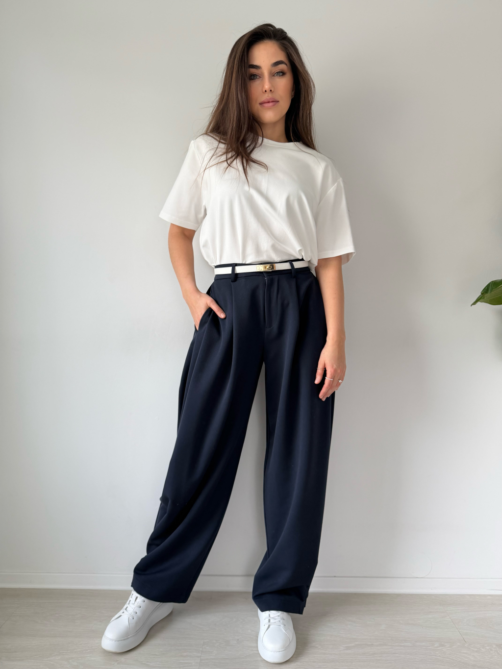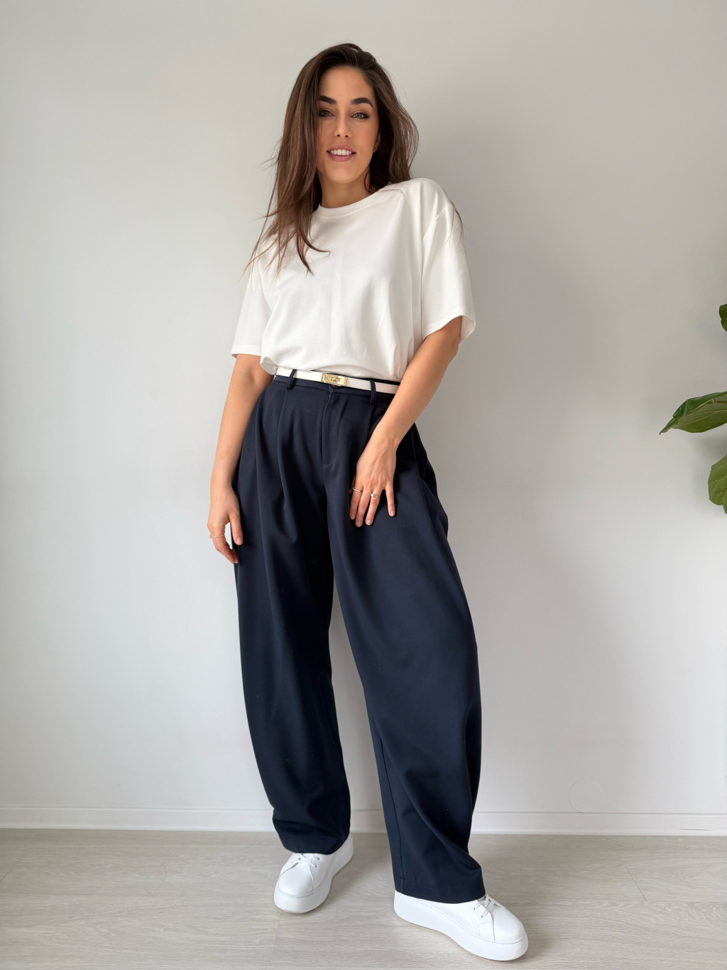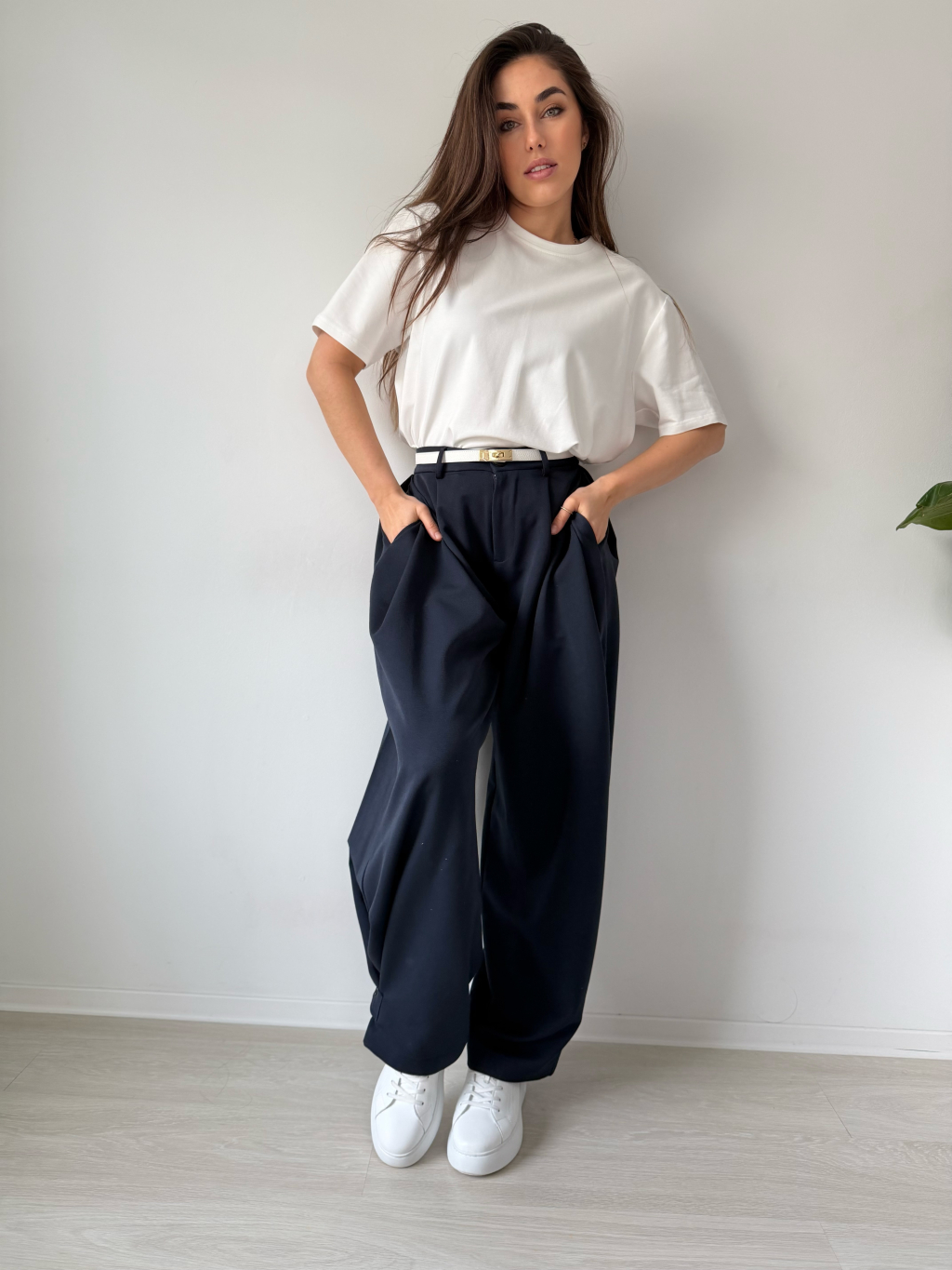 Kalhoty jsou lehké, volné a široké. V pase nepruží. Zapínání na knoflík. Dole lze zapnout na nohavici knoflík a tím změnit styl střihu. Dvě praktické kapsy po stranách a vzadu jedna kapsa falešná.