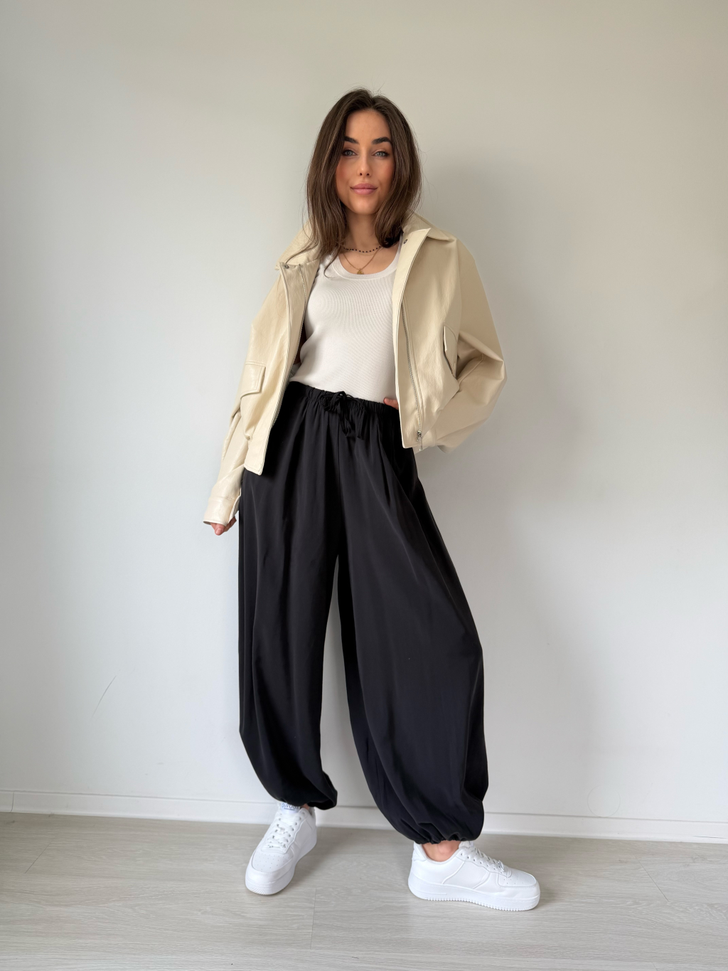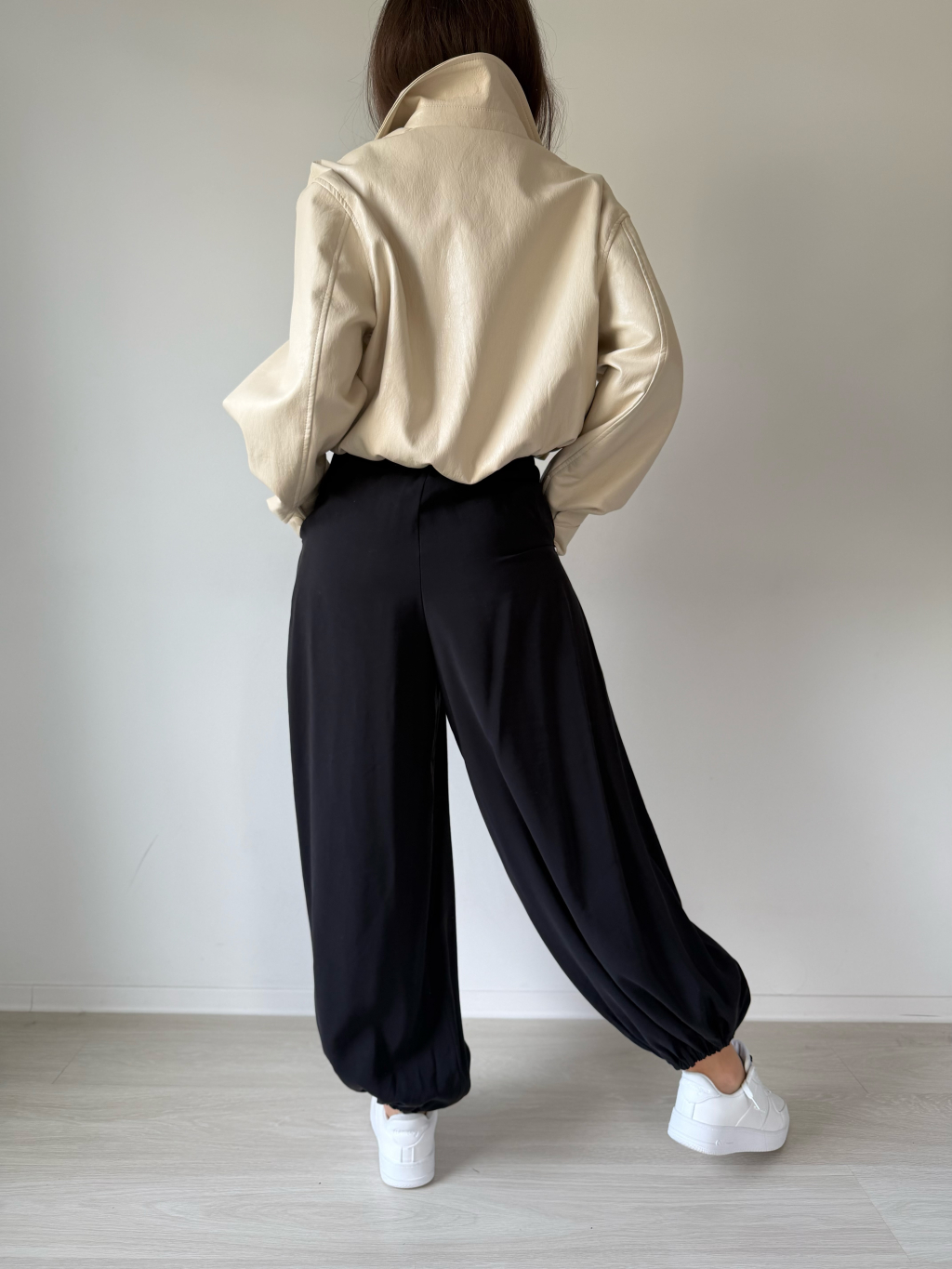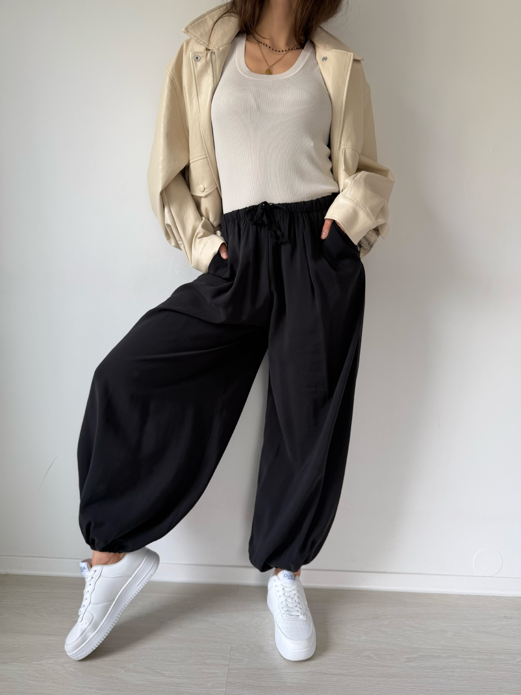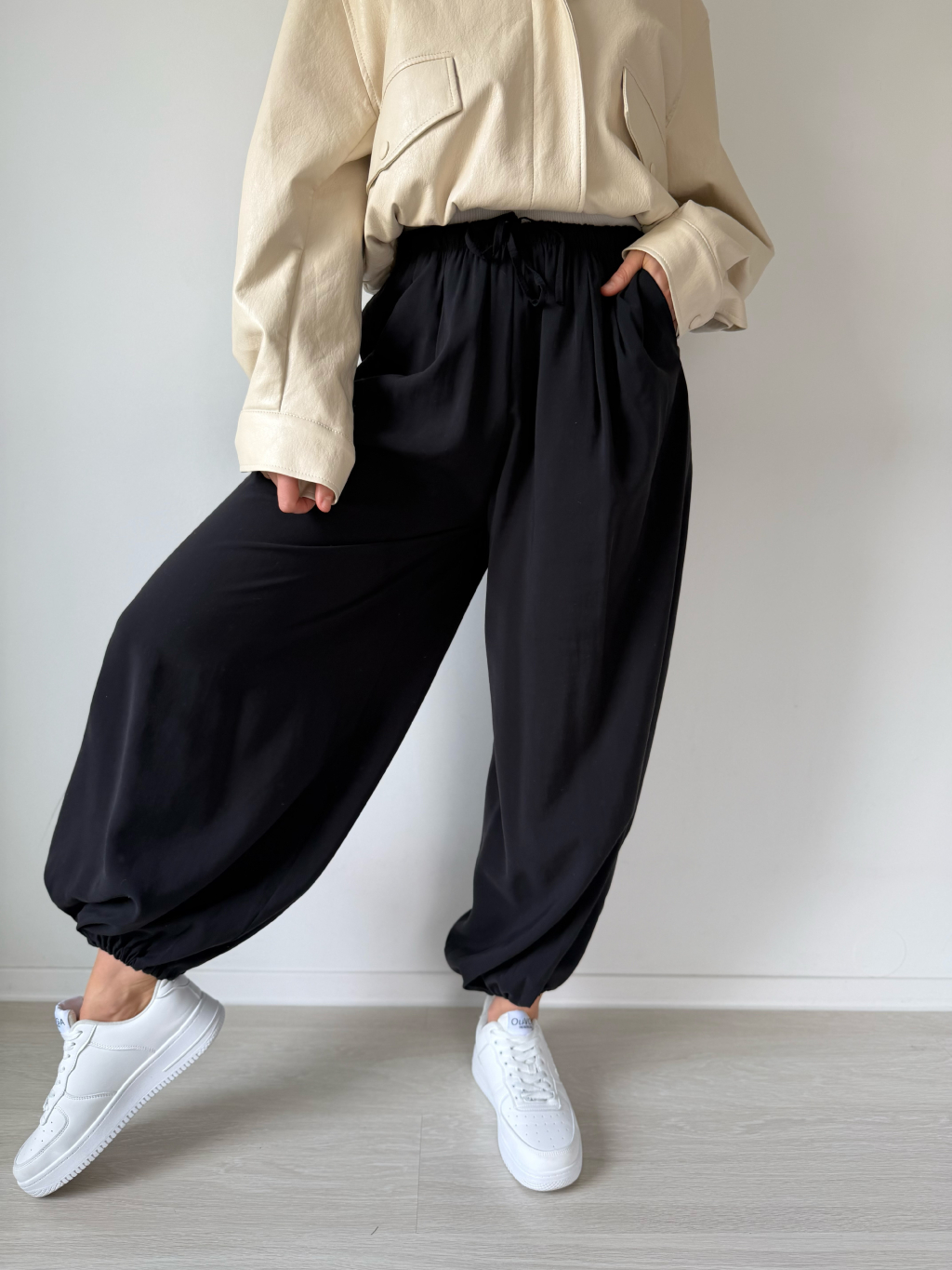prodyšné kalhoty, volné kalhoty, lehké kalhoty, černé kalhoty, kalhoty s gumou v pase, kalhoty bez zapínání, kalhoty