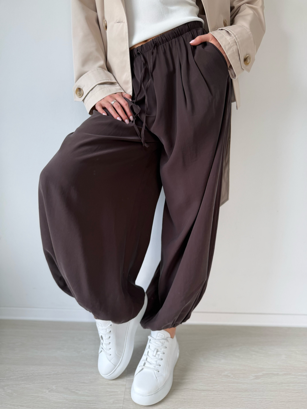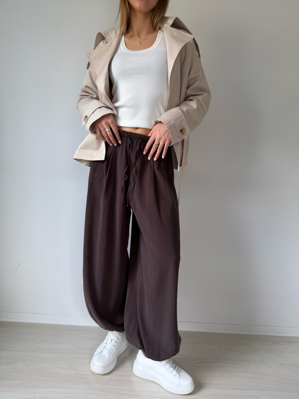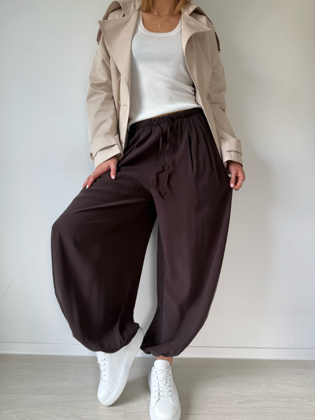 prodyšné kalhoty, volné kalhoty, lehké kalhoty, hnědé kalhoty, kalhoty s gumou v pase, kalhoty bez zapínání, kalhoty