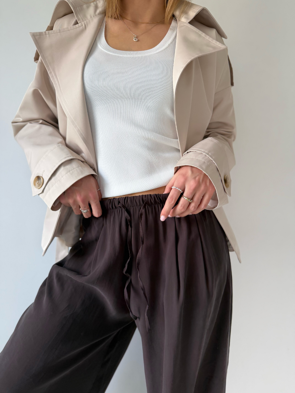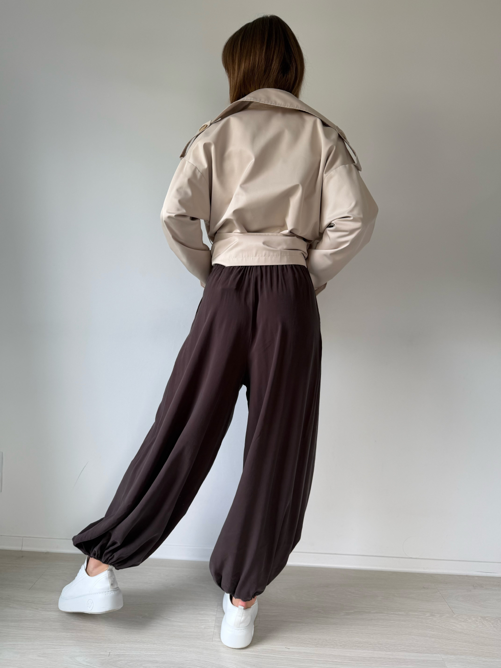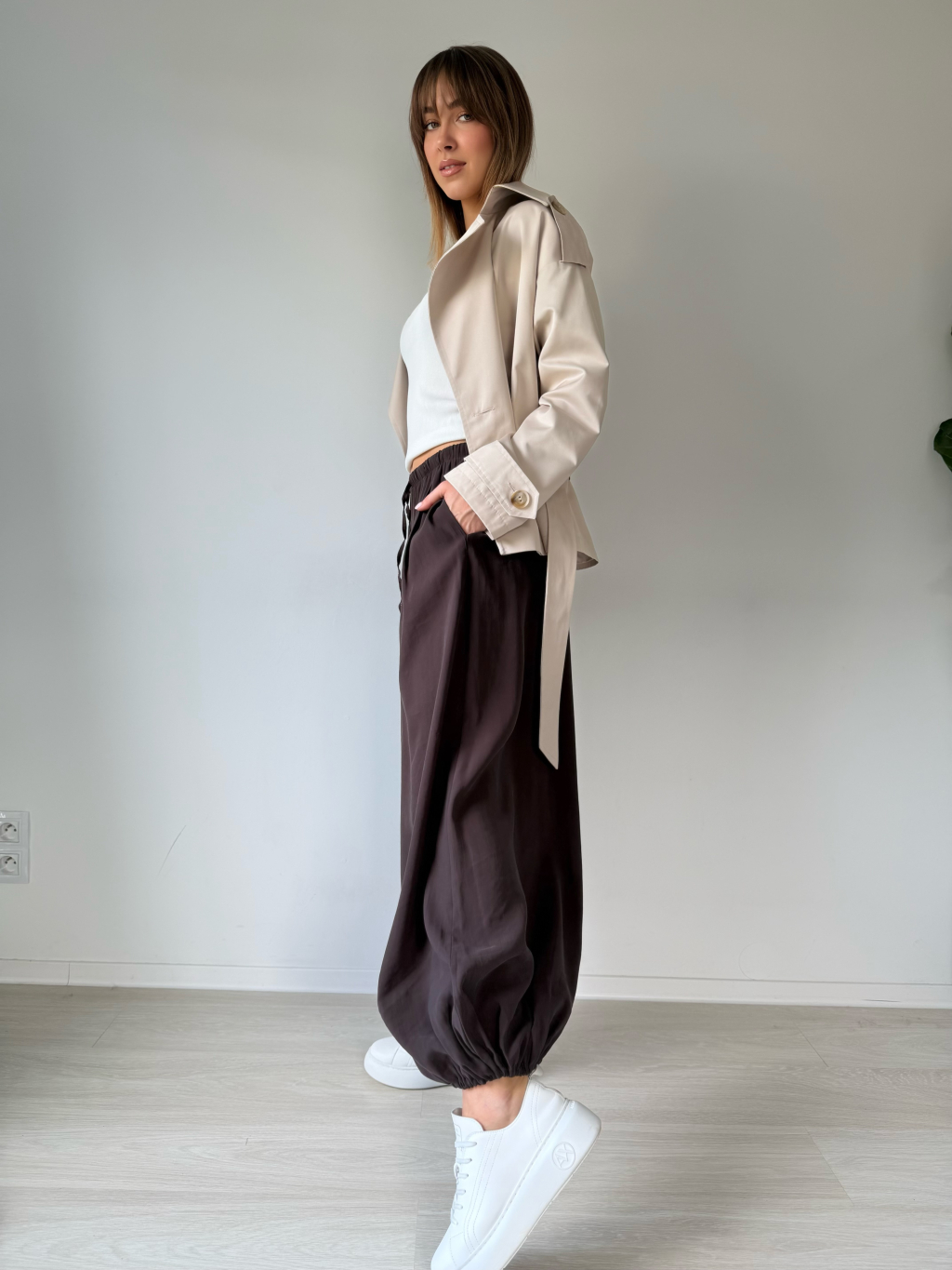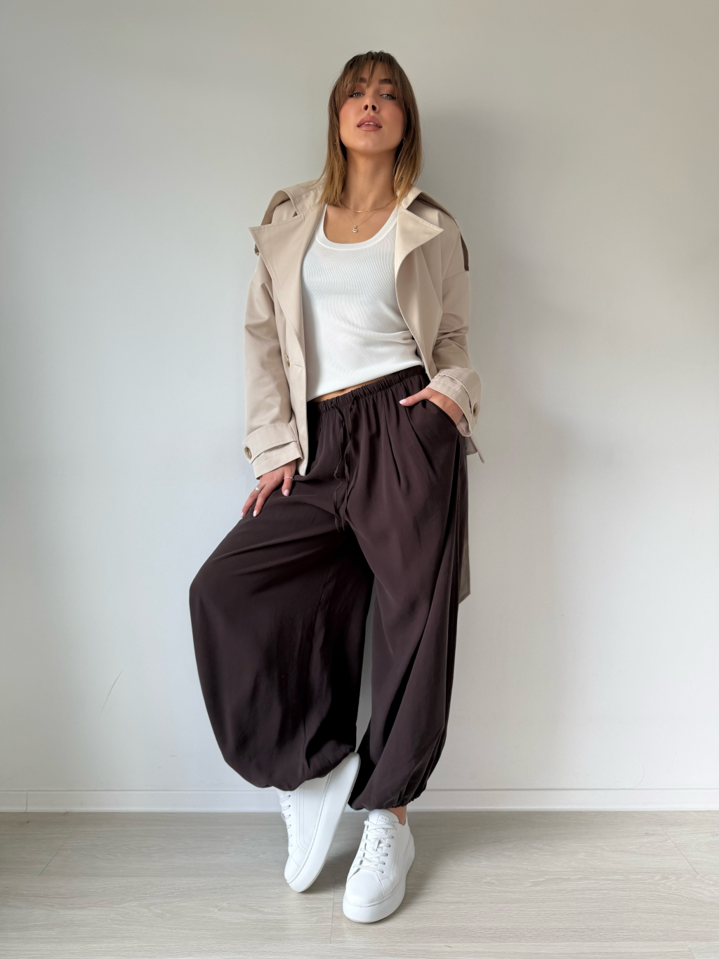 prodyšné kalhoty, volné kalhoty, lehké kalhoty, hnědé kalhoty, kalhoty s gumou v pase, kalhoty bez zapínání, kalhoty