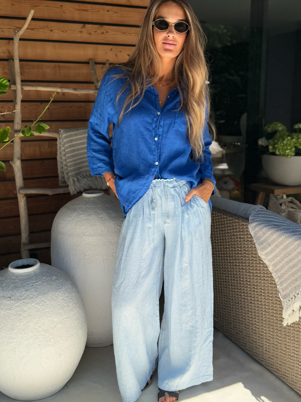 Lněné kalhoty ULGO široké modrá