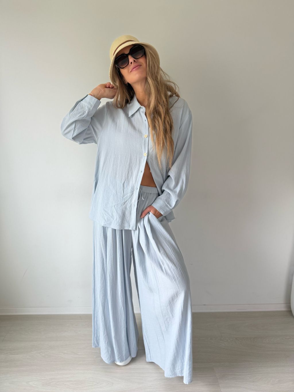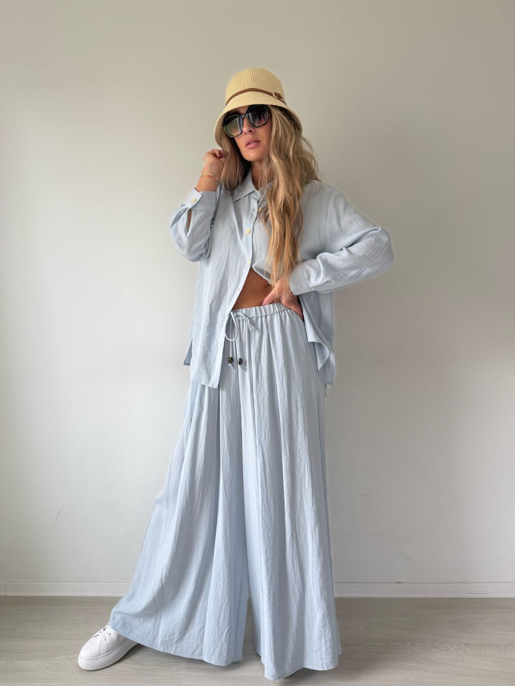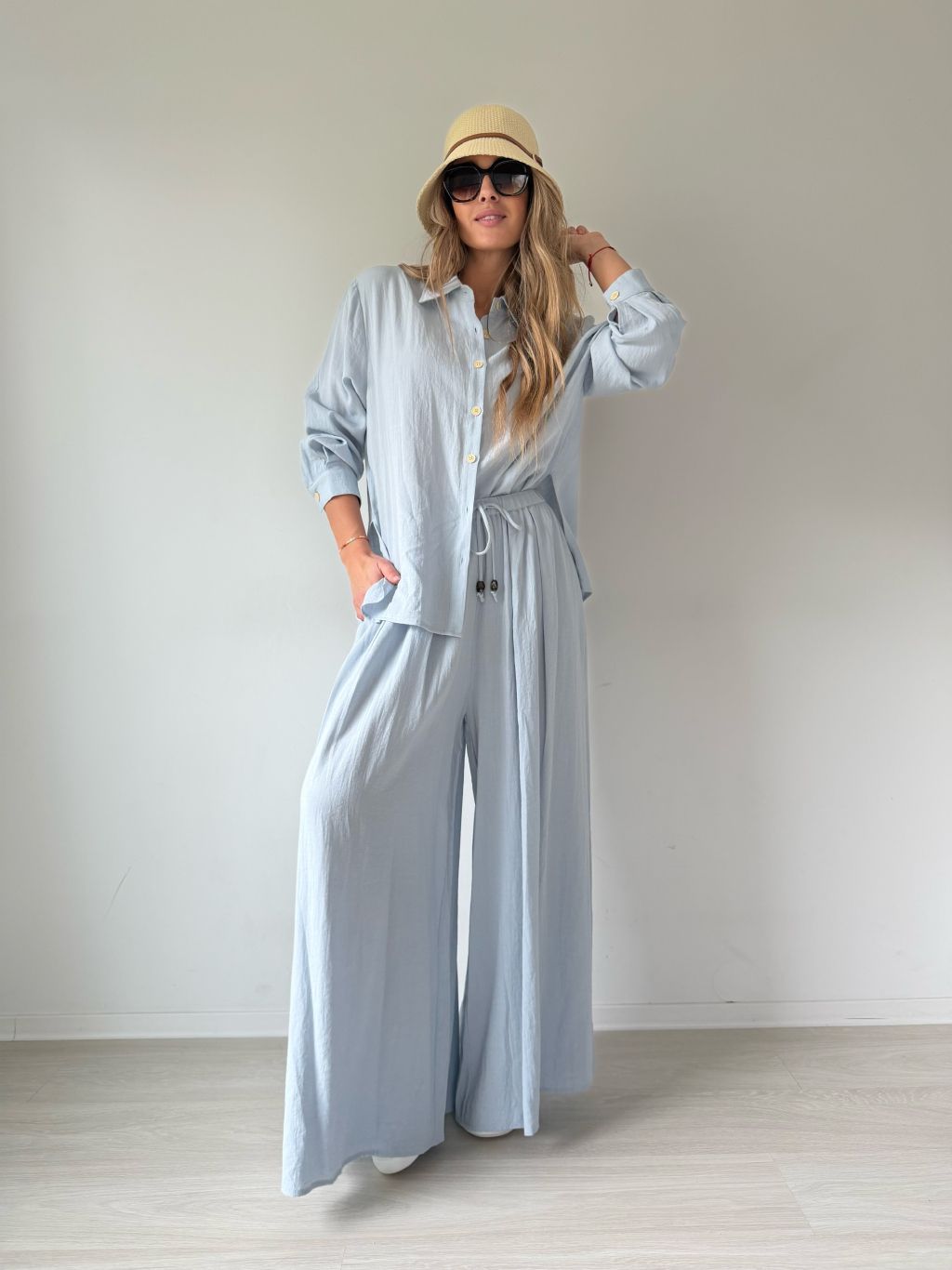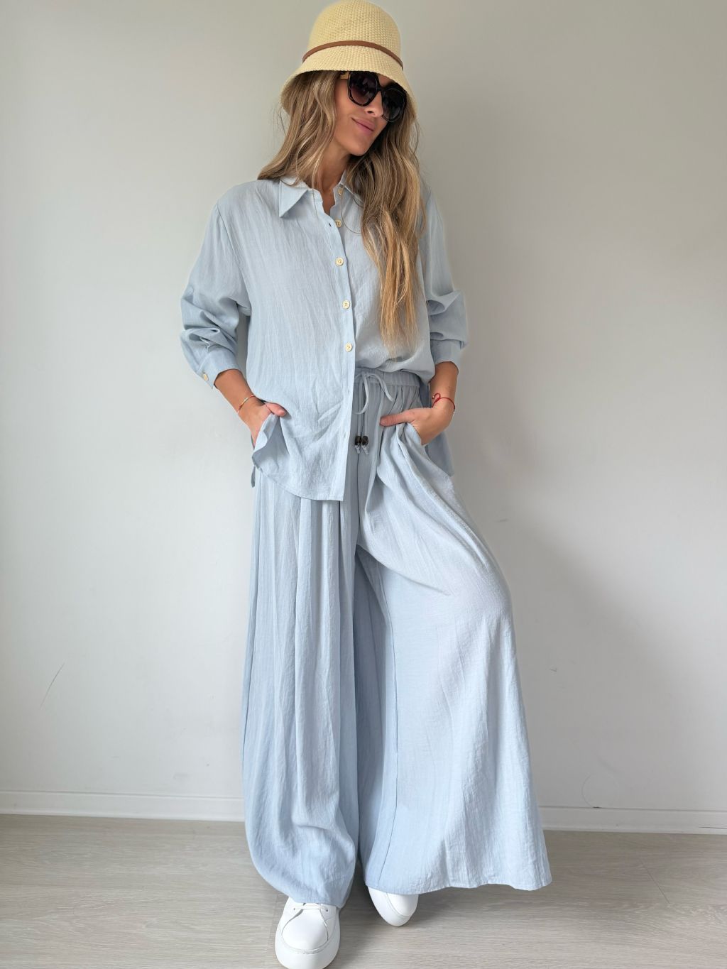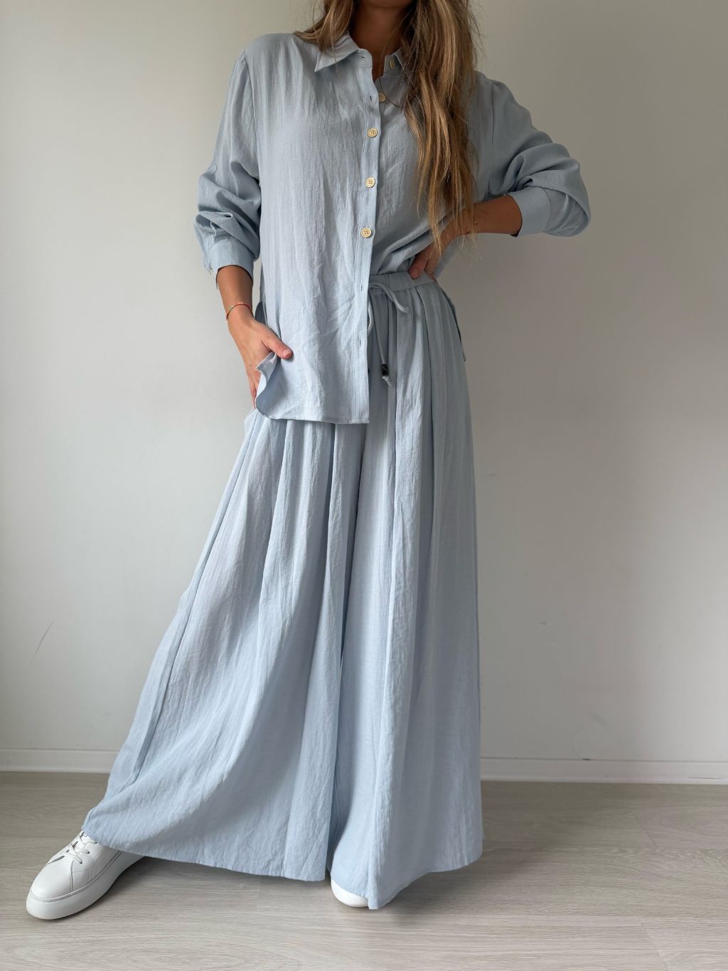 PKomplet se skládá z košile a kalhot. Košile je volná se zapínáním na knoflíky. Kalhoty v pase na gumu s možností zavázat šňůrkou. Dvě kapsy.