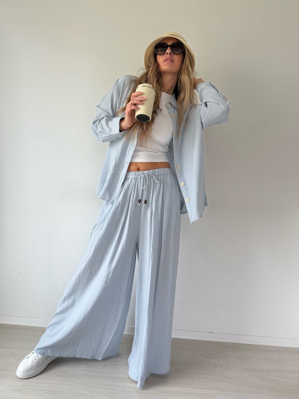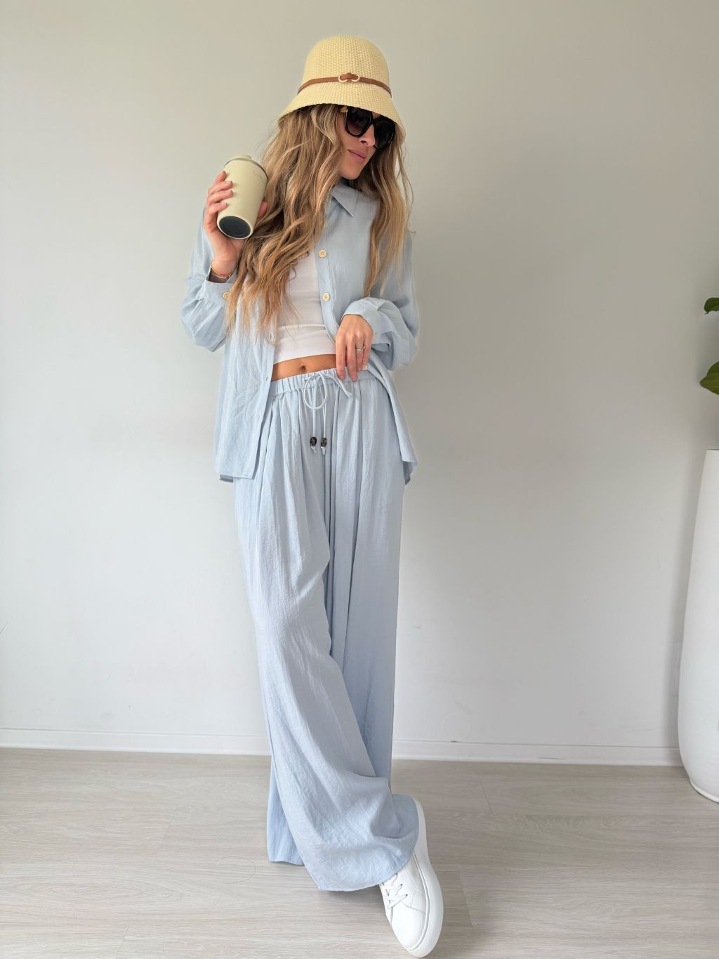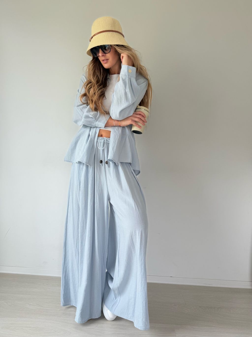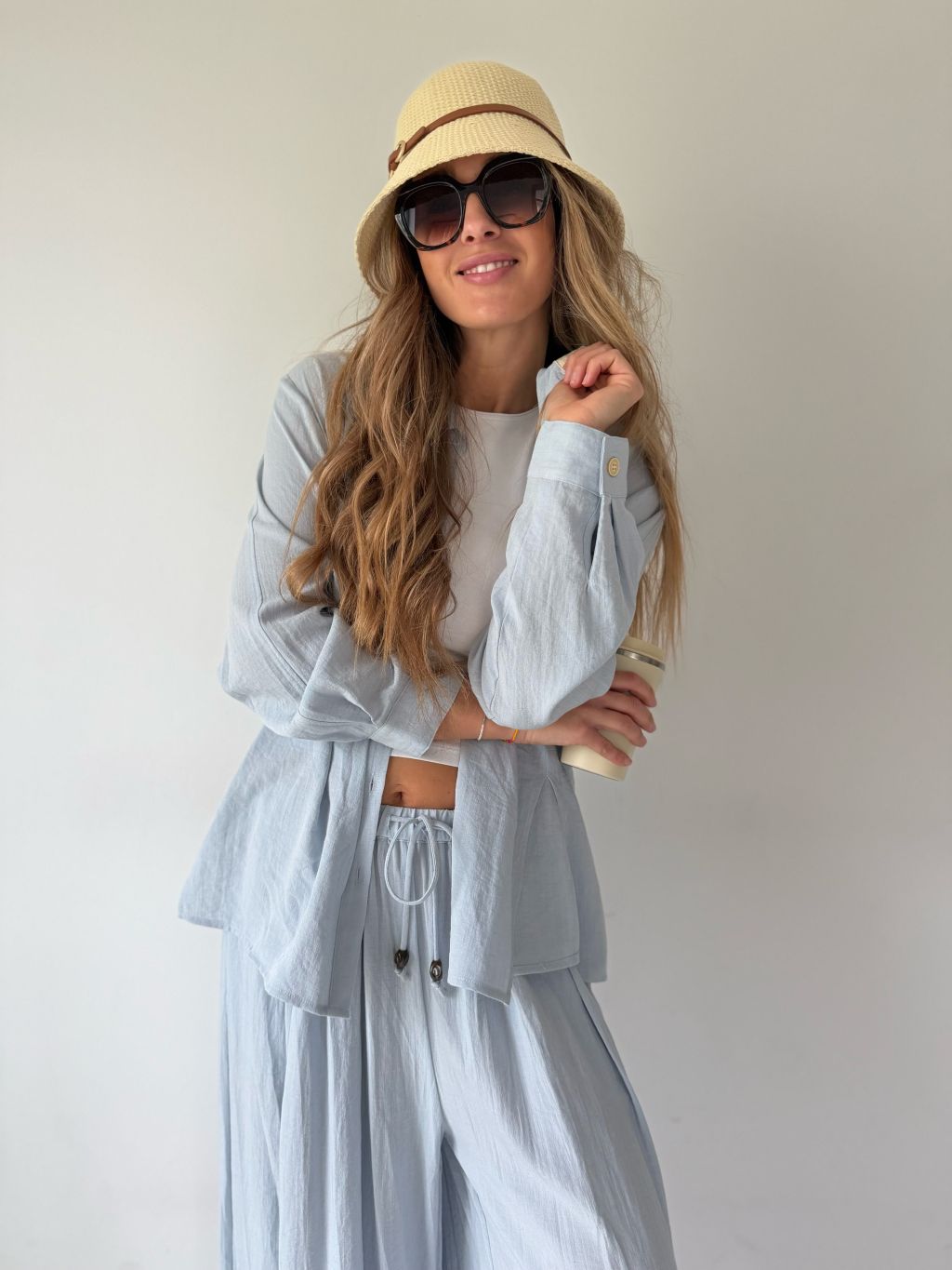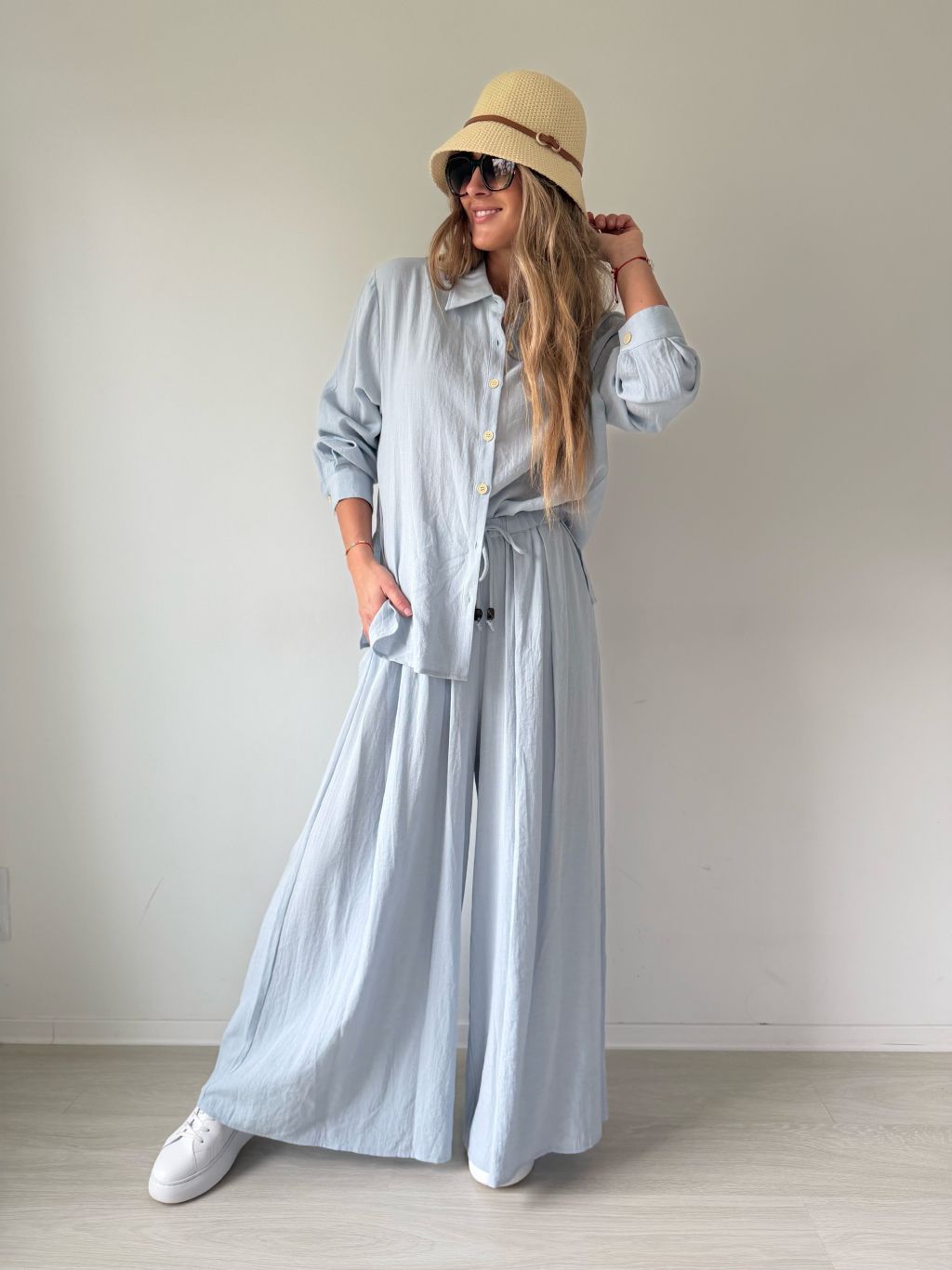 PKomplet se skládá z košile a kalhot. Košile je volná se zapínáním na knoflíky. Kalhoty v pase na gumu s možností zavázat šňůrkou. Dvě kapsy.