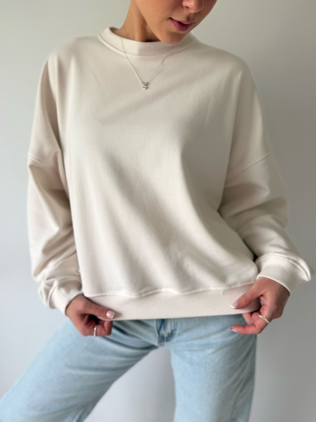 Tepláková mikina bez kapuce. Volná. Úplet po okrajích.