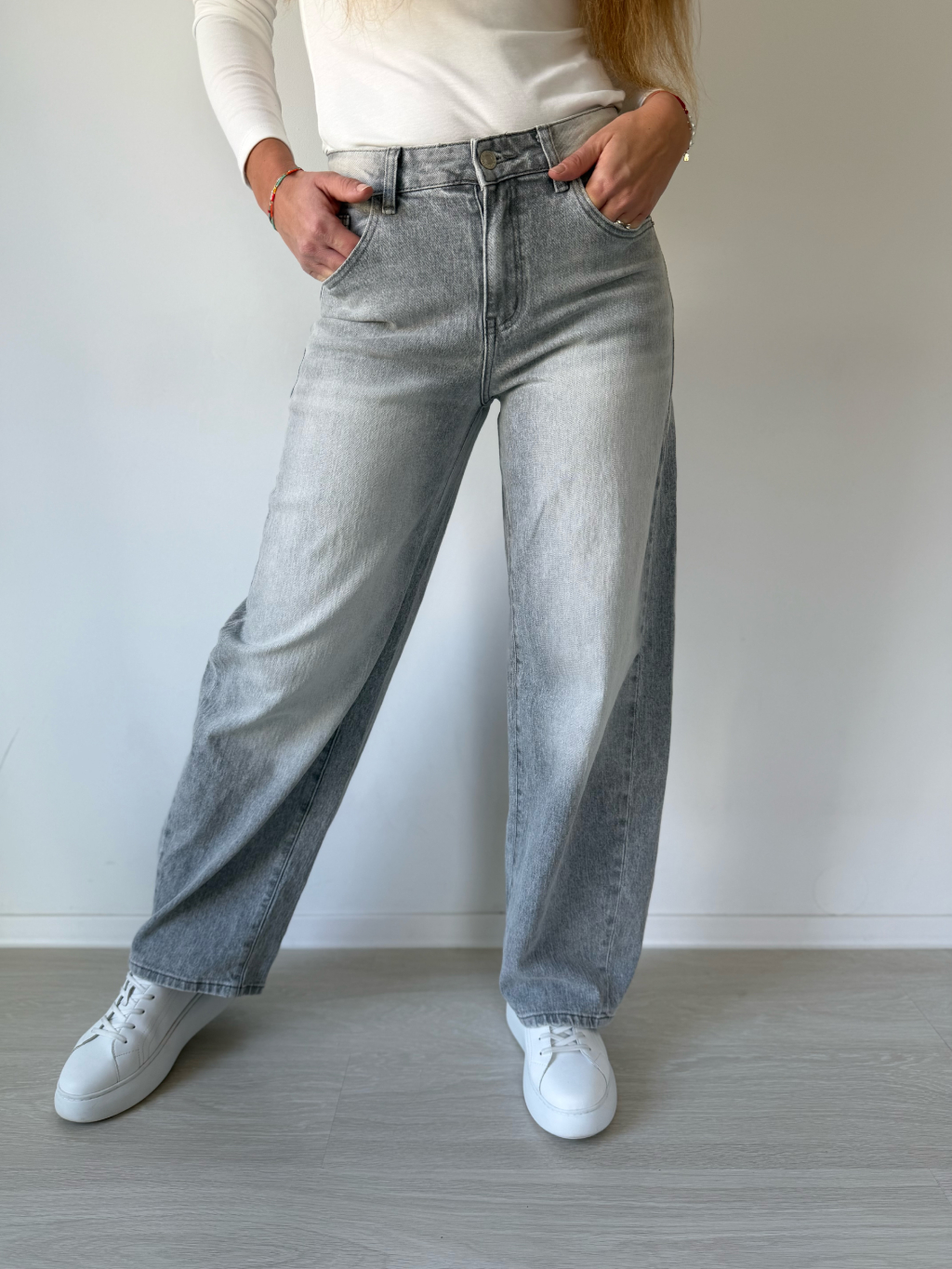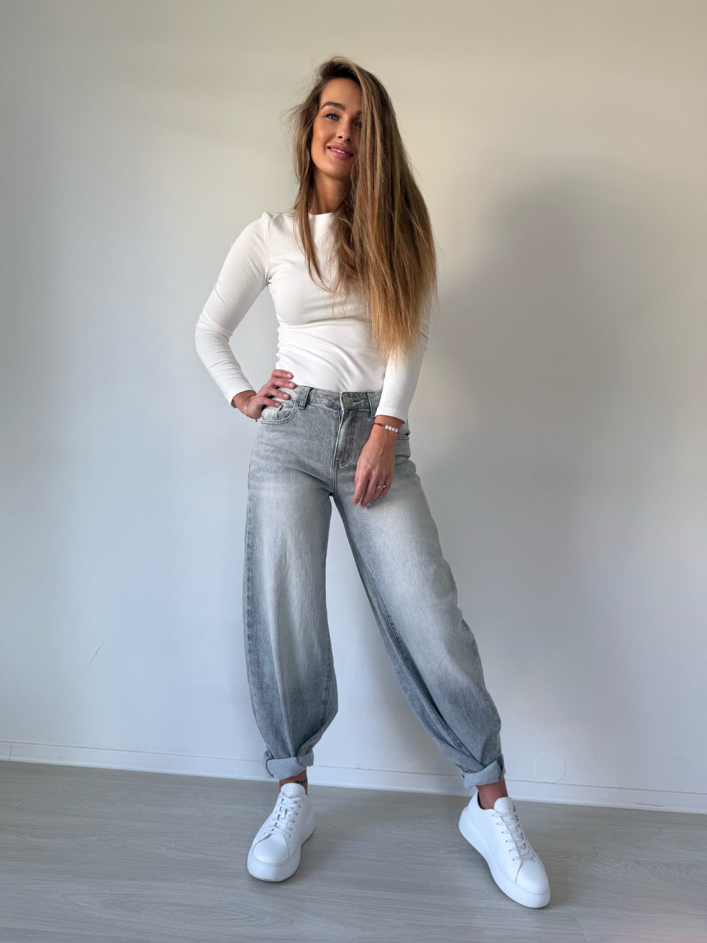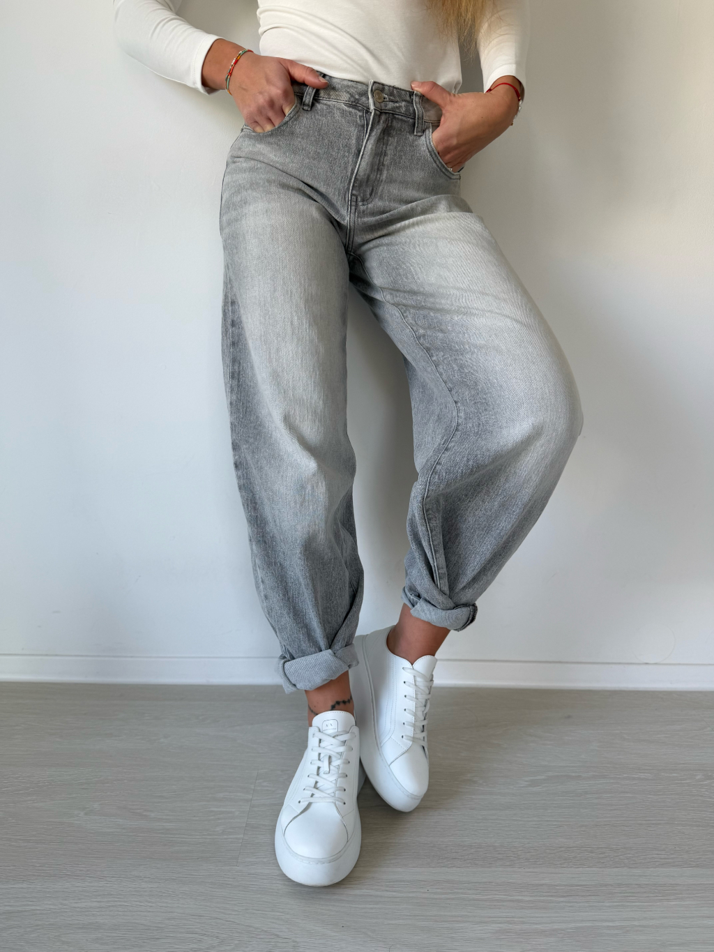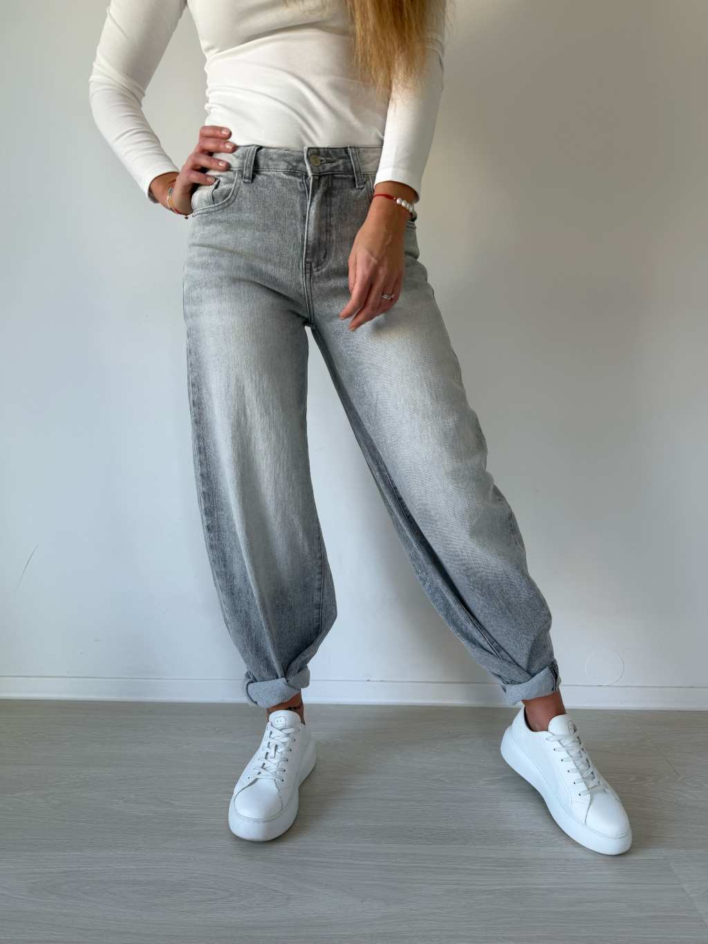 Šedé rifle s bočním pruhem. Balonový střih.