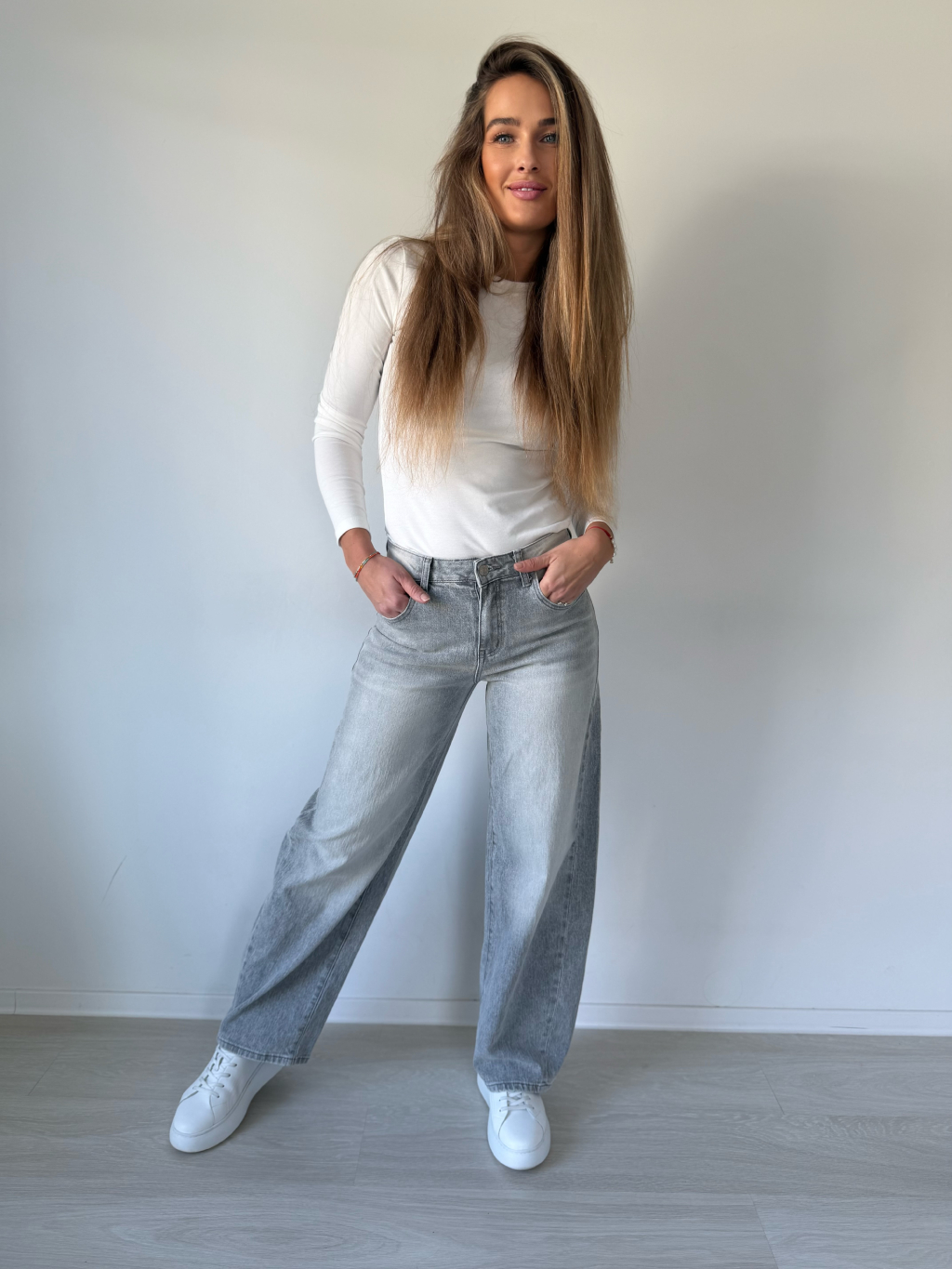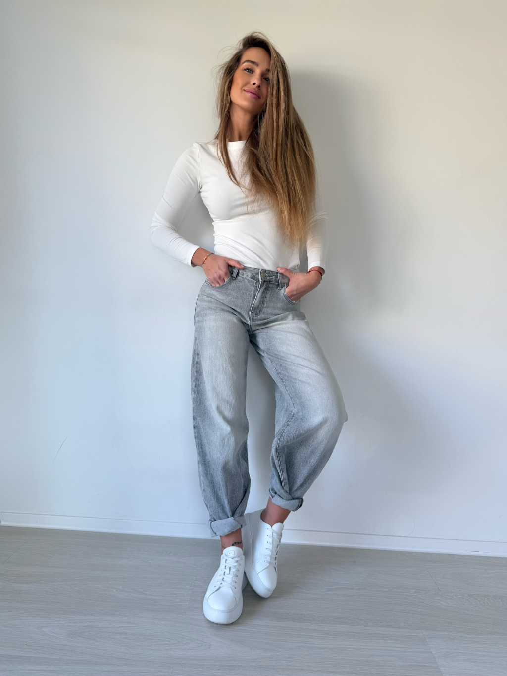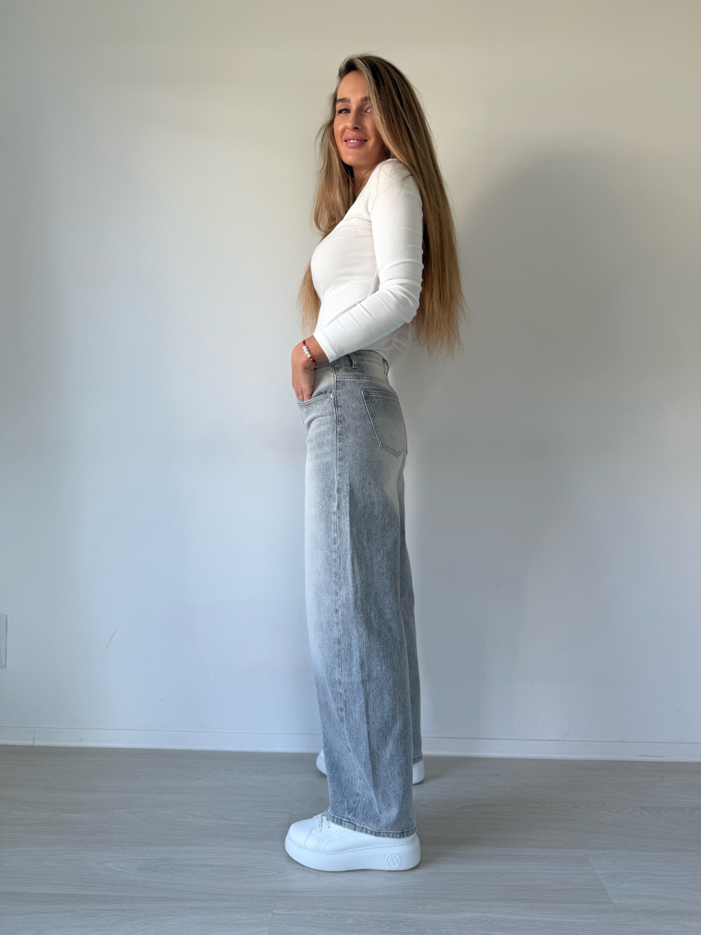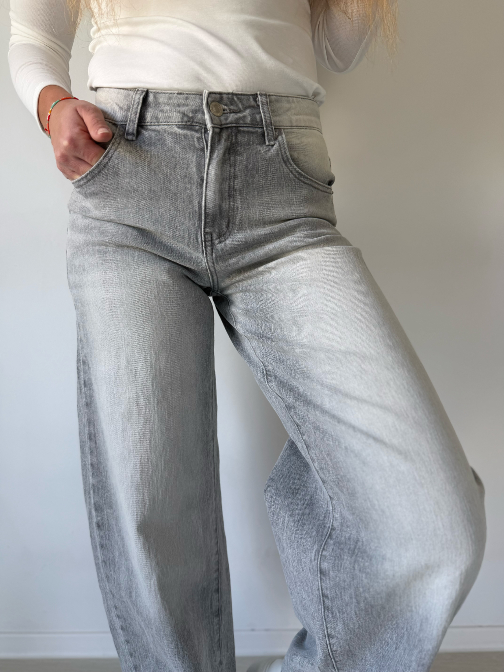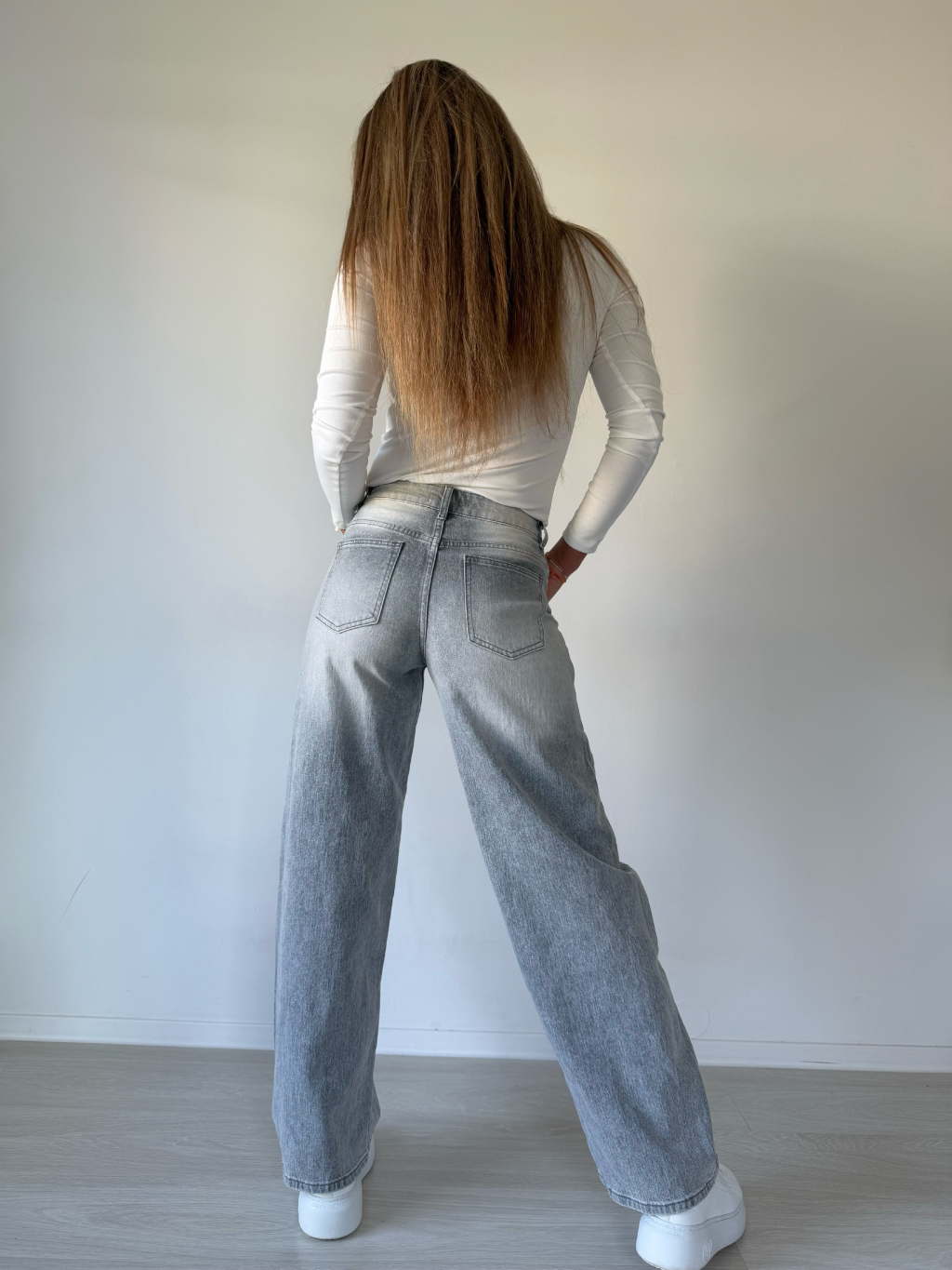 Šedé rifle s bočním pruhem. Balonový střih.