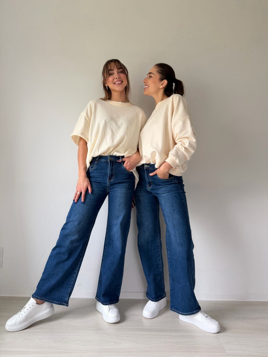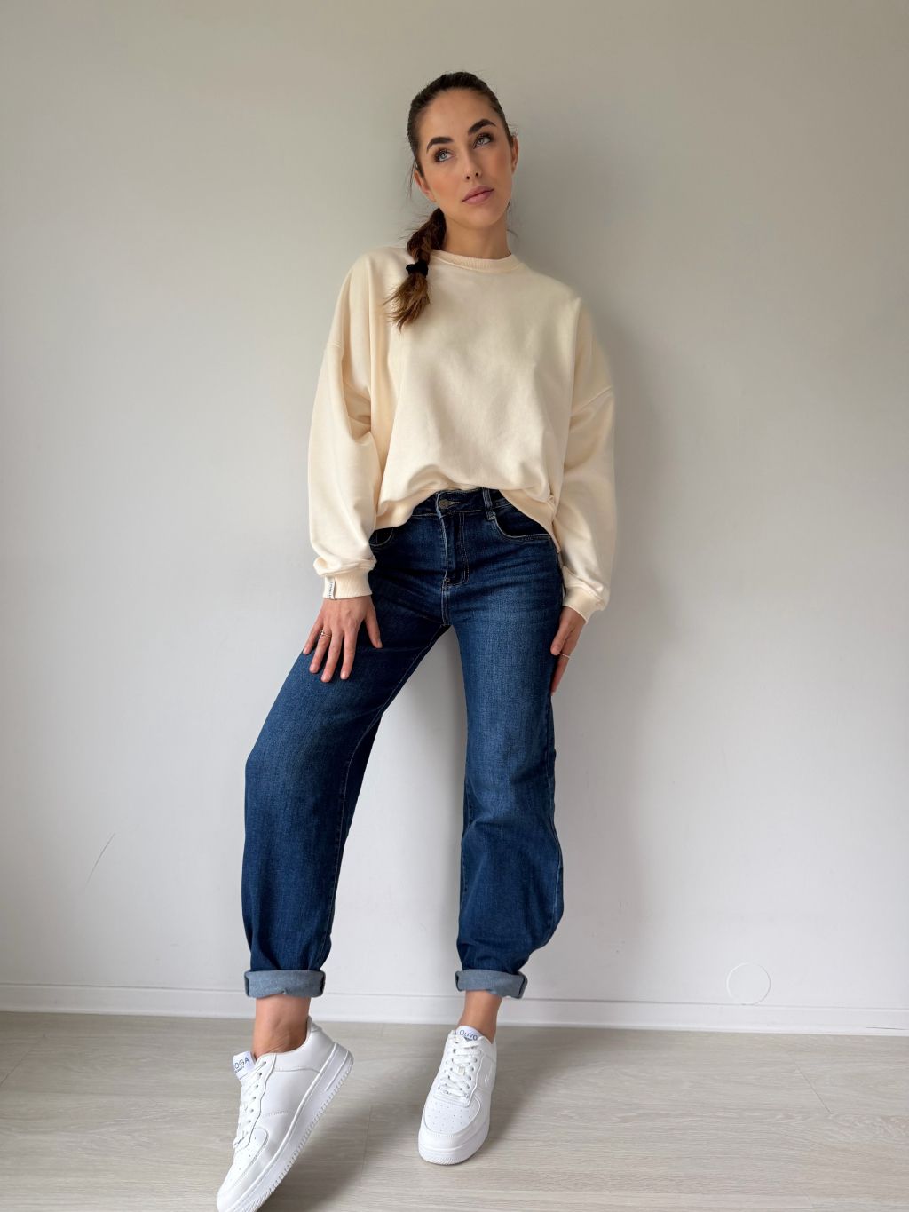 Wide leg džíny jsou rovného střihu. Materiál je elastický. Vzadu výrazný kožený štítek v hnědé barvě.