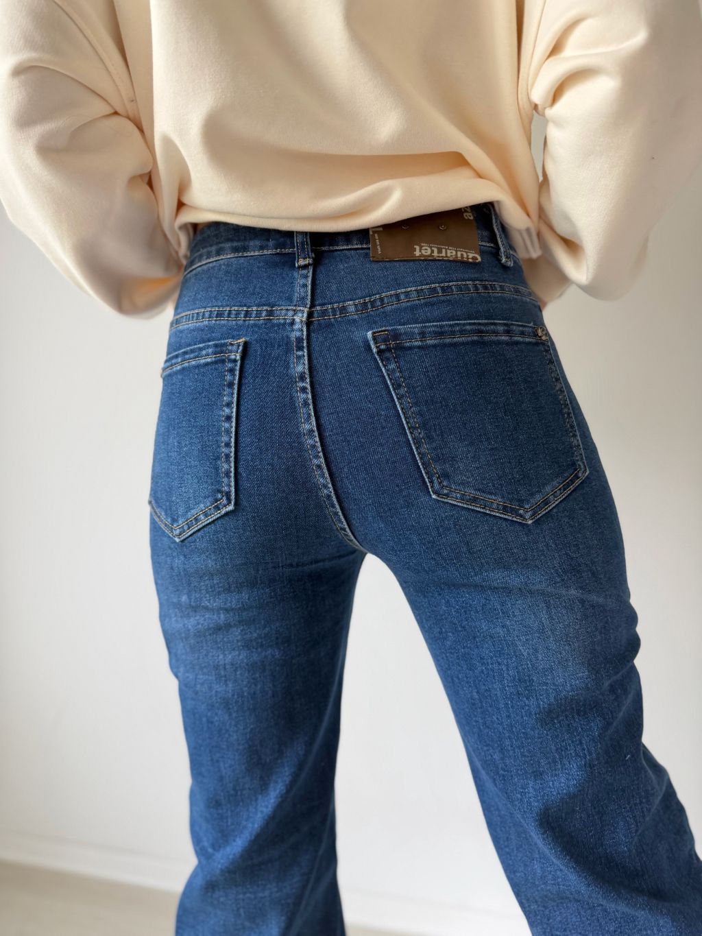 Rifle rovného střihu. Vzadu výrazný kožený štítek v hnědé barvě.