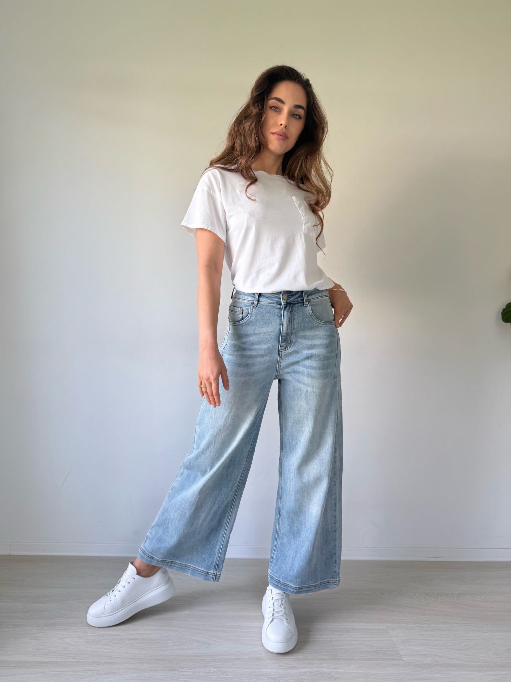 Světle modré rifle mají volný střih. Materiál je elastický.