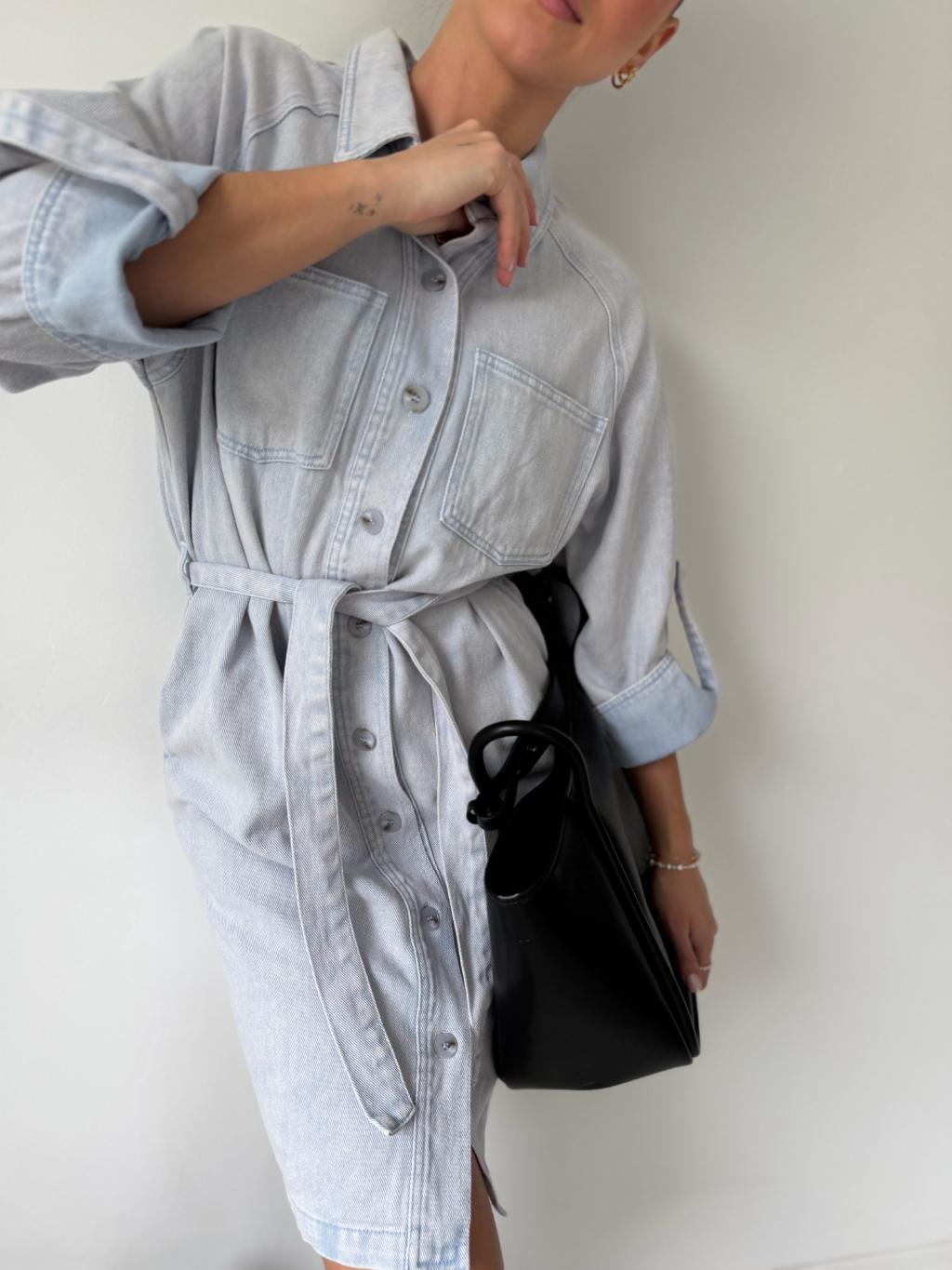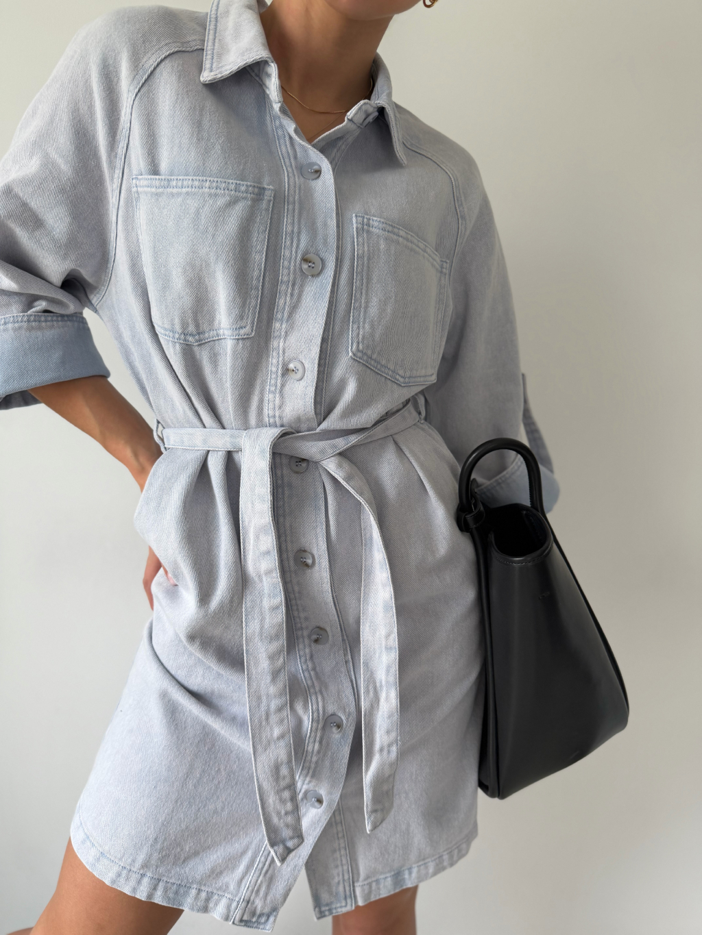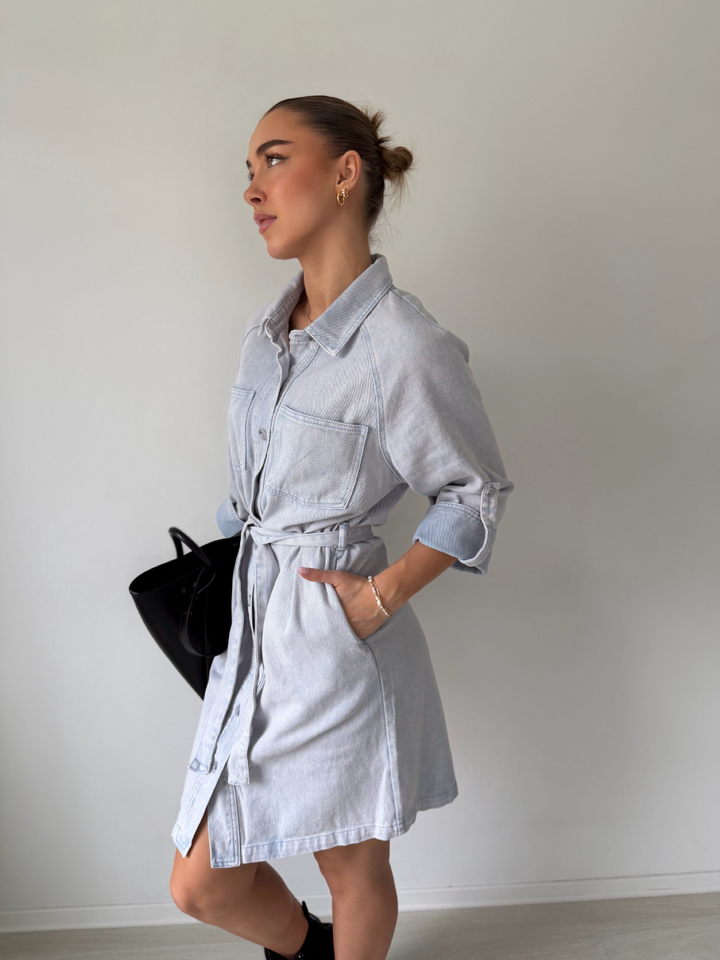 Riflové šaty s 3/4 rukávy a páskem kolem pasu. Dvě kapsy na prsou. Dvě kapsy na stranách. Zapínání na knoflíky.