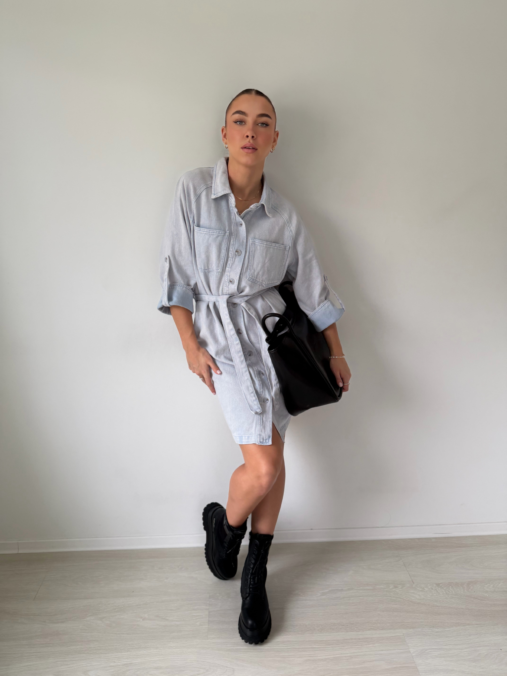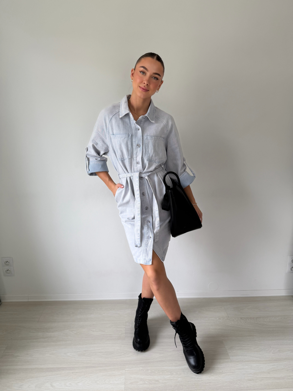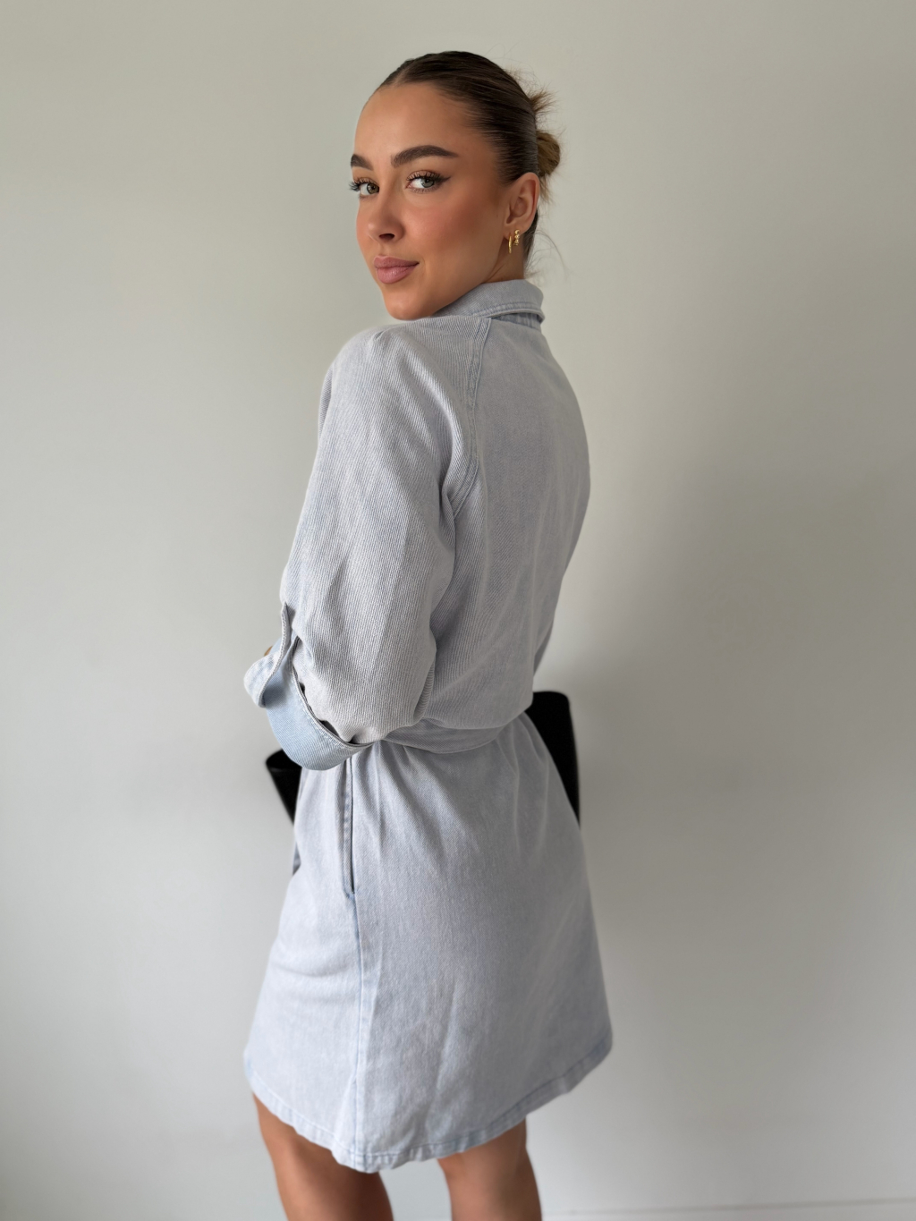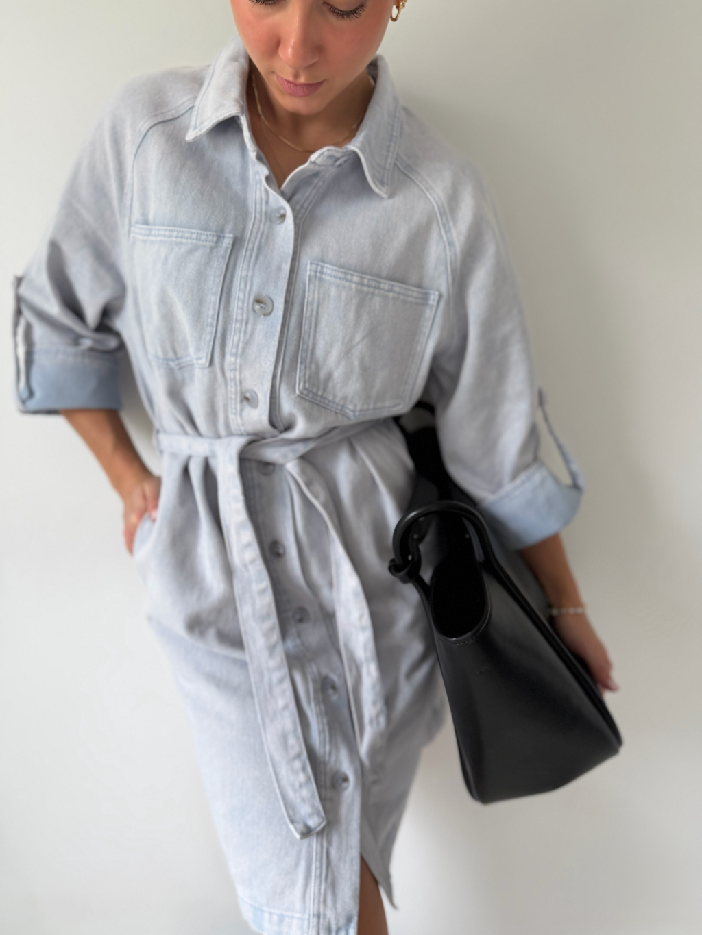 Riflové šaty s 3/4 rukávy a páskem kolem pasu. Dvě kapsy na prsou. Dvě kapsy na stranách. Zapínání na knoflíky.
