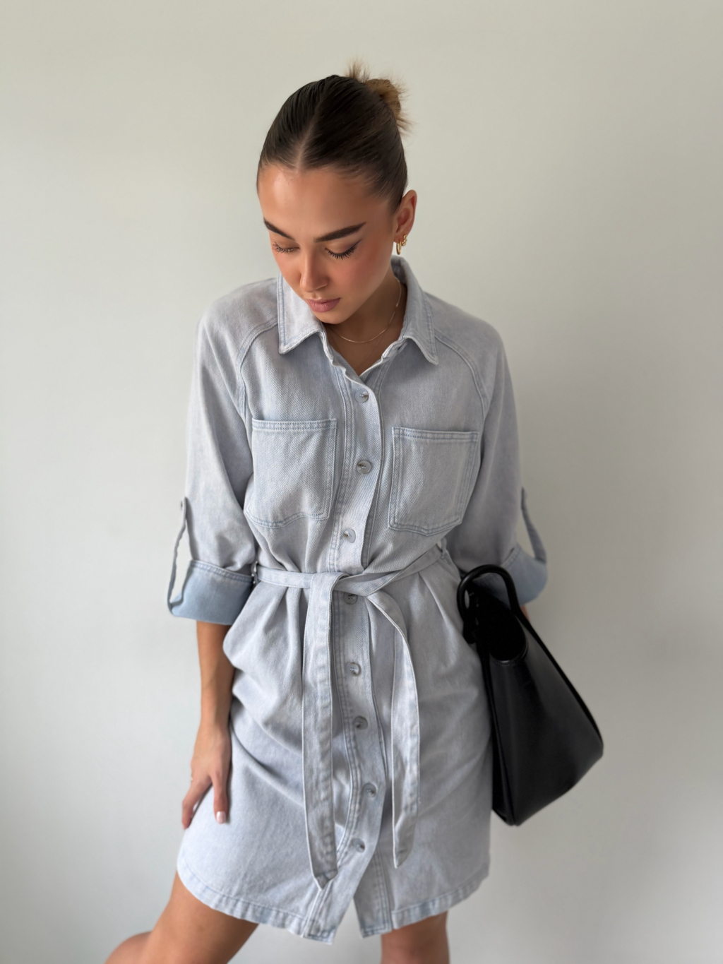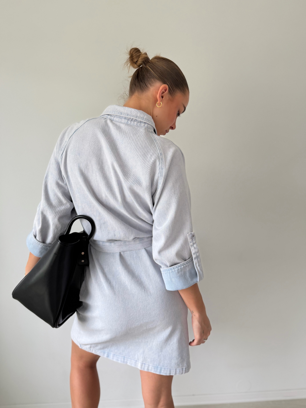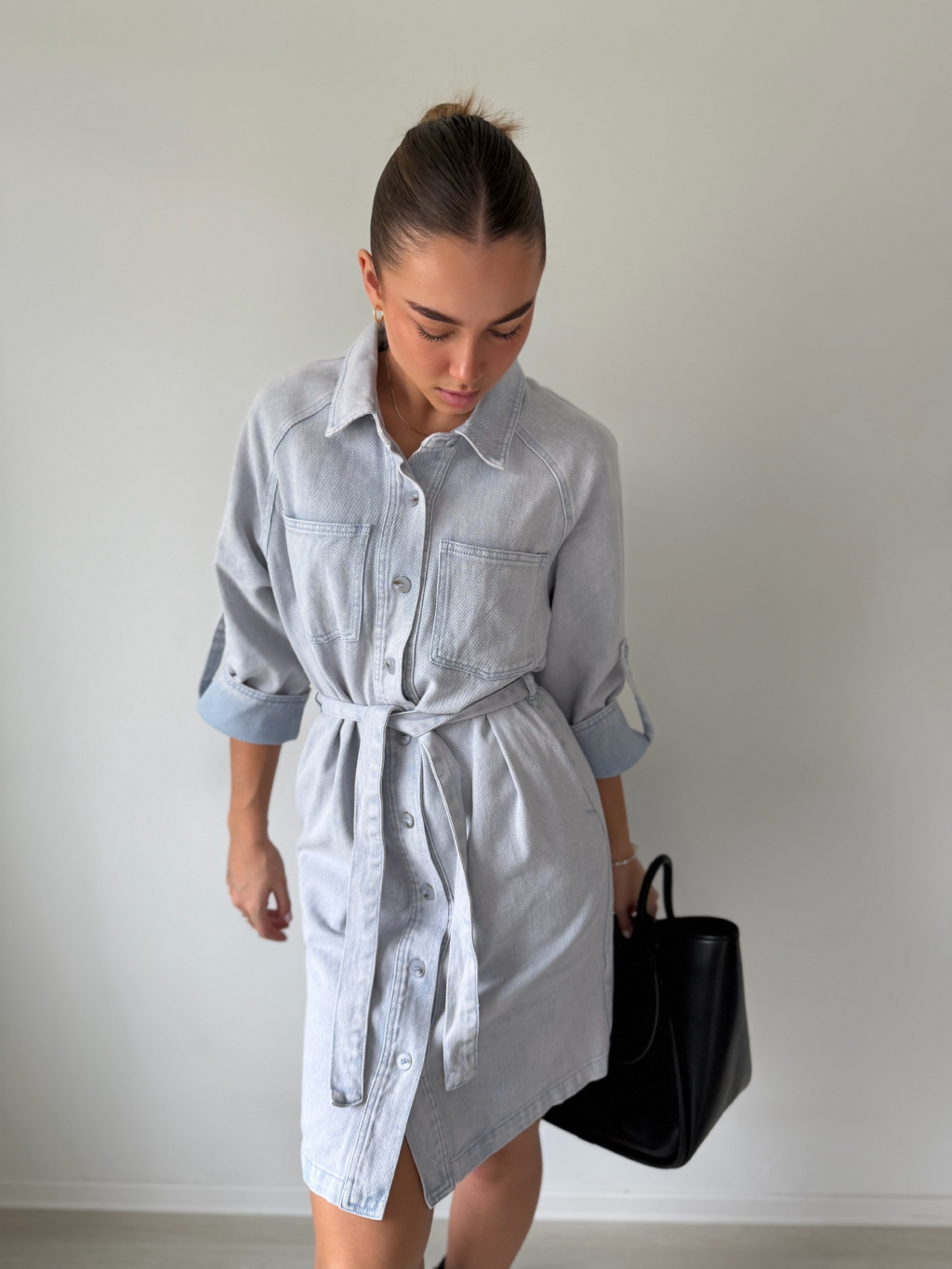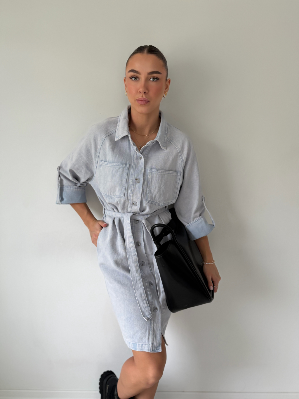 riflové šaty, šaty s 3/4 rukávem, šaty s páskem, trendy šaty, denim šaty