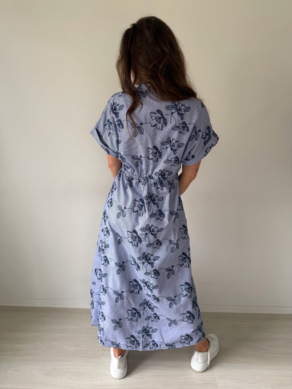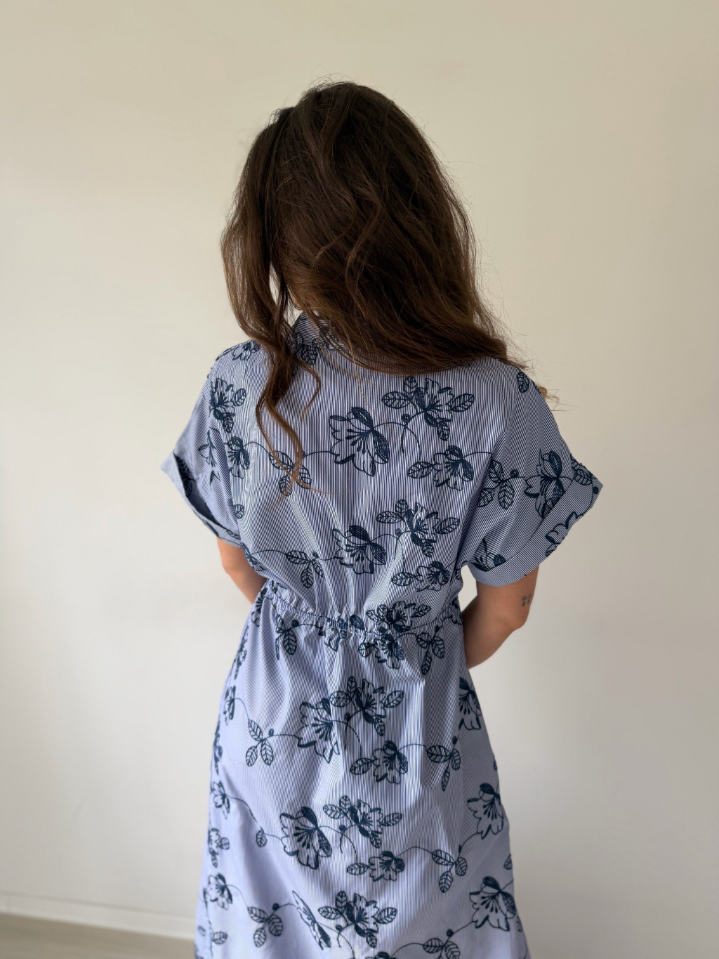 Košilové šaty s vyšitými květy. Zapínání na knoflík. Guma v pase.