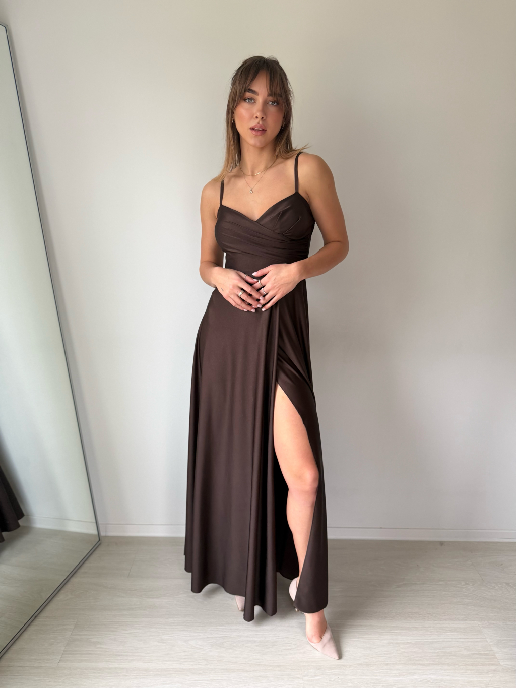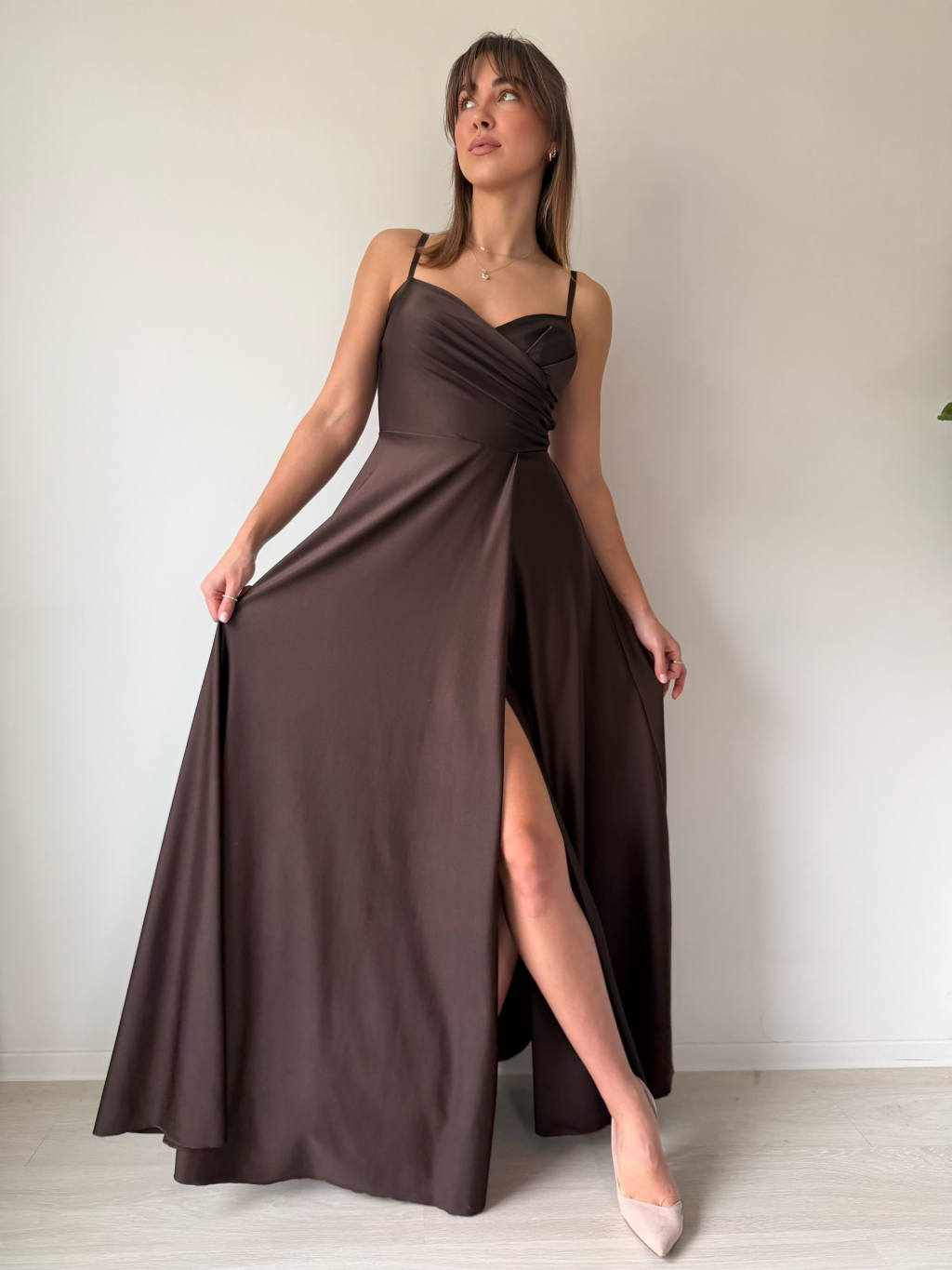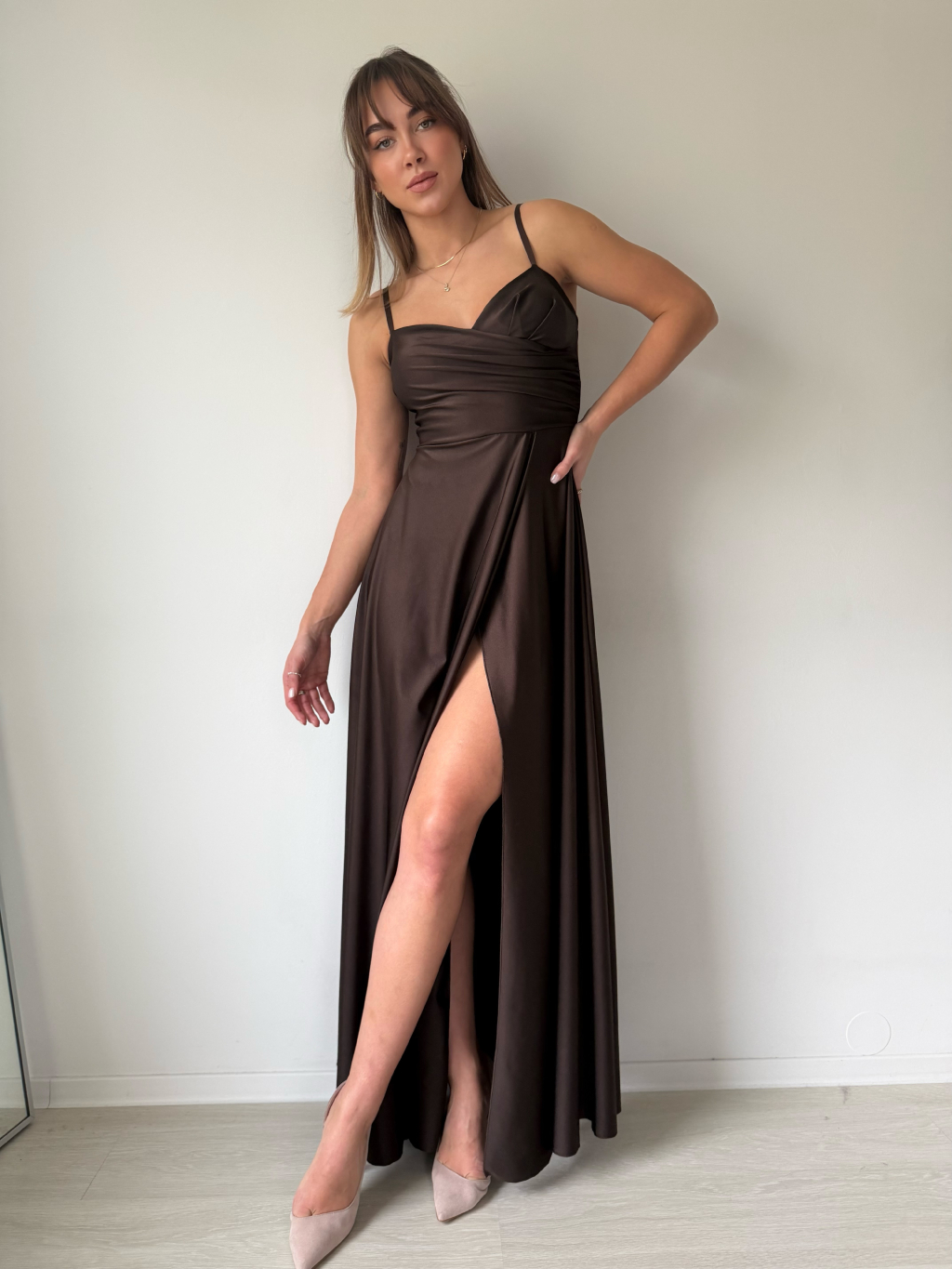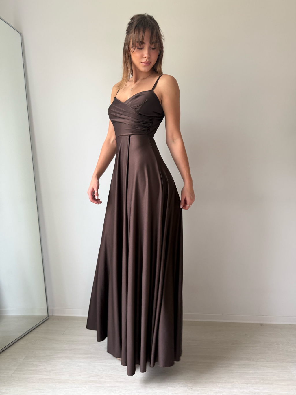 Dlouhé společenské šaty na ramínka, která jsou nastavitelná. Vrchní část má tvarované košíčky a nařasený detail přes prsa.