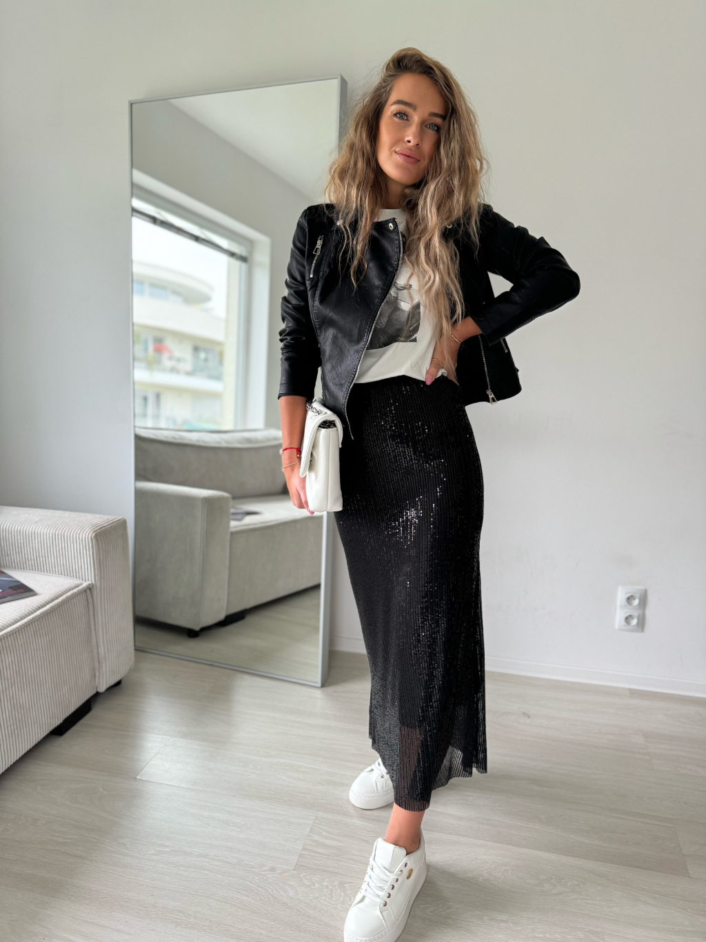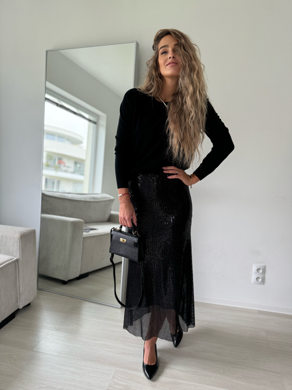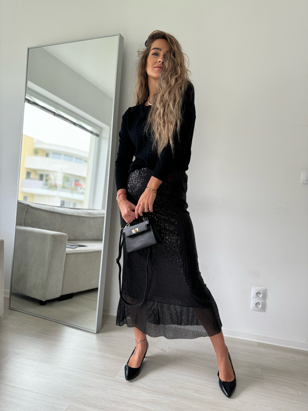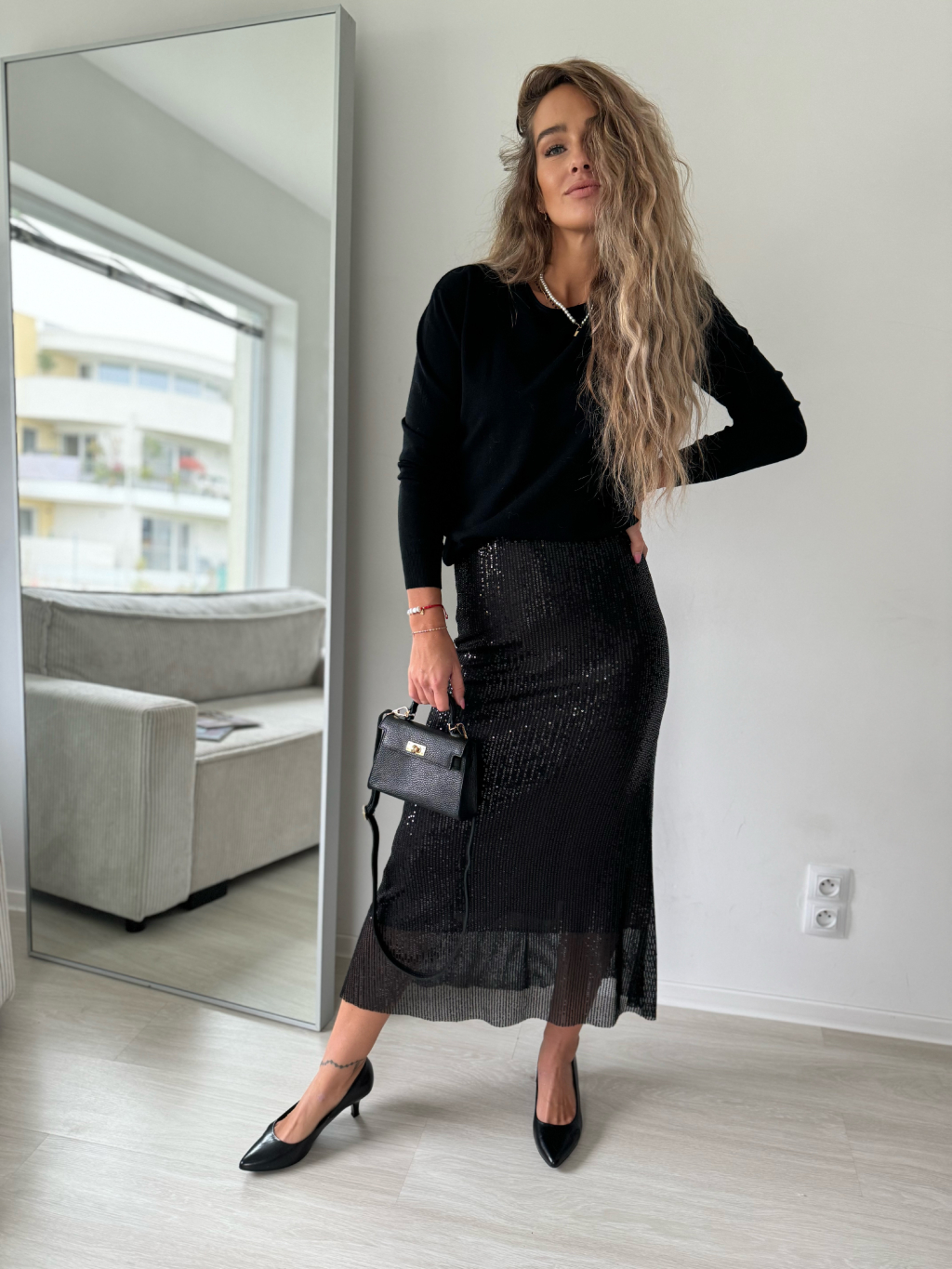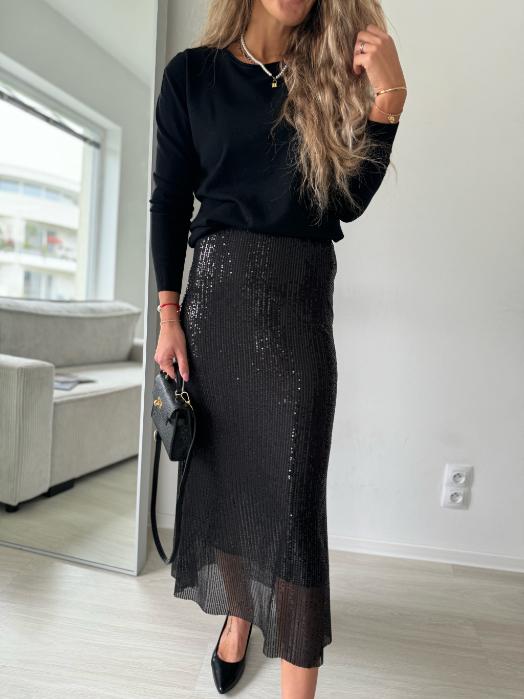 dlouhá sukně, sukně s flitry, černá sukně, sukně do gumy, elegance, styl.