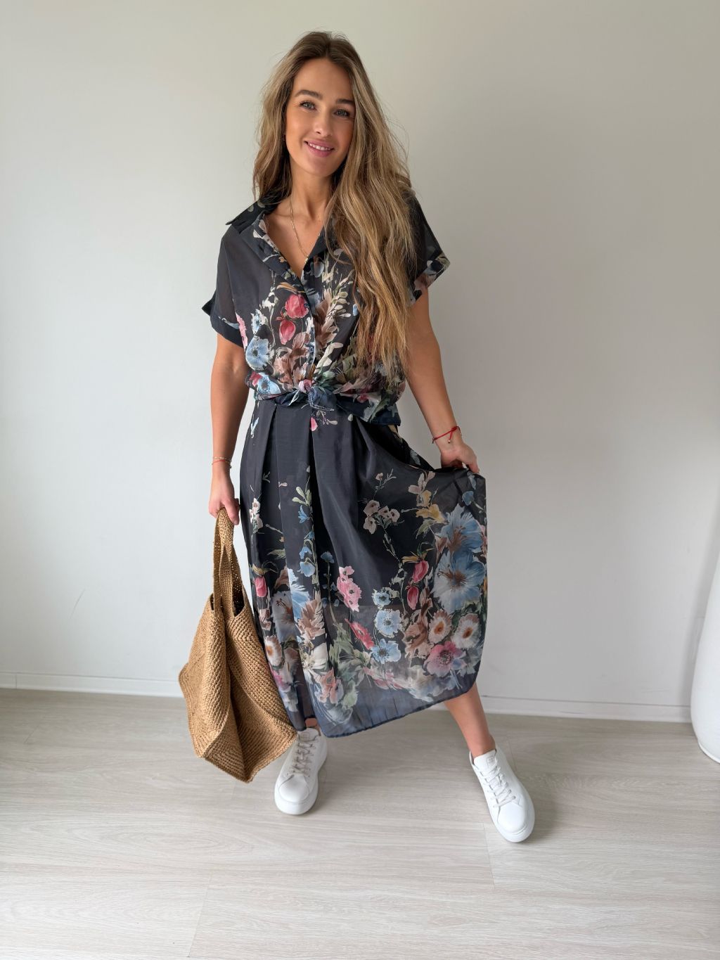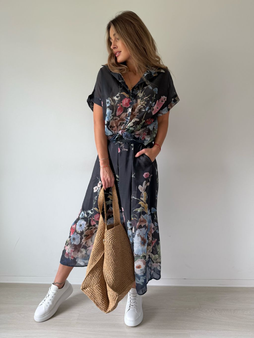 Květinový komplet. Košile má zapínání na knoflíky. Sukně s gumou v pase a dvě praktické kapsy.
