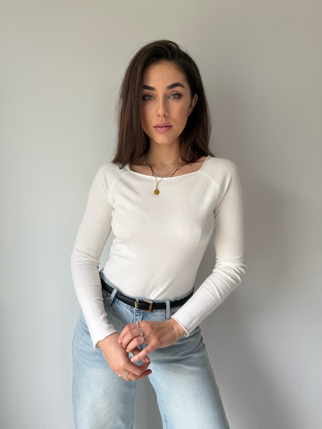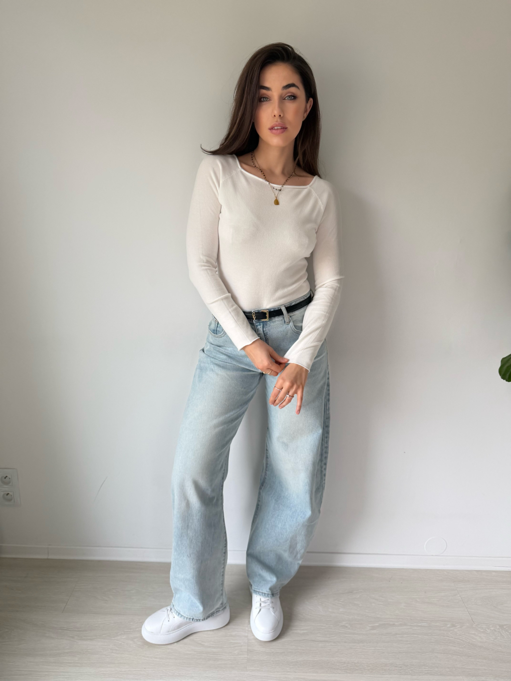 Lehký svetřík s dlouhým rukávem, nebo také jako triko. Ohrnuté lemy. Široký výstřih. Decentní prošívání od paží ke krku.