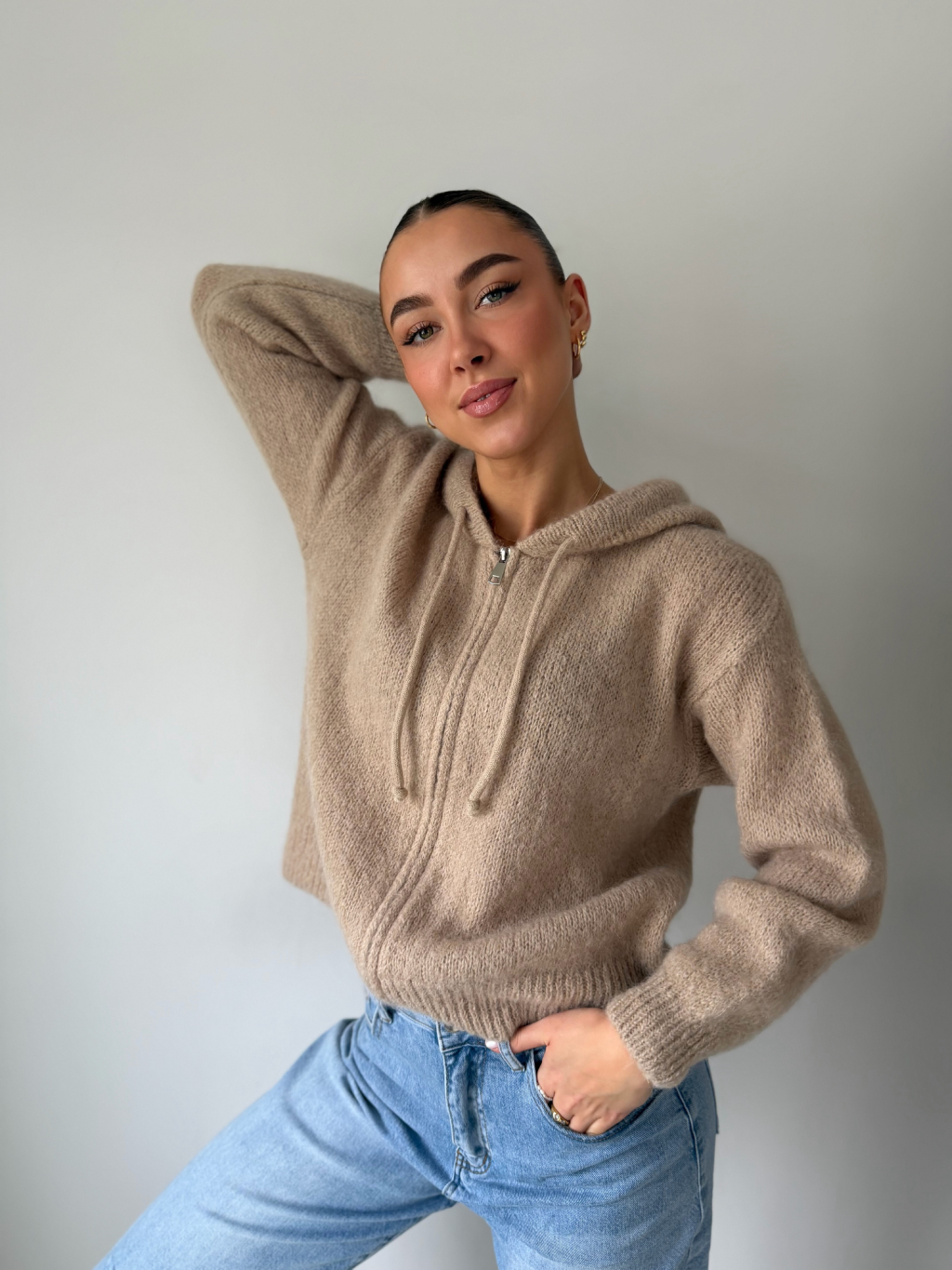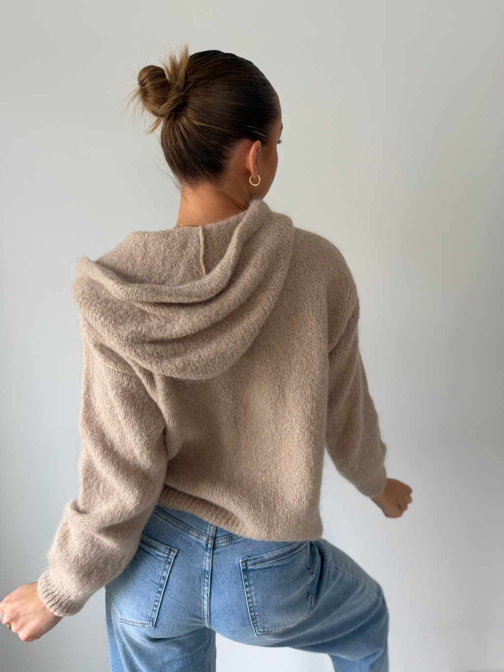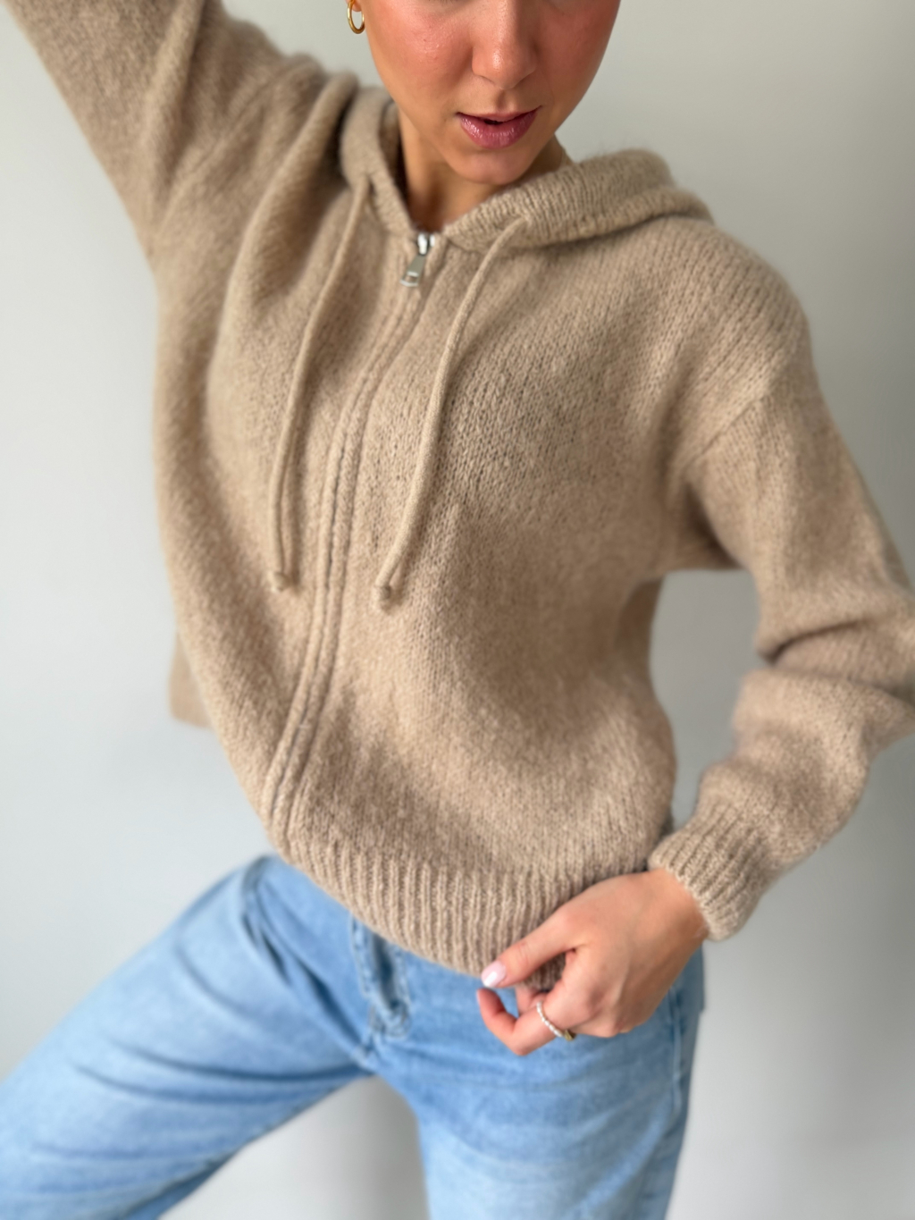 Pletený mohérový svetr s kapucí. Kapuce je doplněna šňůrkami. Zapínání na zip. Bez kapes! Díky vysokému podílu mohéru je svetr lehký, hřejivý a příjemný na dotek.