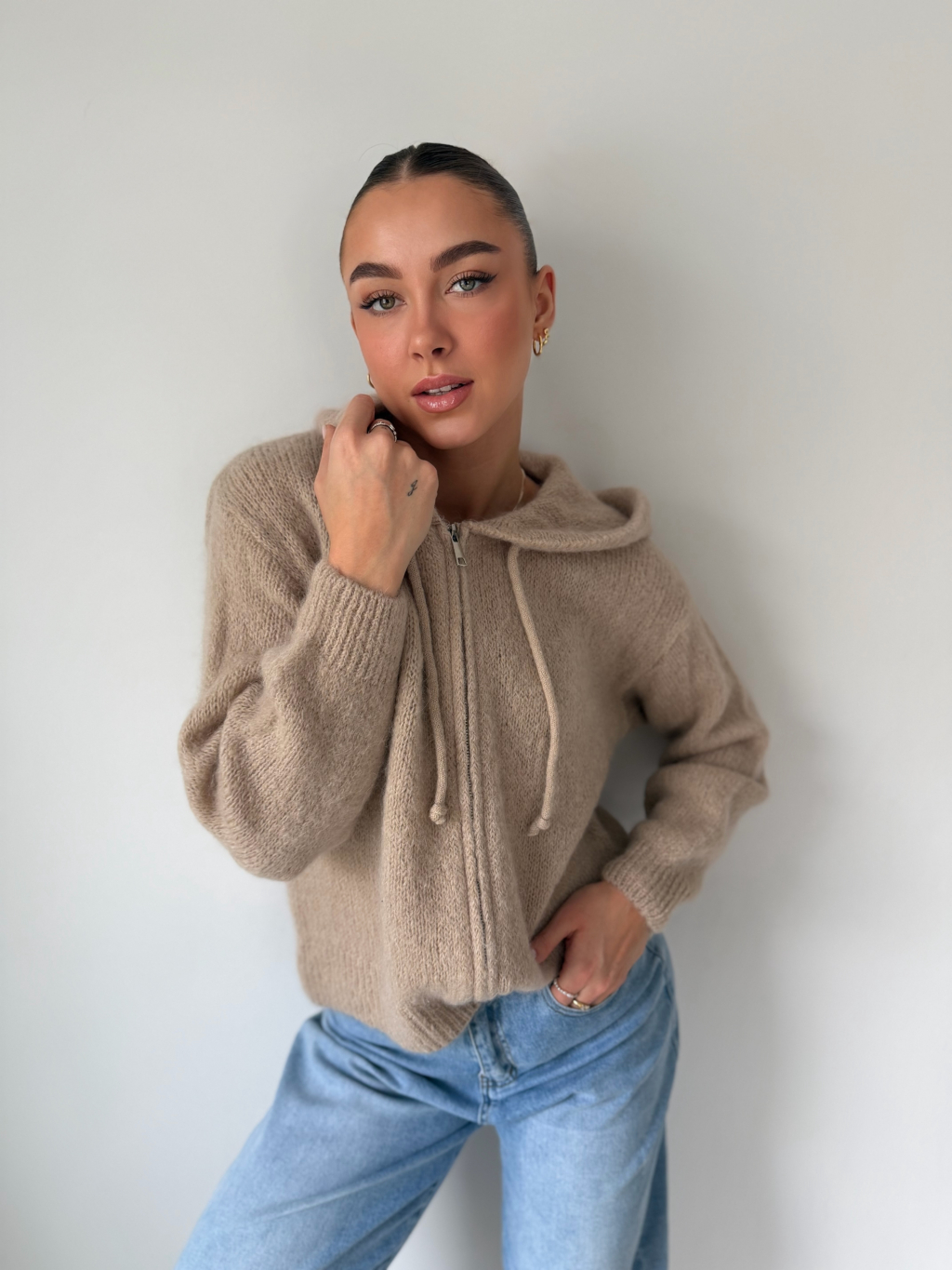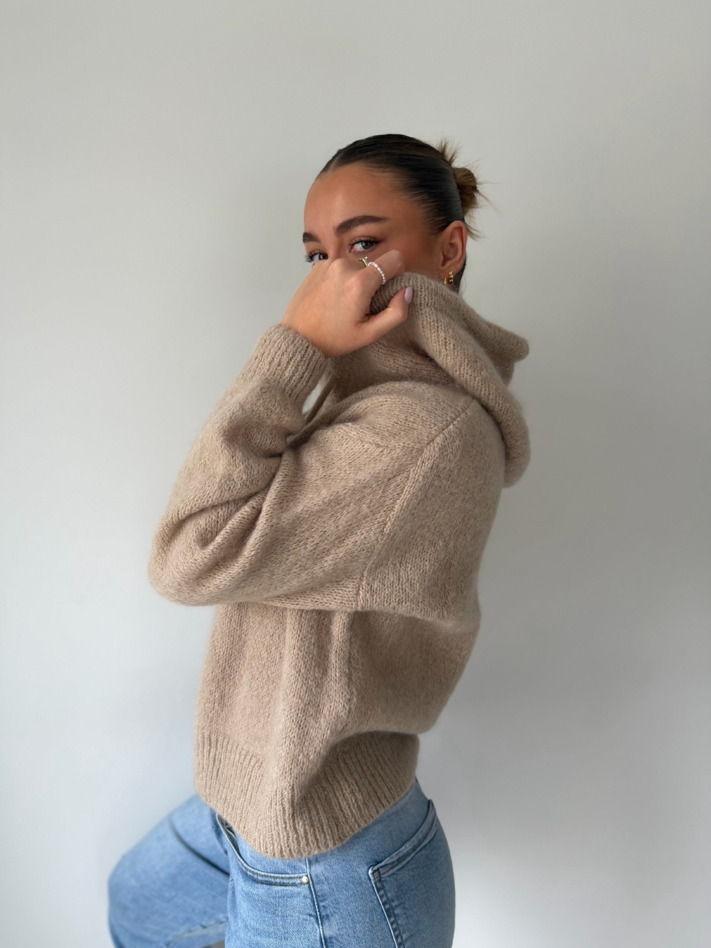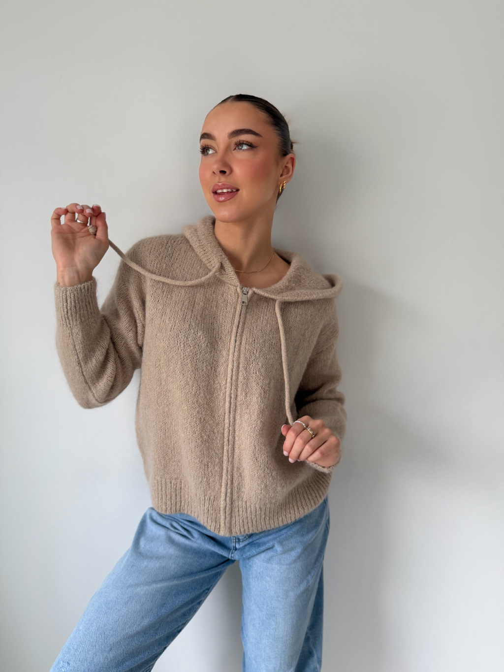Pletený mohérový svetr s kapucí. Kapuce je doplněna šňůrkami. Zapínání na zip. Bez kapes! Díky vysokému podílu mohéru je svetr lehký, hřejivý a příjemný na dotek.
