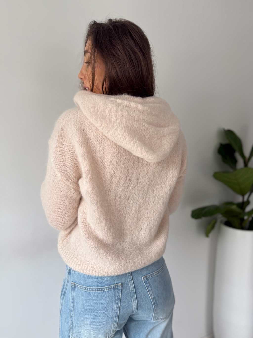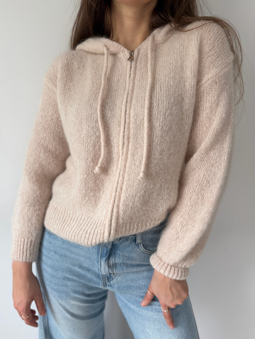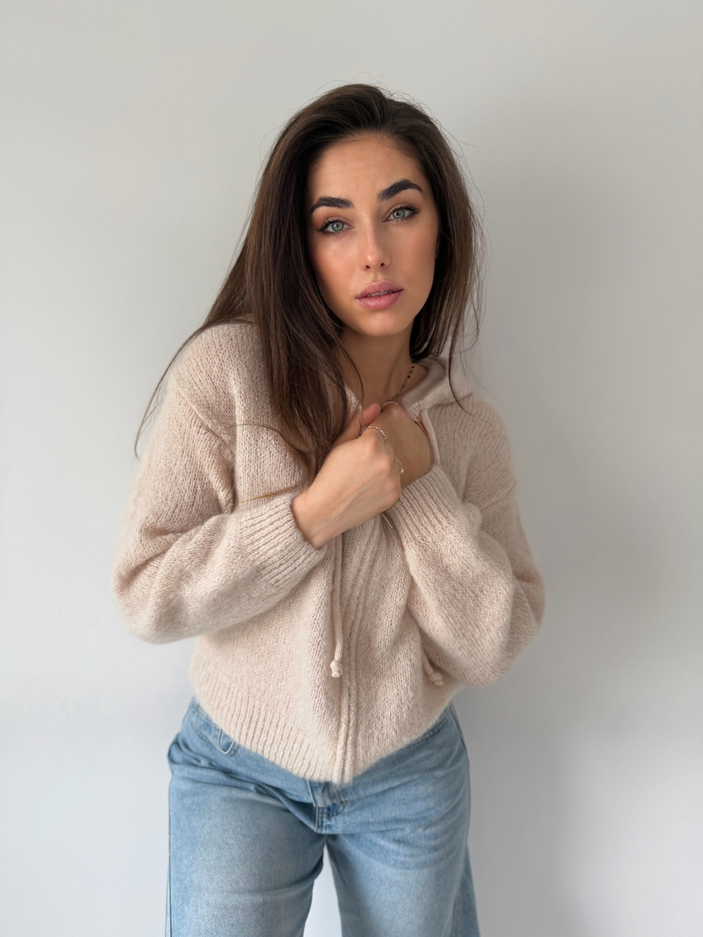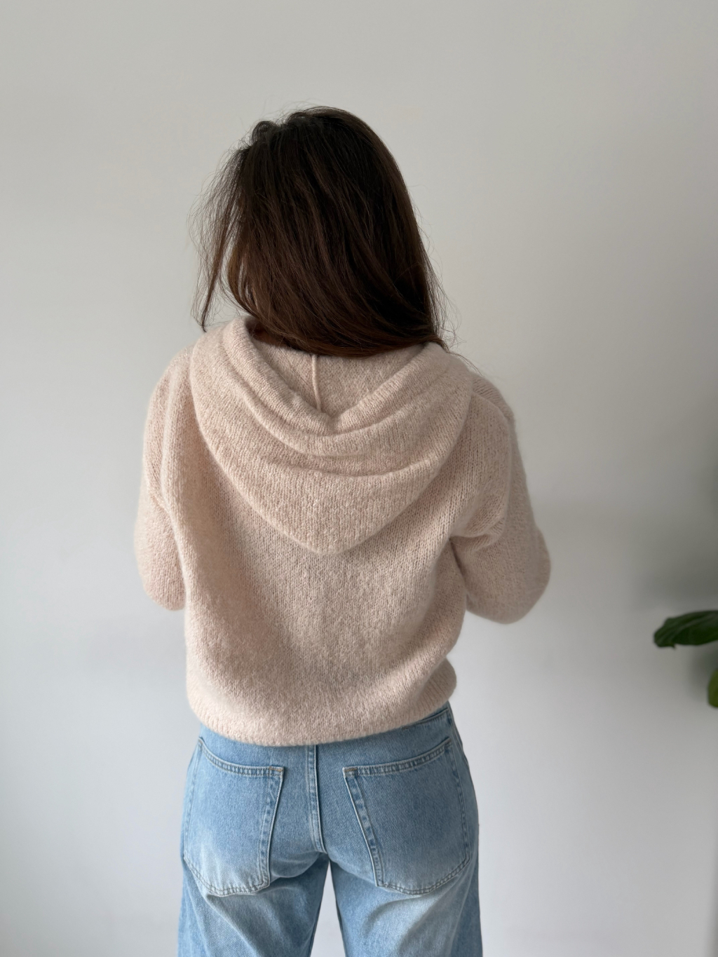 Pletený mohérový svetr s kapucí. Kapuce je doplněna šňůrkami. Zapínání na zip. Bez kapes! Díky vysokému podílu mohéru je svetr lehký, hřejivý a příjemný na dotek.