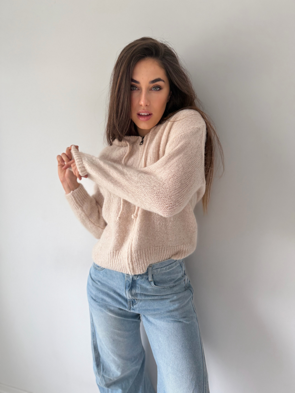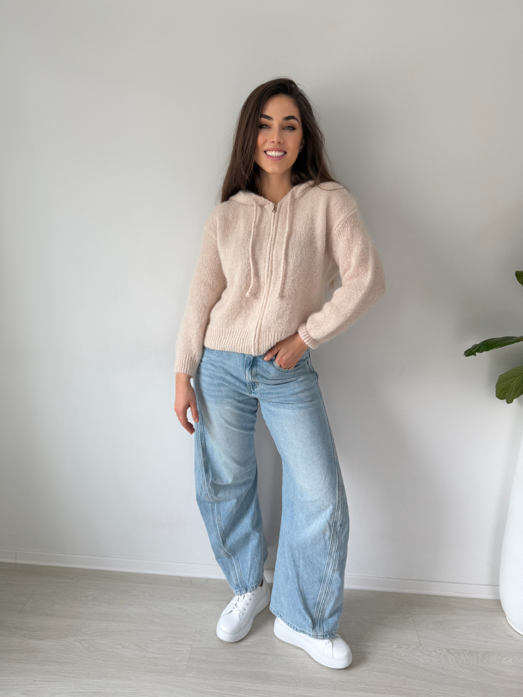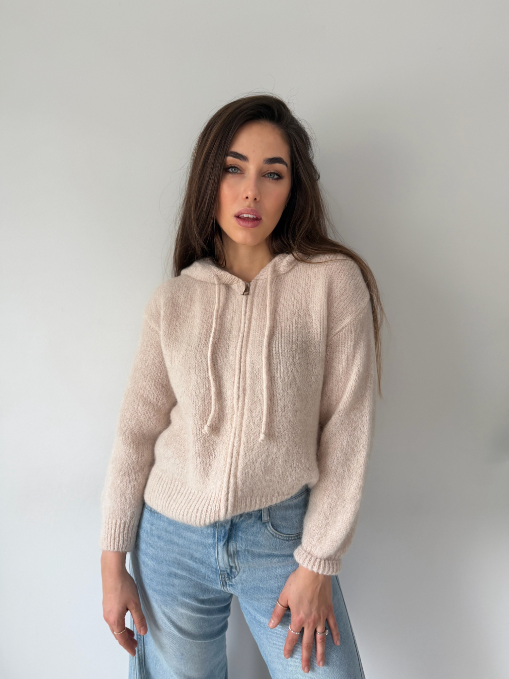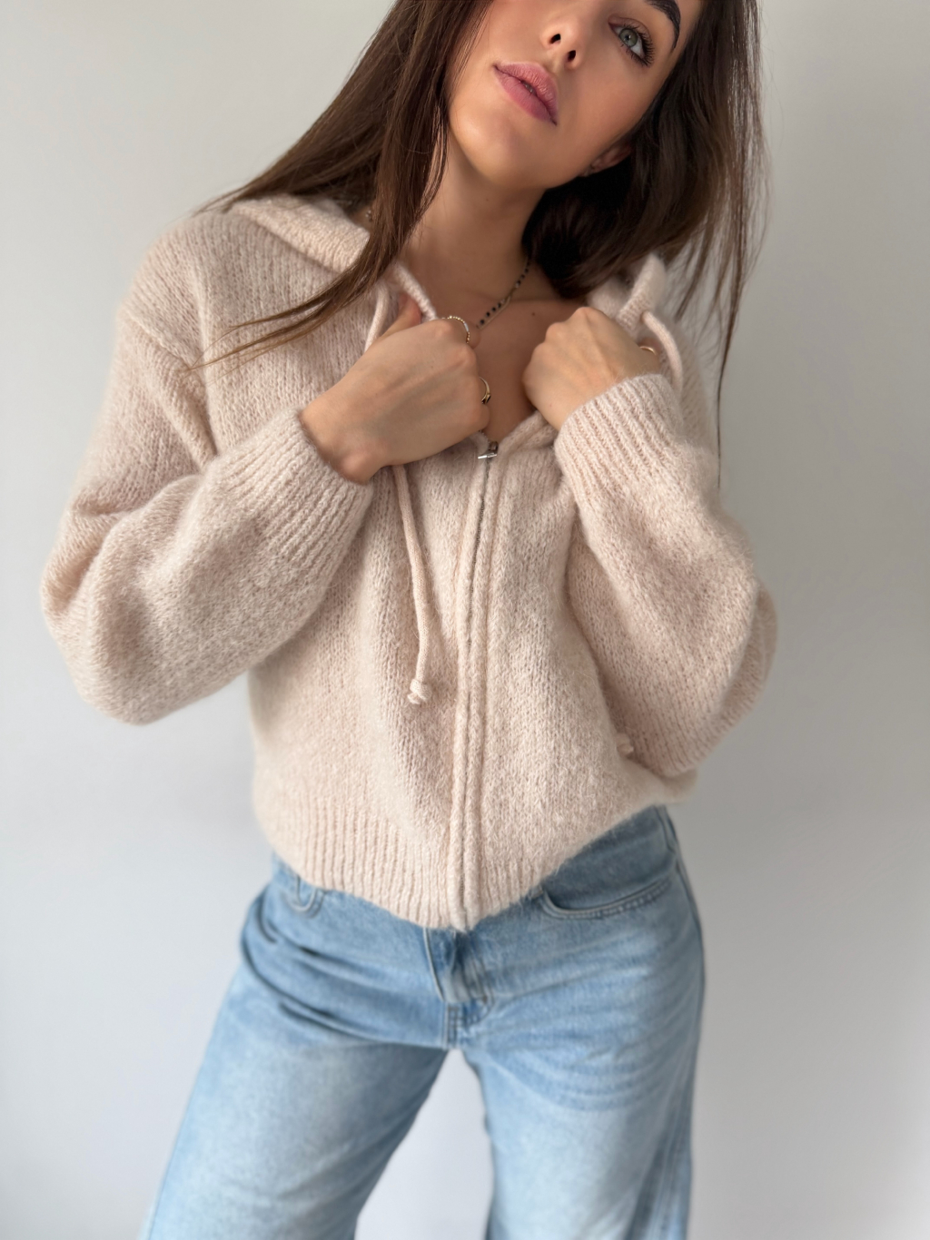 Pletený mohérový svetr s kapucí. Kapuce je doplněna šňůrkami. Zapínání na zip. Bez kapes! Díky vysokému podílu mohéru je svetr lehký, hřejivý a příjemný na dotek.