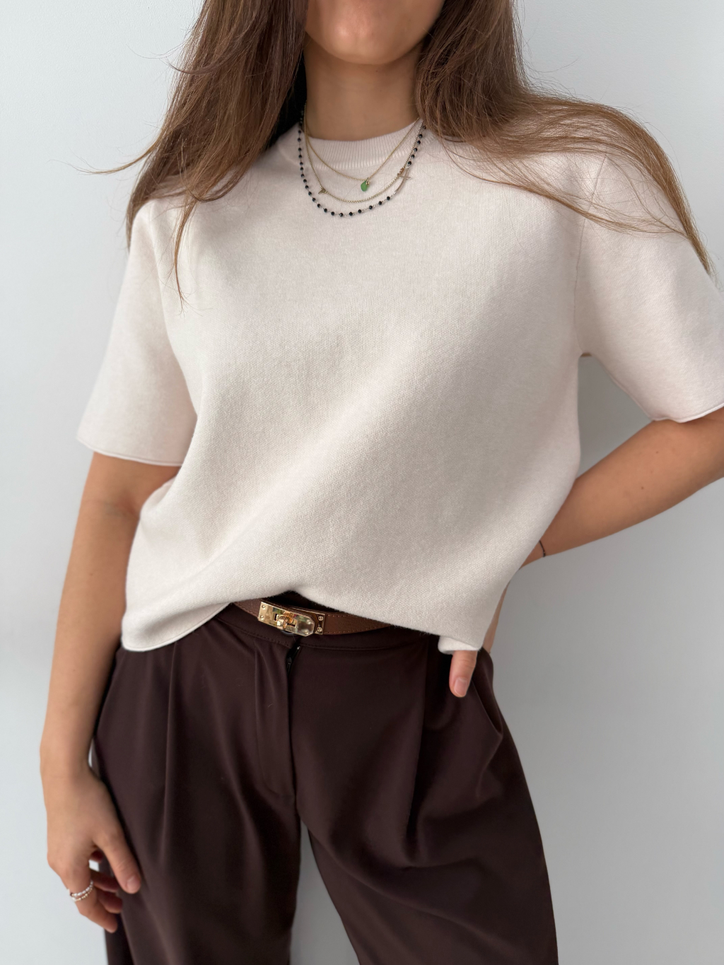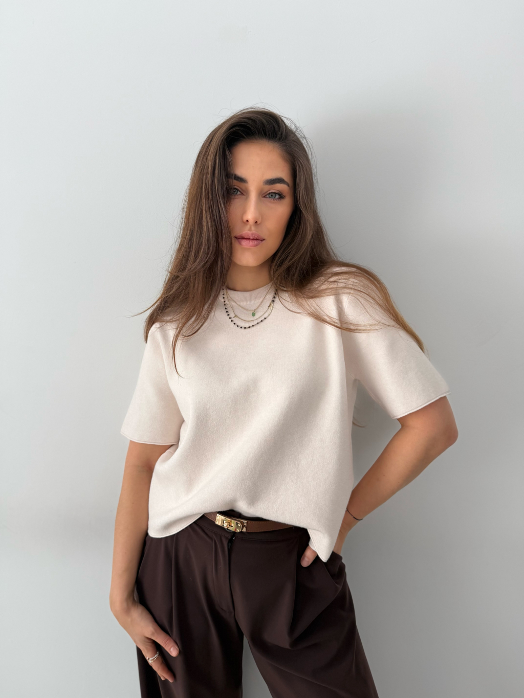 Volný svetr s krátkým rukávem. Příjemný materiál. Lehké lemování.