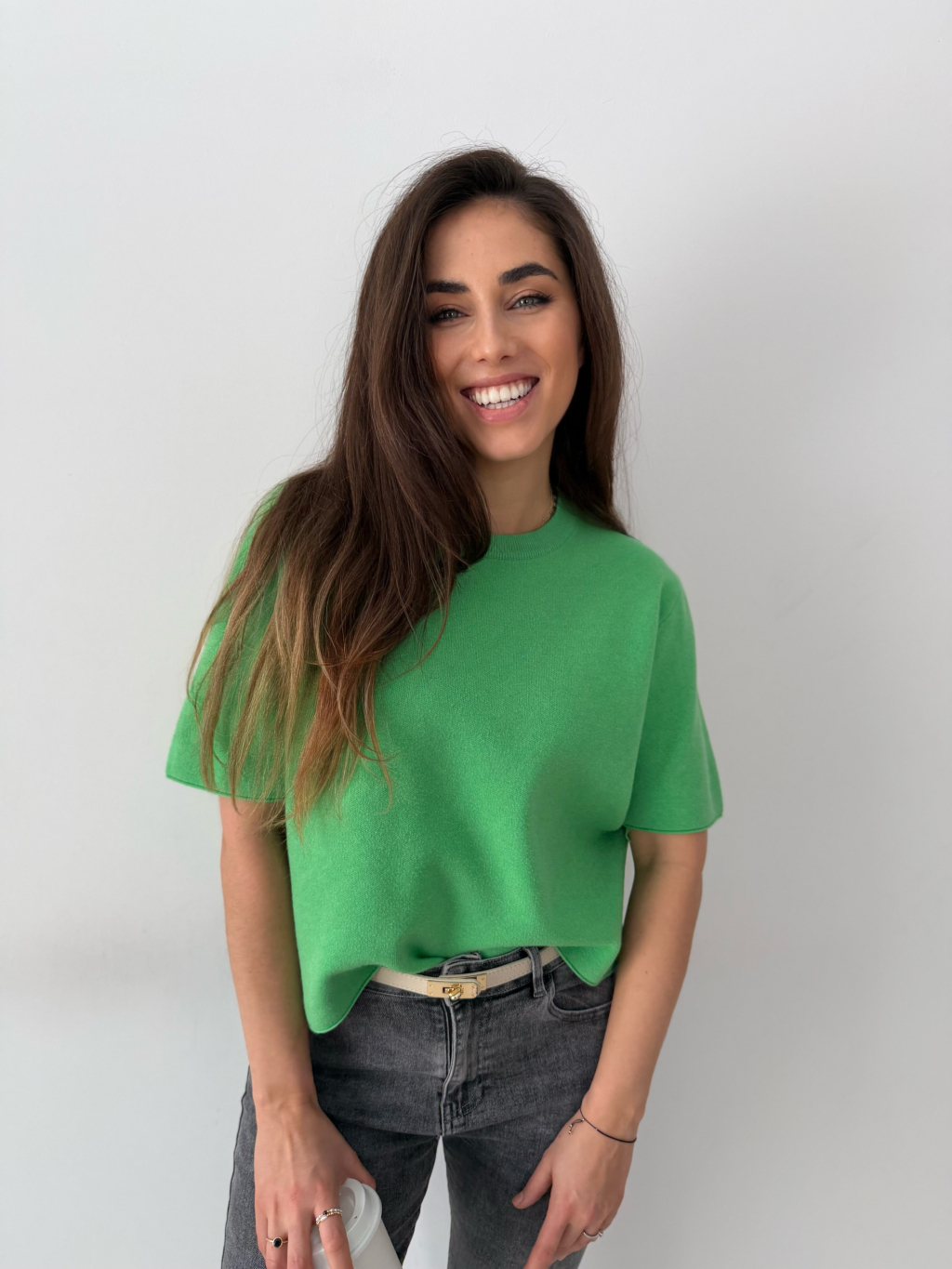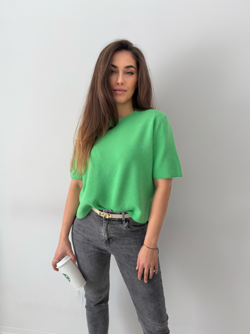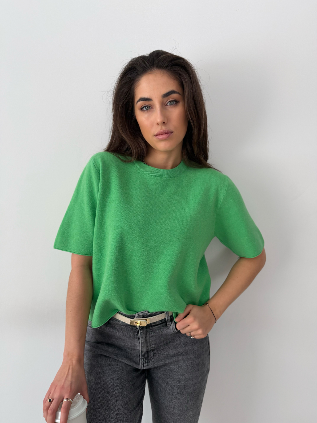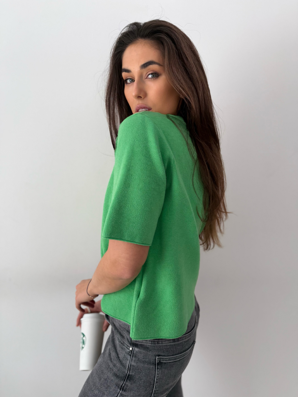 Volný svetr s krátkým rukávem. Příjemný materiál. Lehké lemování.
