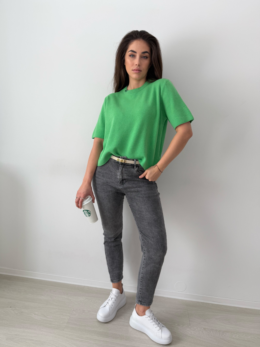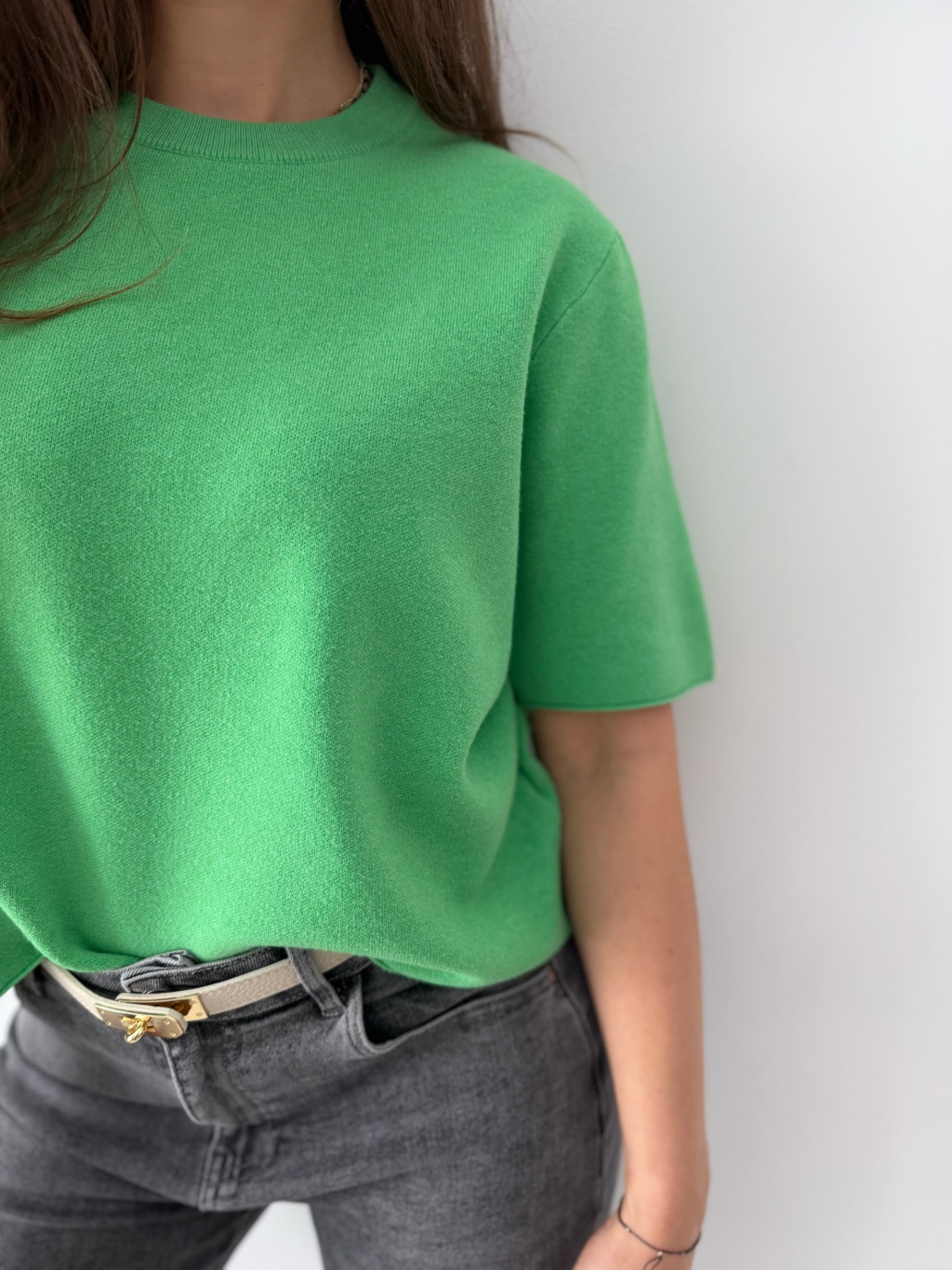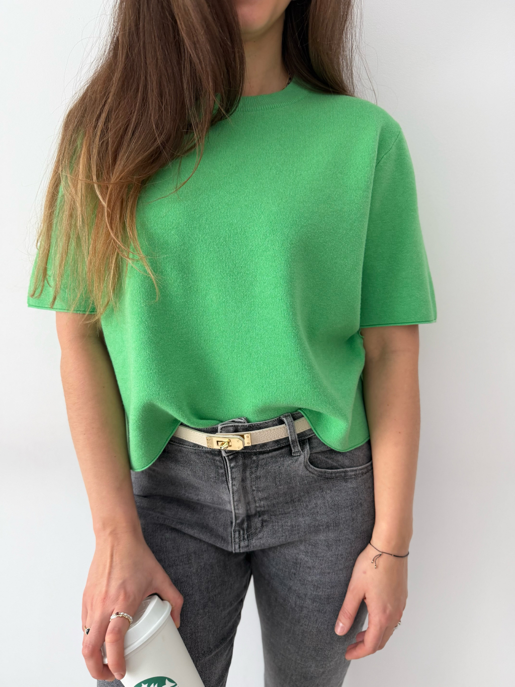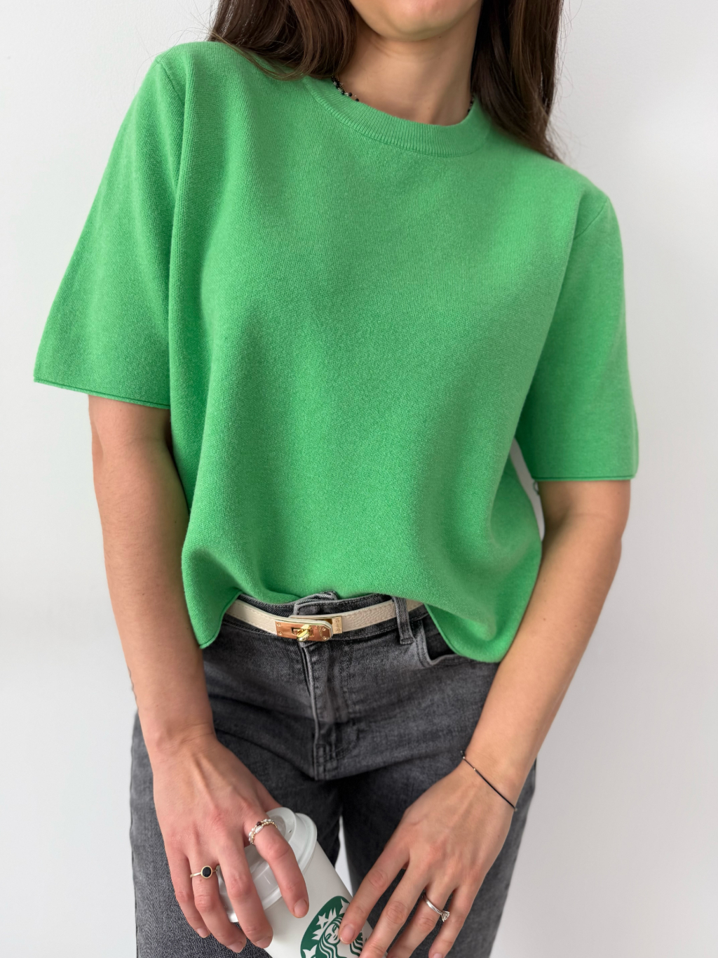 Volný svetr s krátkým rukávem. Příjemný materiál. Lehké lemování.