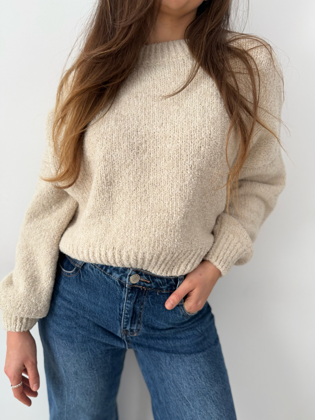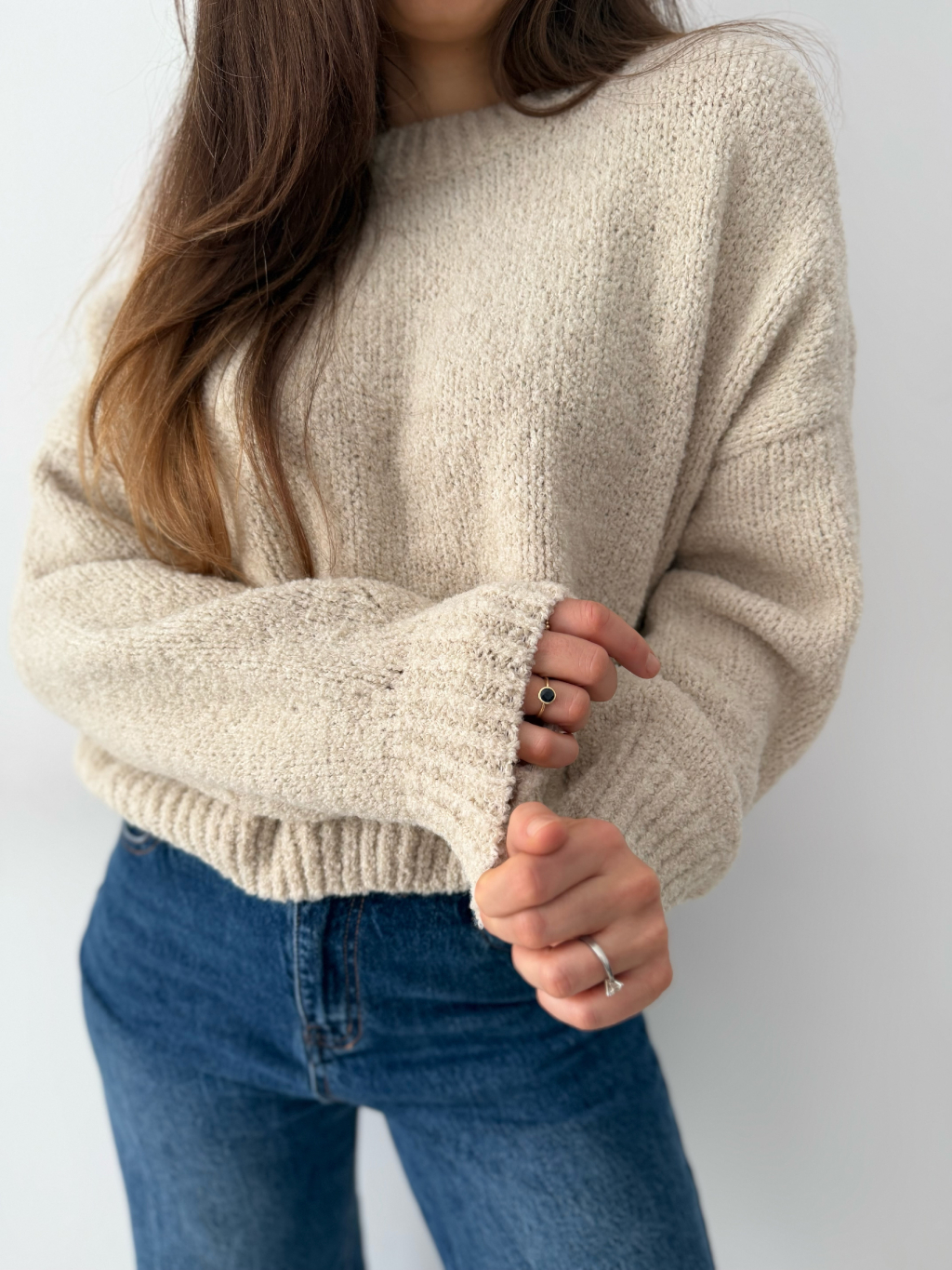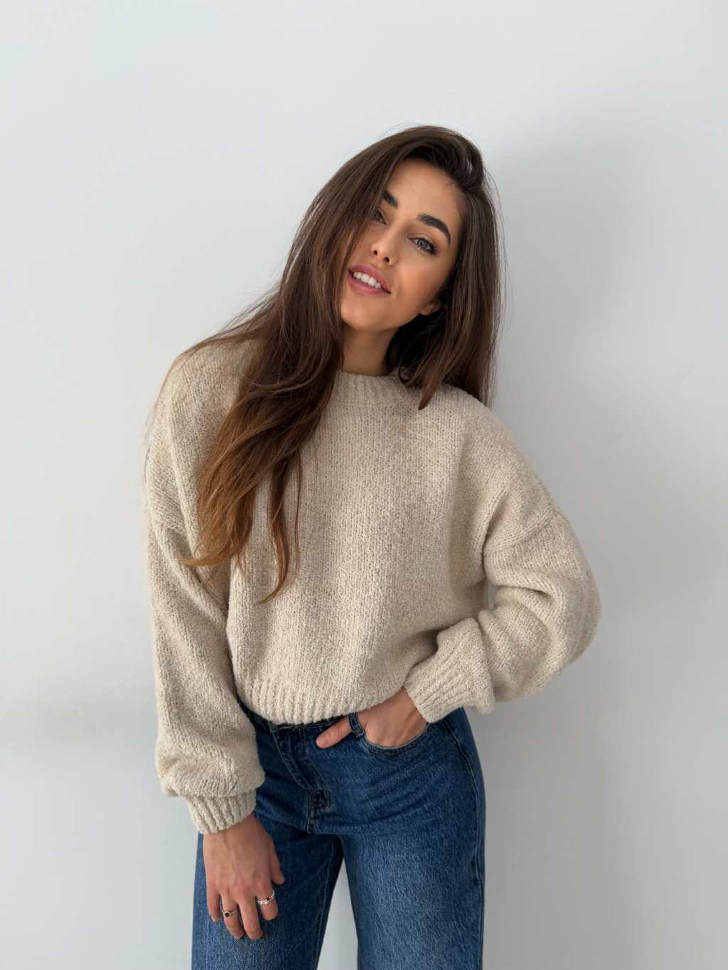 volný svetr, krátký svetr, béžový svetr