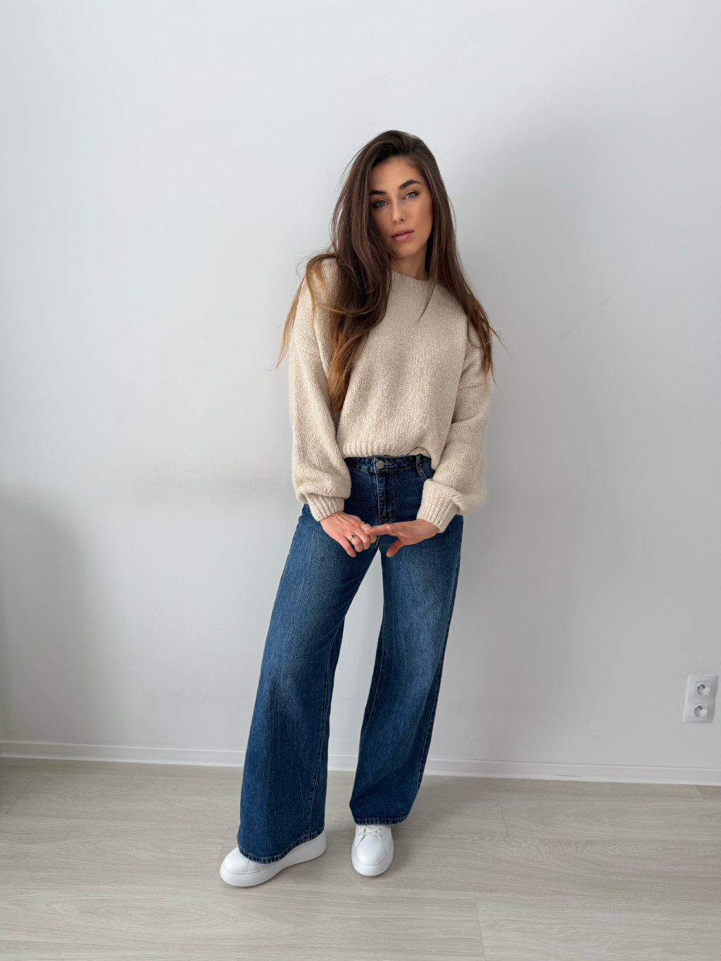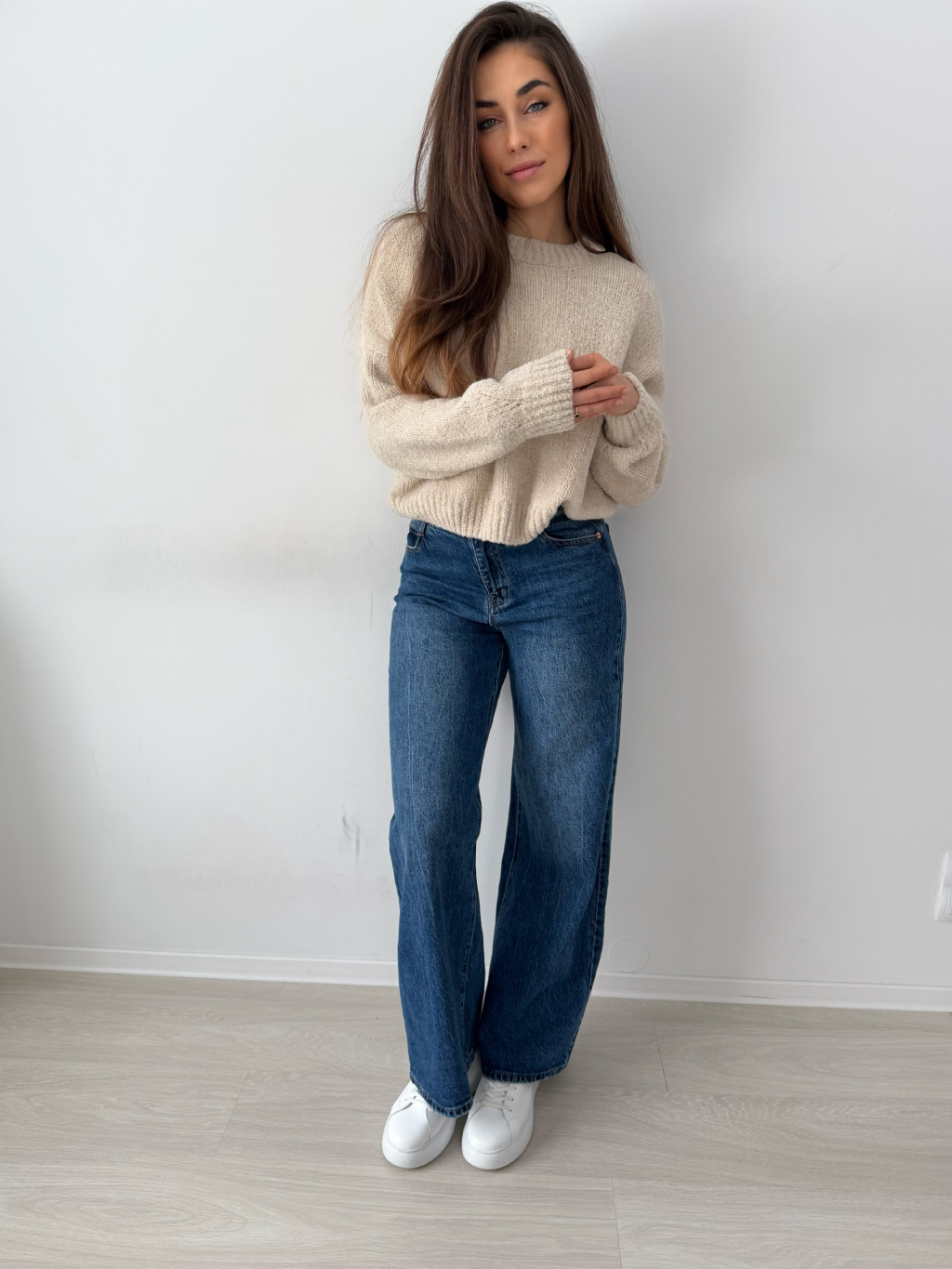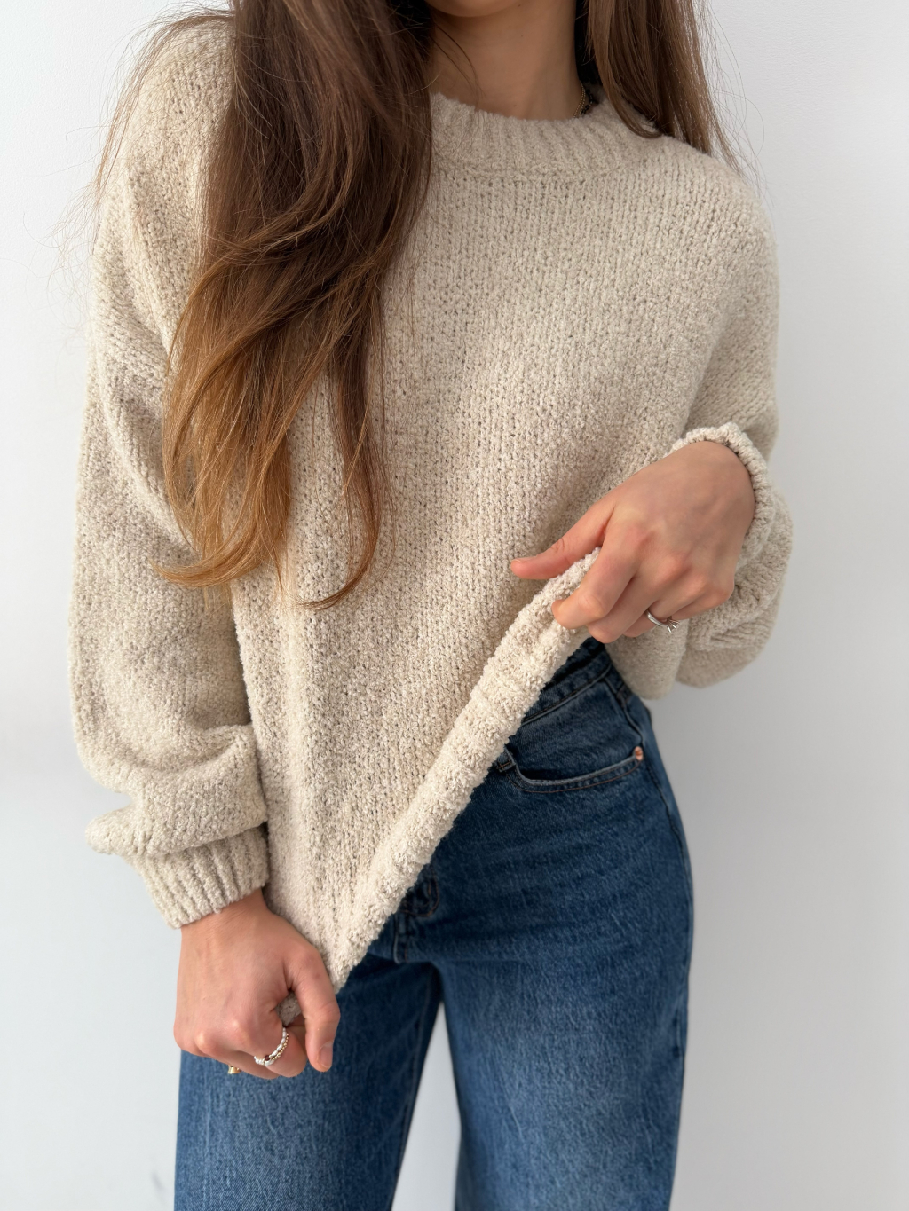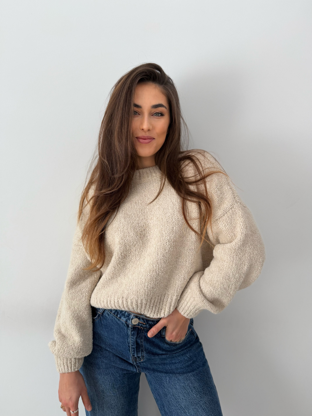 volný svetr, krátký svetr, béžový svetr