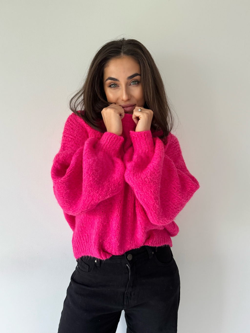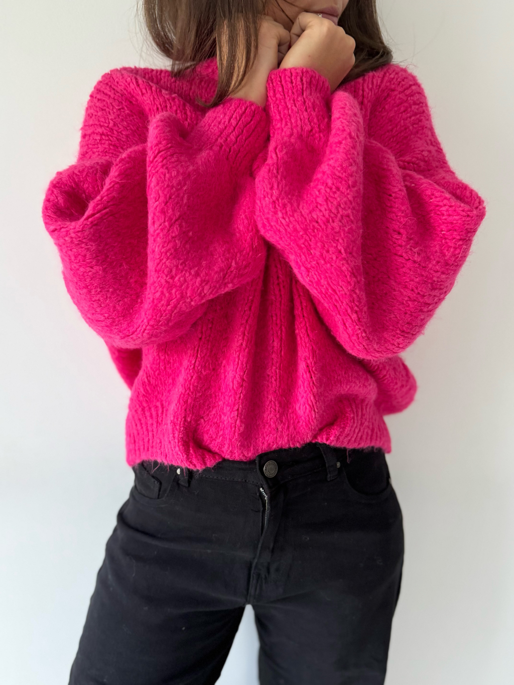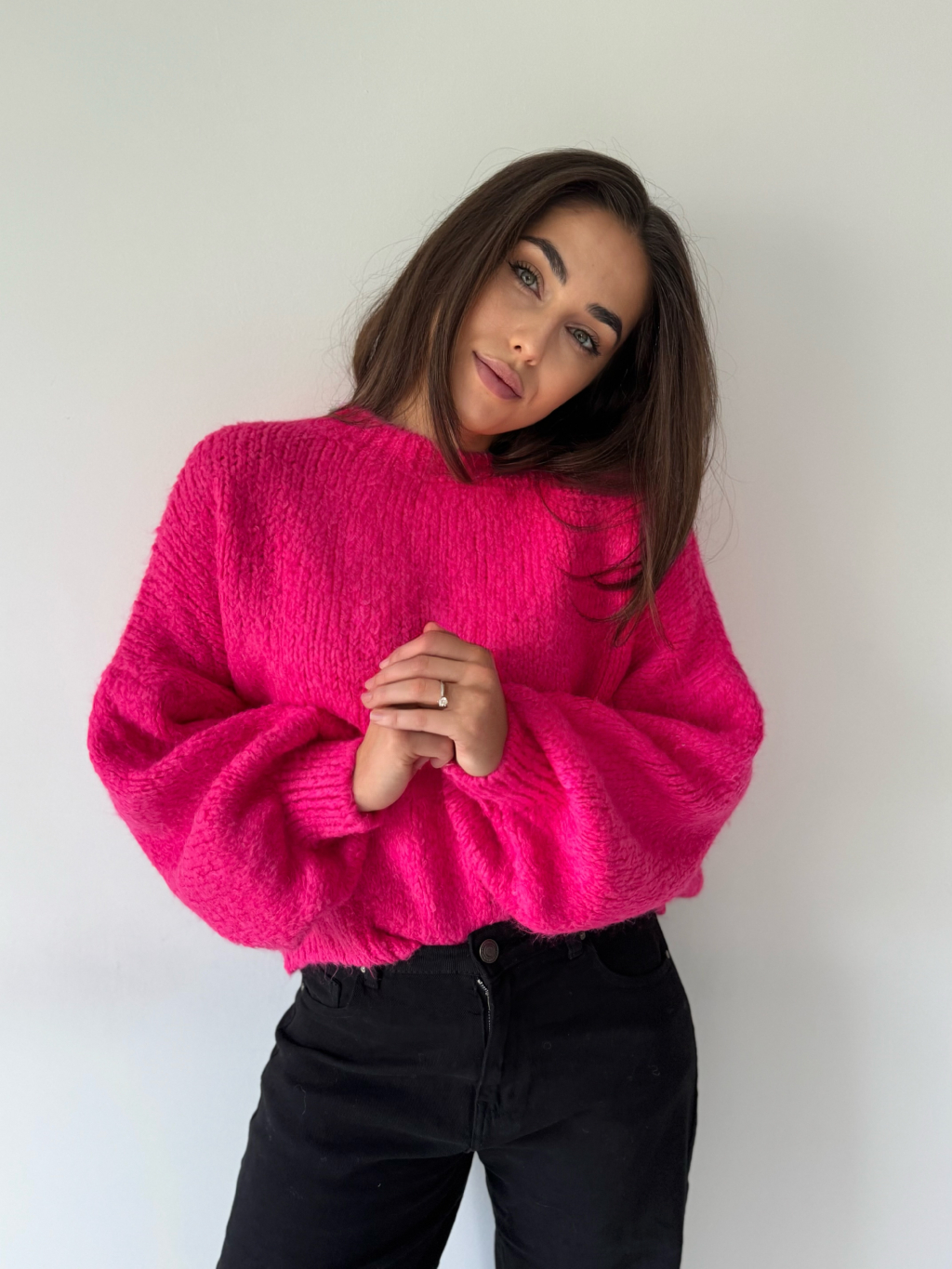 Krásný, fialový svetr s kulatým výstřihem a dlouhými rukávy, které jsou zakončeny náplety do gumičky. Svetr je zakončen žebrovaným lemem.