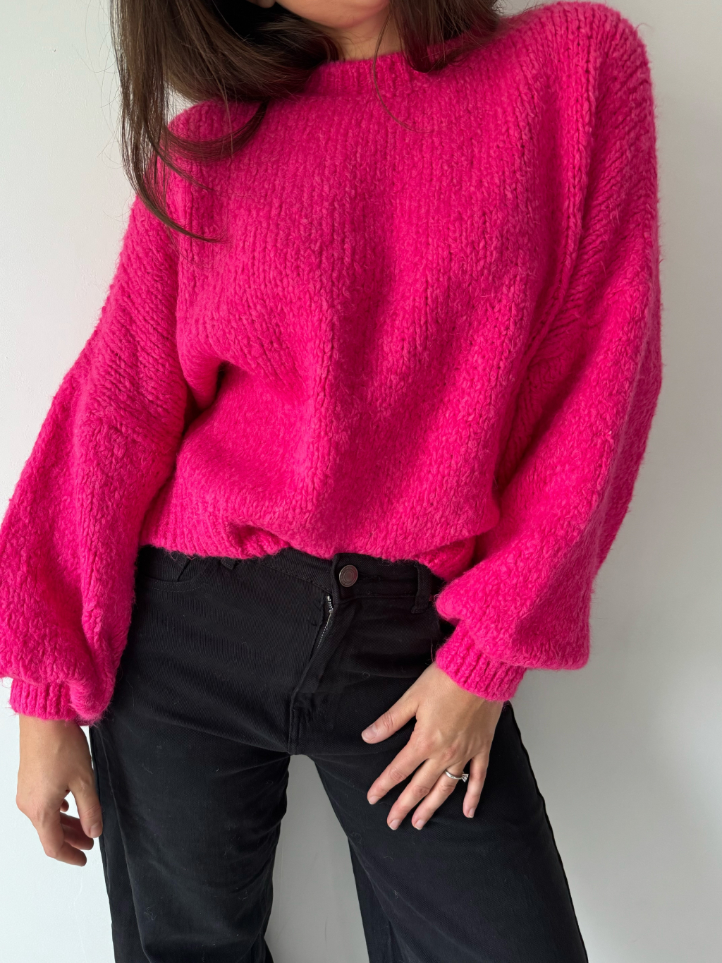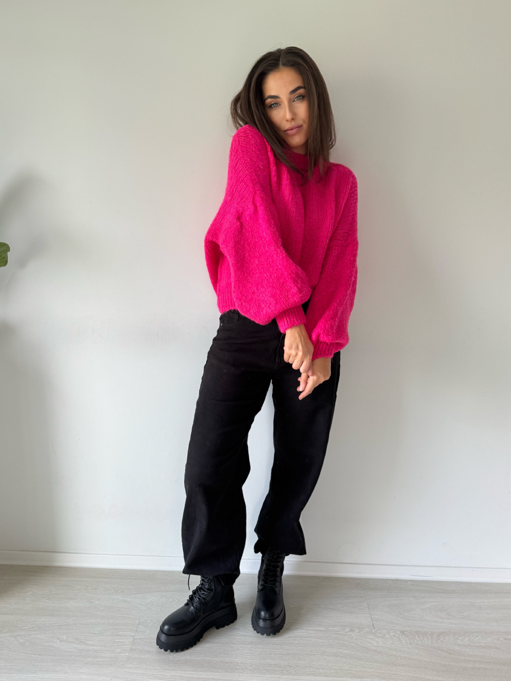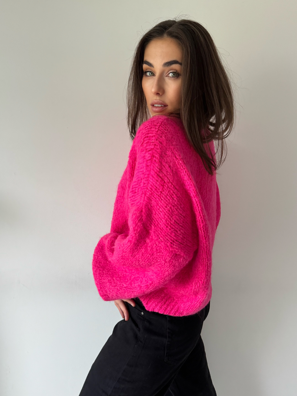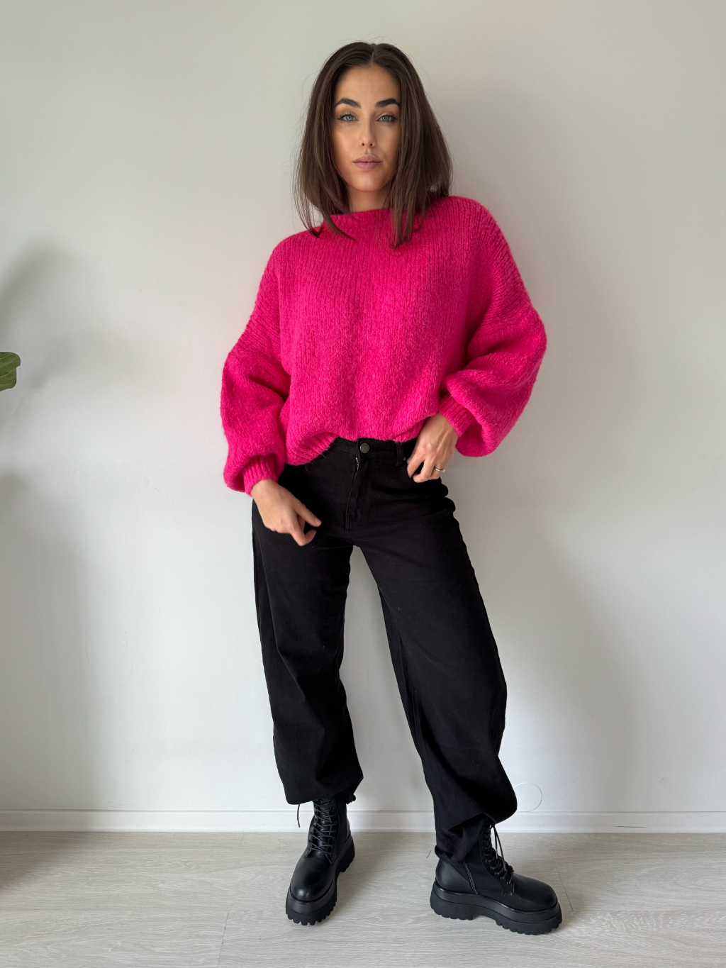 Krásný, fialový svetr s kulatým výstřihem a dlouhými rukávy, které jsou zakončeny náplety do gumičky. Svetr je zakončen žebrovaným lemem.