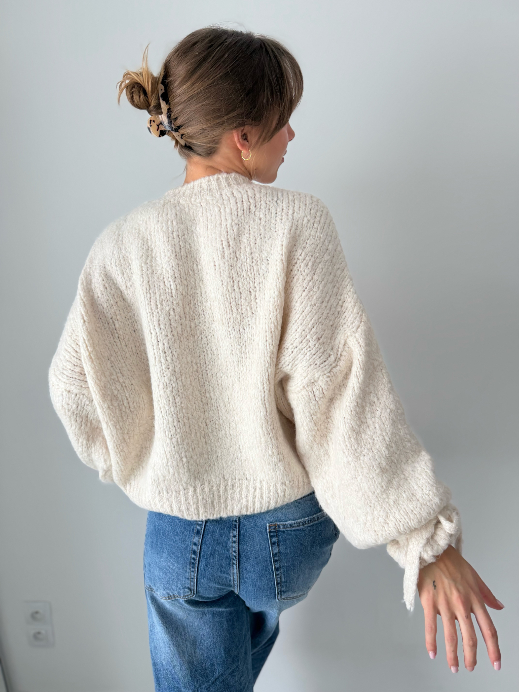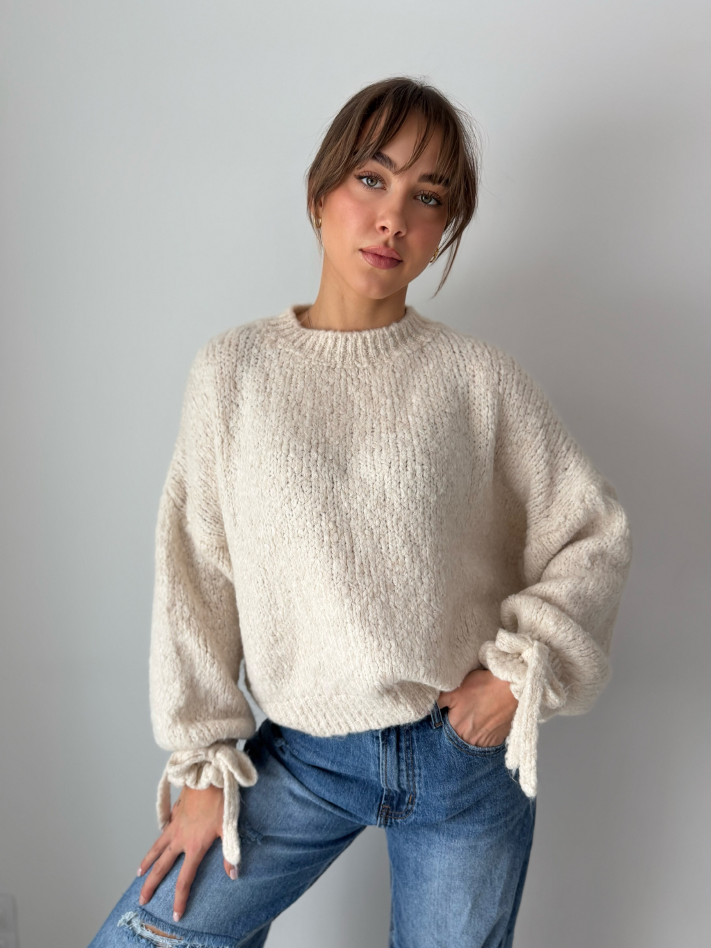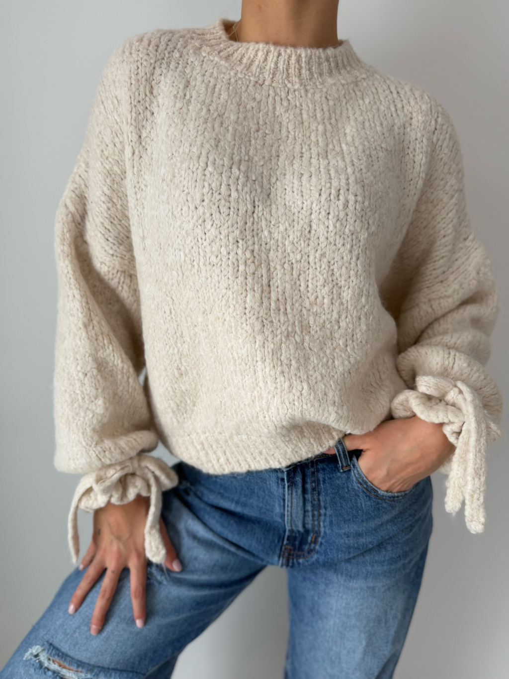 Svetr Onny s mašlí kolem zápěstí.