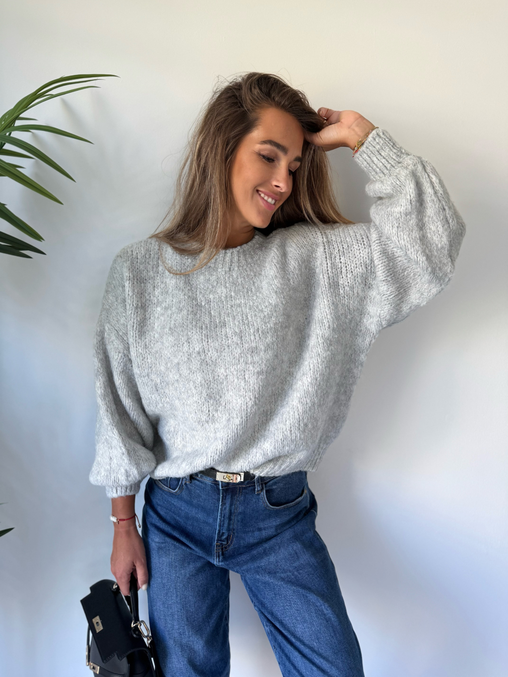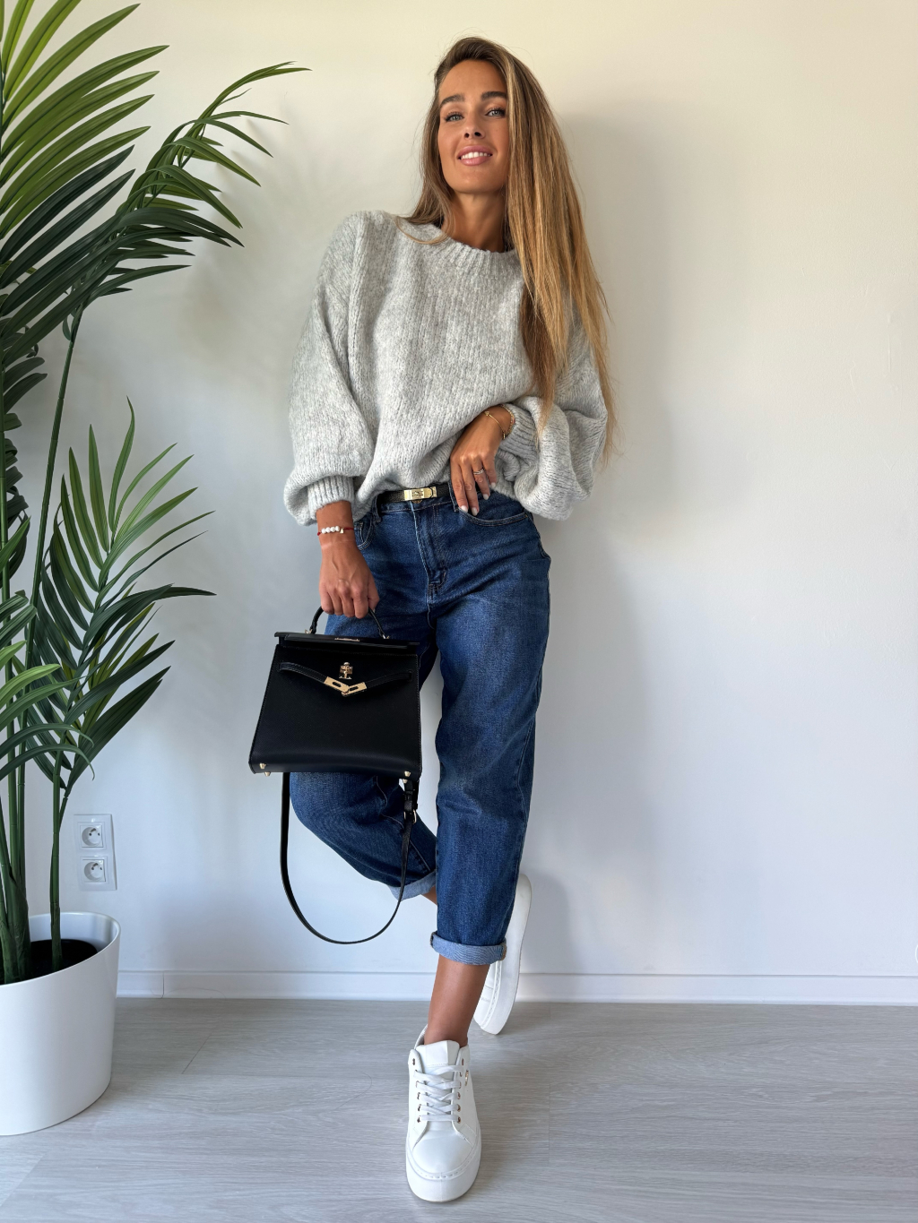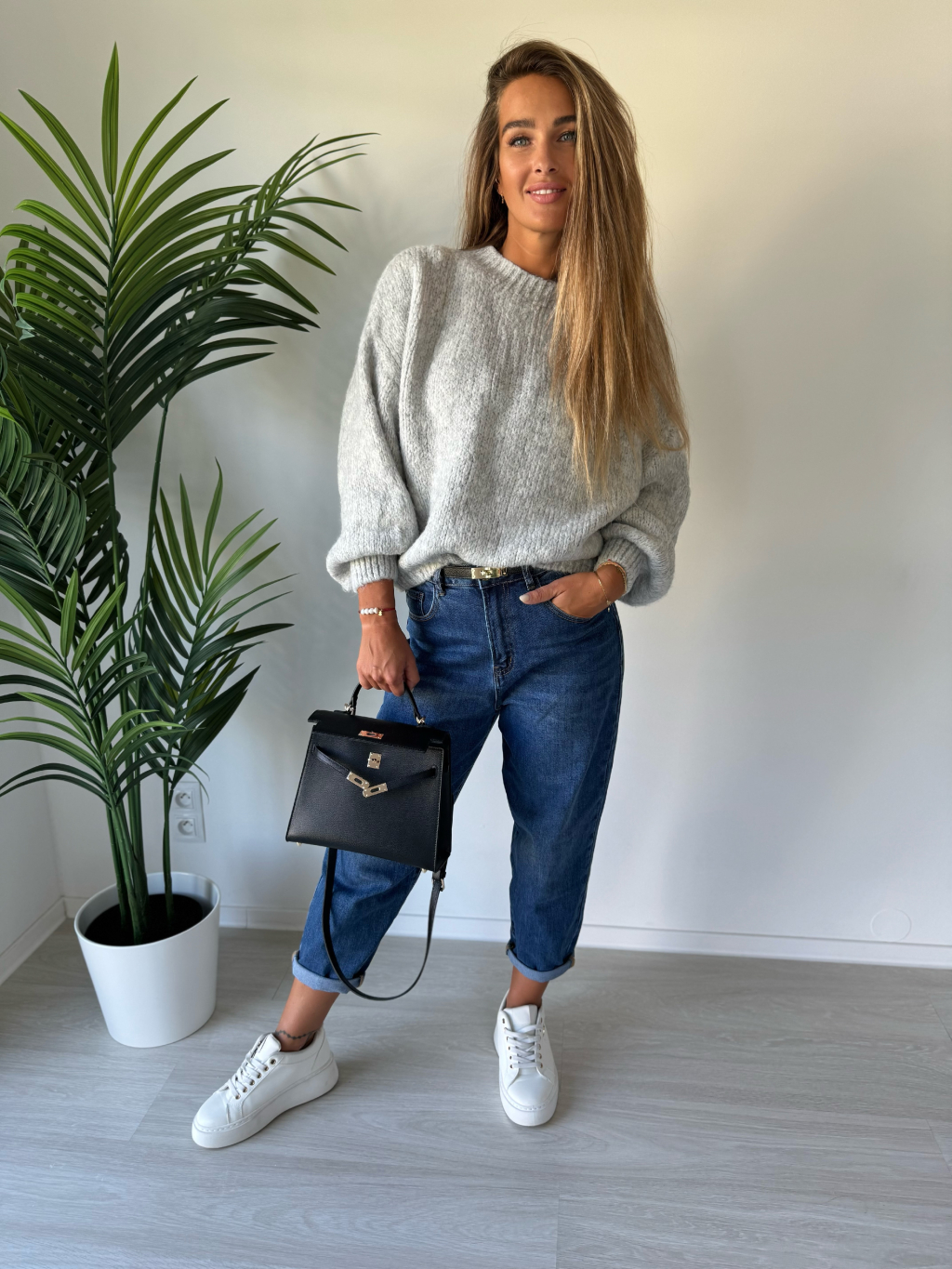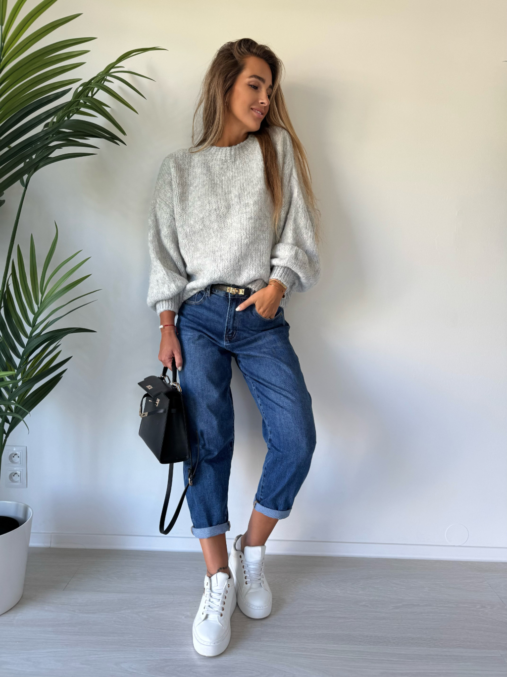 Krásný, fialový svetr s kulatým výstřihem a dlouhými rukávy, které jsou zakončeny náplety do gumičky. Svetr je zakončen žebrovaným lemem.